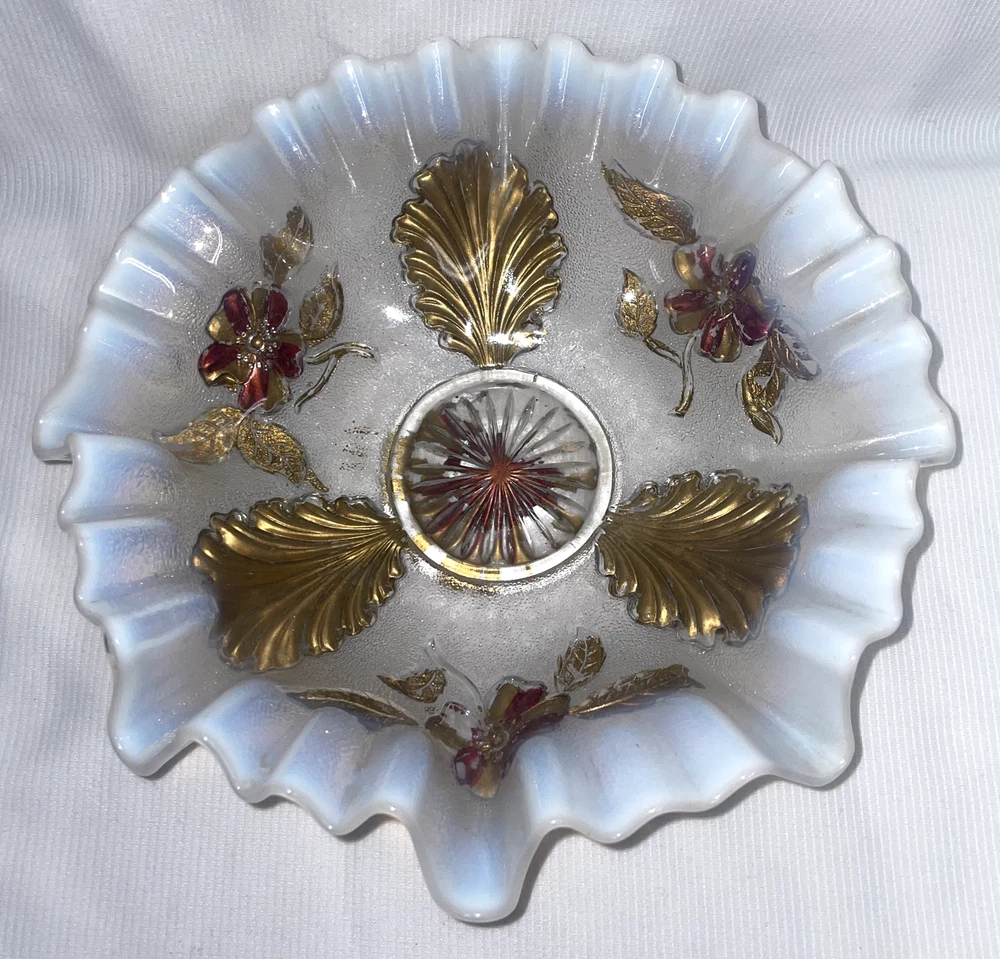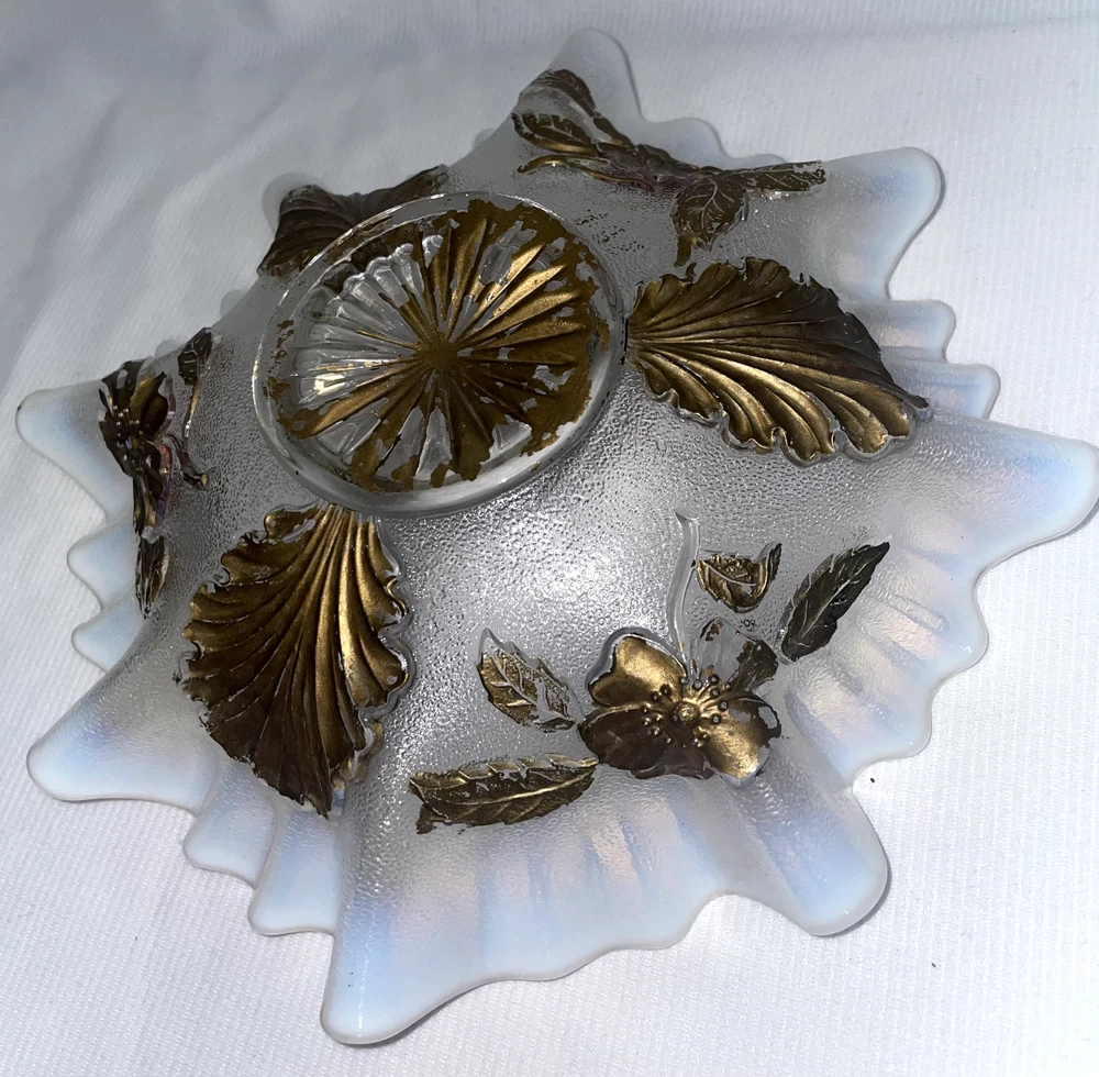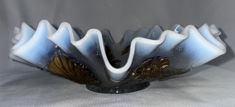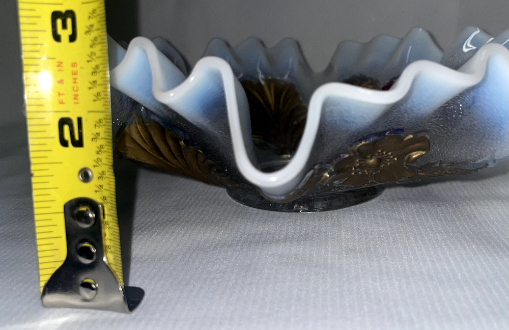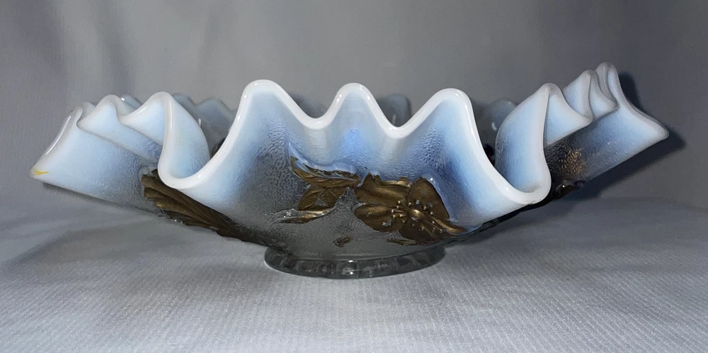 Fenton Art Glass Opalescent Ruffled Edge W/ Gold Featured Flowers And Leafs Pre -owned. Gold is flaking and peeling, should be carefully handled. No chips or cracks or rough edges. Bowl measures 8.5 inches edge to edge x 2.5 inches high. Please hand wash only. Great display item. ATTENTION REGARDING SHIPPING !! Shipping costs are expensive. Here is an offer that is hard to refuse. If you buy 2 or more items totaling $50 or more , I will handle the shipping cost (ground) anywhere in the continental United States. The items cannot be listed as having to be shipped alone due to SPECIAL PACKING NEEDS . eBay does not adjust the shipping cost removal from the invoice automatically. I can do it on the final invoice after you have the items in your shopping basket, before you pay. If eBay forces payment before that is done, you will receive a refund of shipping cost made before your package is shipped within the first business day following the transaction. The free shipping offer does not apply to Priority or Expedited shipping, although we can discuss a fair reduction in shipping cost should you desire the shipping upgrade. SAVE SHIPPING COSTS! – USE COMBINED SHIPPING Shipping costs are high. The best way to save money on shipping costs is through combined shipping,… purchasing more than 1 item and having them shipped together. The cost per item drops substantially. To do this you MUST NOT pay for items until after the combined shipping cost has been calculated on the invoice. If you pay before this has been done you will end up paying the individual shipping cost for each item, and I am unable to issue refunds for shipping overpayments when this occurs because eBay does not refund the fees they charge me on the refunded amount. LOOKING FOR LESS EXPENSIVE SHIPPING? Click on "See details" next to Expedited Shipping Fee above to see other shipping options. eBay calculates the shipping fee based on package size, weight and type of shipping you select. SOME ITEMS CANNOT BE COMBINED WITH OTHER ITEMS DUE TO UNIQUE PACKAGING CHARACTERISTICS. THERE WILL BE A NOTE IN THE LISTING WHEN COMBINED SHIPPING CANNOT BE USED.