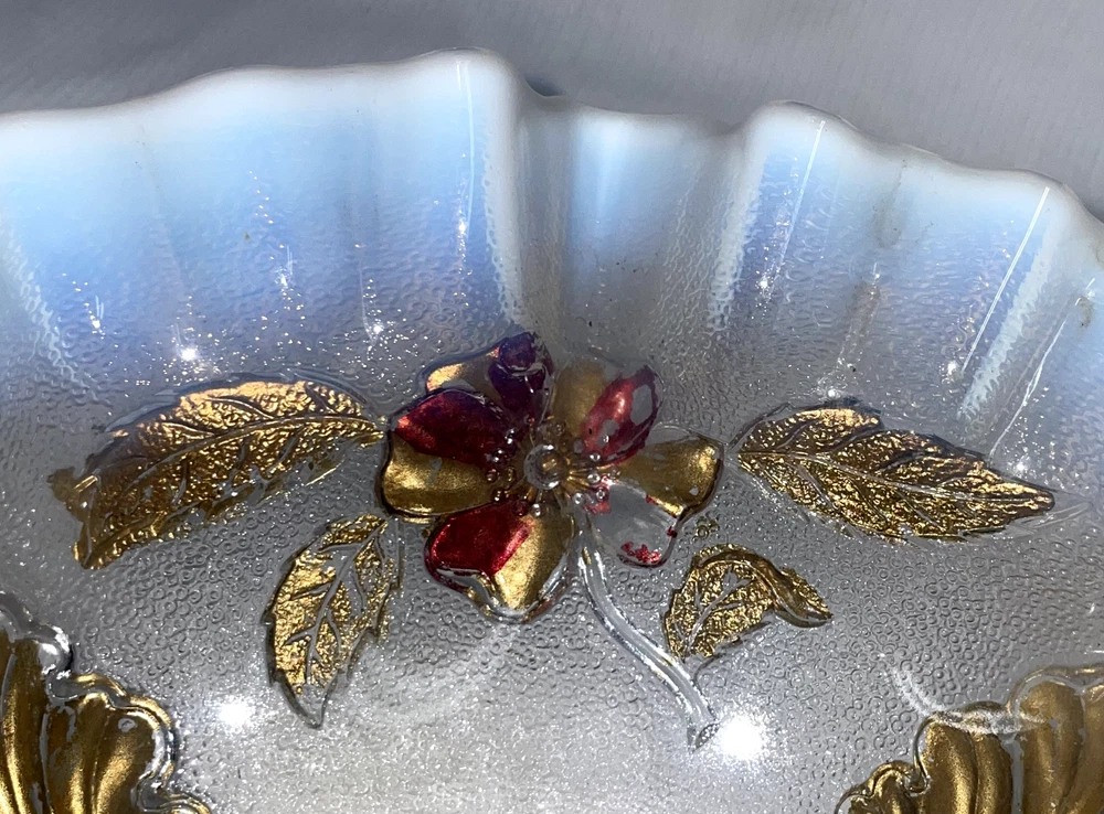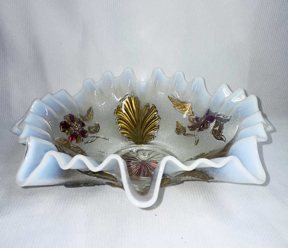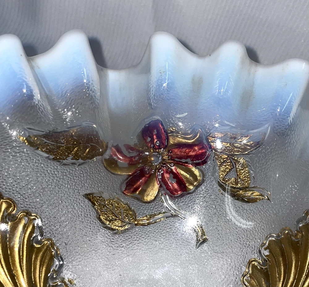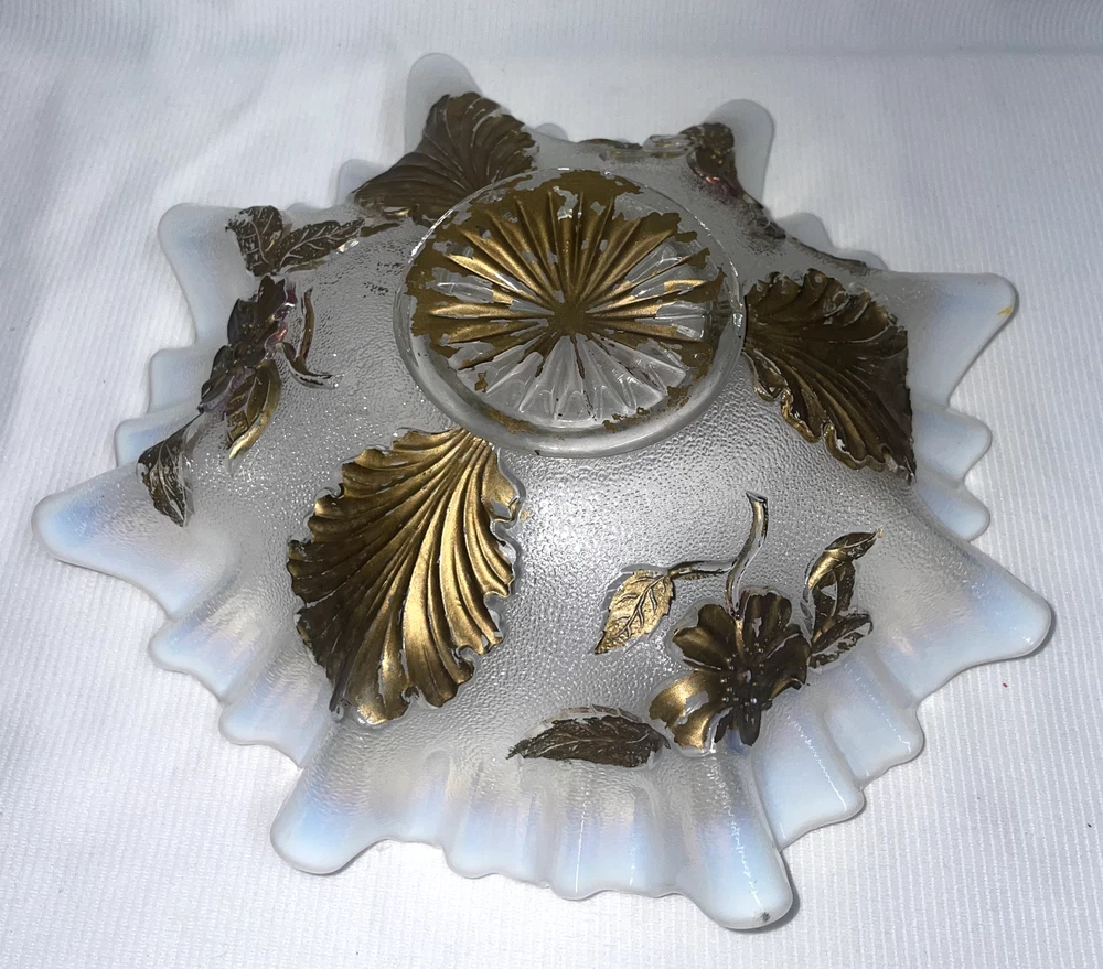 Fenton Art Glass Opalescent Ruffled Edge W/ Gold Featured Flowers And Leafs Pre -owned. Gold is flaking and peeling, should be carefully handled. No chips or cracks or rough edges. Bowl measures 8.5 inches edge to edge x 2.5 inches high. Please hand wash only. Great display item. ATTENTION REGARDING SHIPPING !! Shipping costs are expensive. Here is an offer that is hard to refuse. If you buy 2 or more items totaling $50 or more , I will handle the shipping cost (ground) anywhere in the continental United States. The items cannot be listed as having to be shipped alone due to SPECIAL PACKING NEEDS . eBay does not adjust the shipping cost removal from the invoice automatically. I can do it on the final invoice after you have the items in your shopping basket, before you pay. If eBay forces payment before that is done, you will receive a refund of shipping cost made before your package is shipped within the first business day following the transaction. The free shipping offer does not apply to Priority or Expedited shipping, although we can discuss a fair reduction in shipping cost should you desire the shipping upgrade. SAVE SHIPPING COSTS! – USE COMBINED SHIPPING Shipping costs are high. The best way to save money on shipping costs is through combined shipping,… purchasing more than 1 item and having them shipped together. The cost per item drops substantially. To do this you MUST NOT pay for items until after the combined shipping cost has been calculated on the invoice. If you pay before this has been done you will end up paying the individual shipping cost for each item, and I am unable to issue refunds for shipping overpayments when this occurs because eBay does not refund the fees they charge me on the refunded amount. LOOKING FOR LESS EXPENSIVE SHIPPING? Click on "See details" next to Expedited Shipping Fee above to see other shipping options. eBay calculates the shipping fee based on package size, weight and type of shipping you select. SOME ITEMS CANNOT BE COMBINED WITH OTHER ITEMS DUE TO UNIQUE PACKAGING CHARACTERISTICS. THERE WILL BE A NOTE IN THE LISTING WHEN COMBINED SHIPPING CANNOT BE USED.