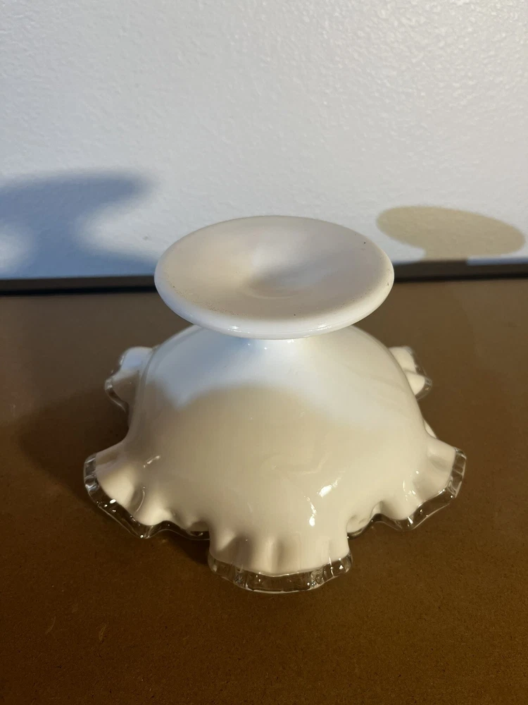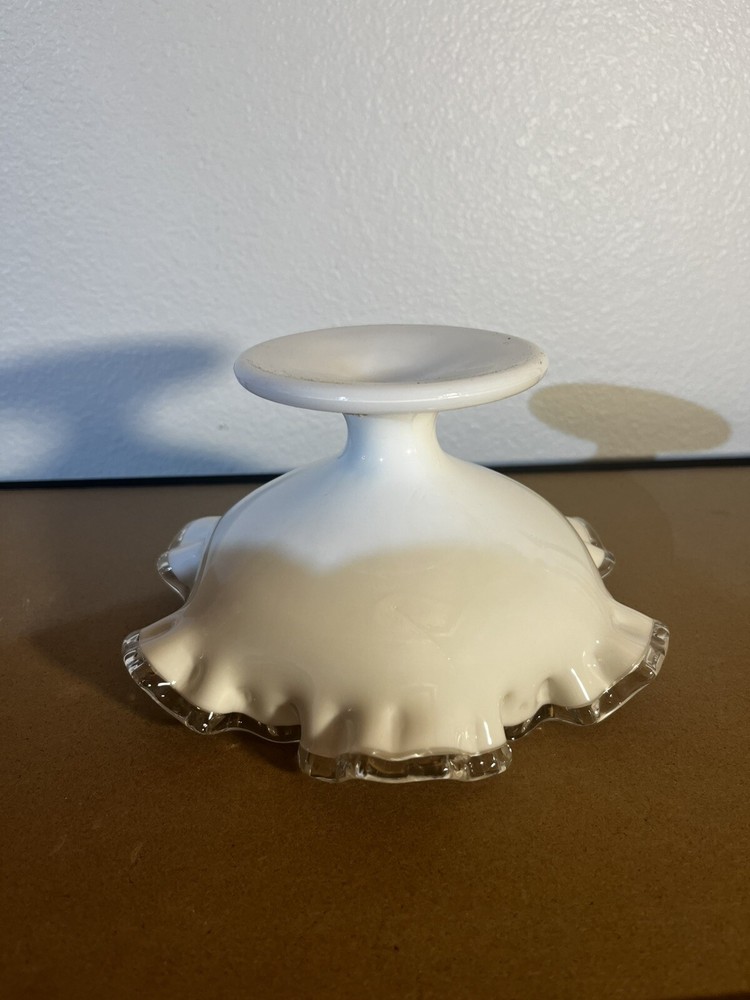 Vintage Fenton Glass Silvercrest Crimped Ribbon Edge Pedestal Bowl Vase is a decorative Mid-Century Modern piece from the 1960s. This white milk glass vase features a crimped ribbon edge design, suitable for display. Made by Fenton in the United States, this glass bowl exudes elegance and charm, perfect for adding a touch of vintage flair to any space.