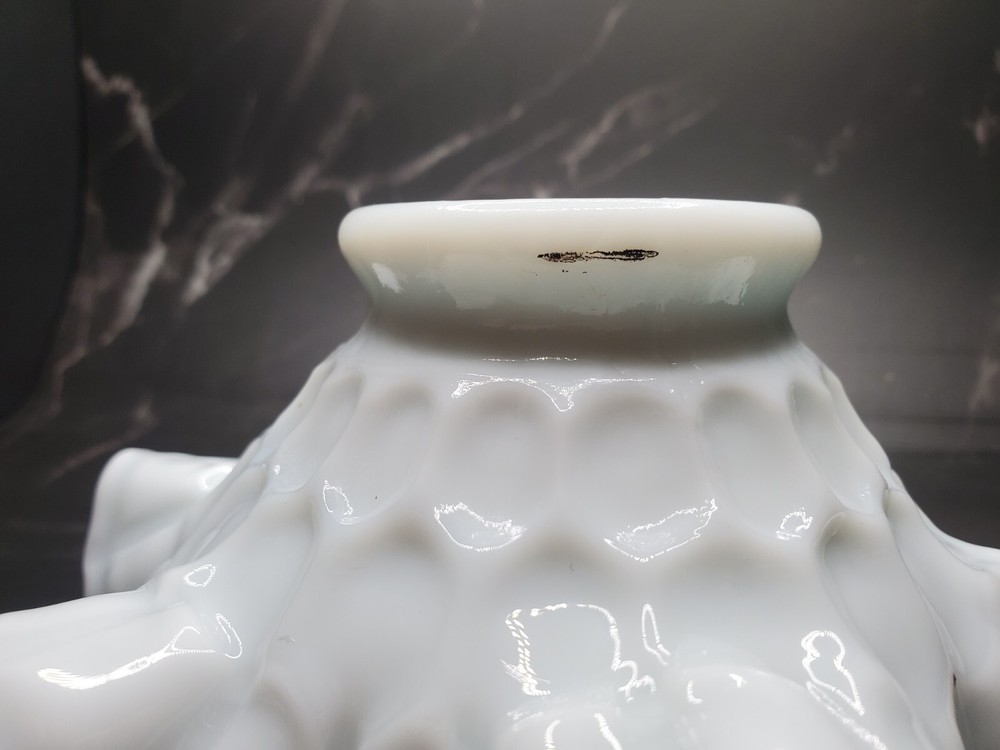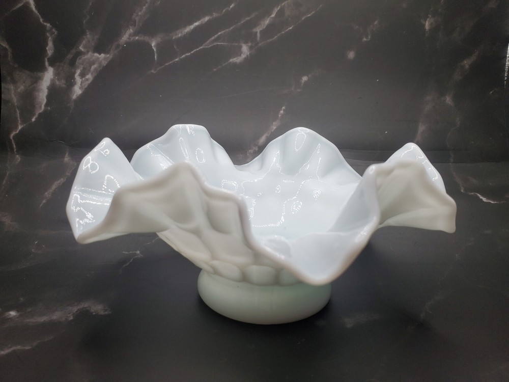 This vintage Fenton white milk glass bowl is a charming piece of elegant glassware from 1957. Handmade in North America, this round bowl features a ruffled thumbprint pattern that adds a decorative touch to any occasion. With a glossy finish and a diameter of 6 inches, this Art Deco style bowl is perfect for serving nuts, candies, or other small treats. A timeless piece from the mid-20th century, this Fenton Colonial bowl is a lovely addition to any glassware collection. Small mark on base as shown.