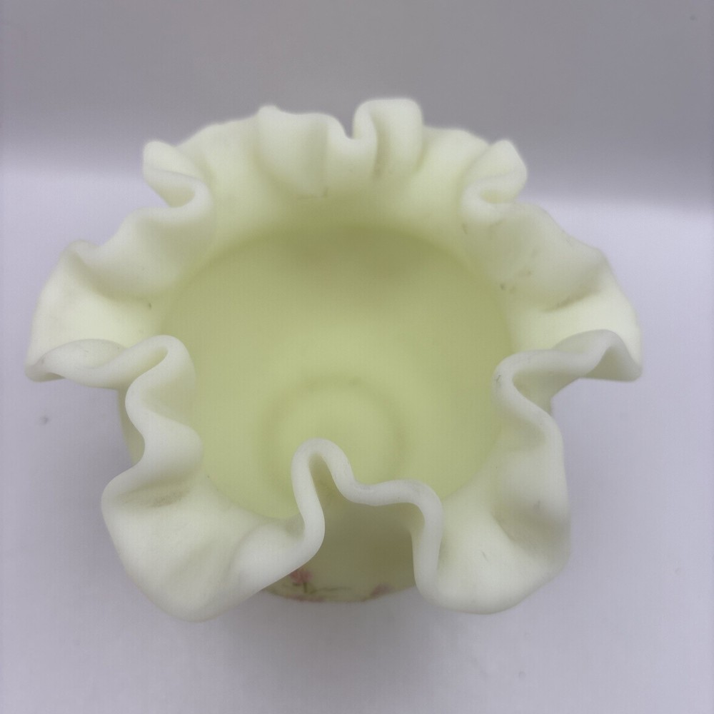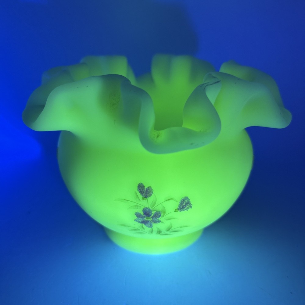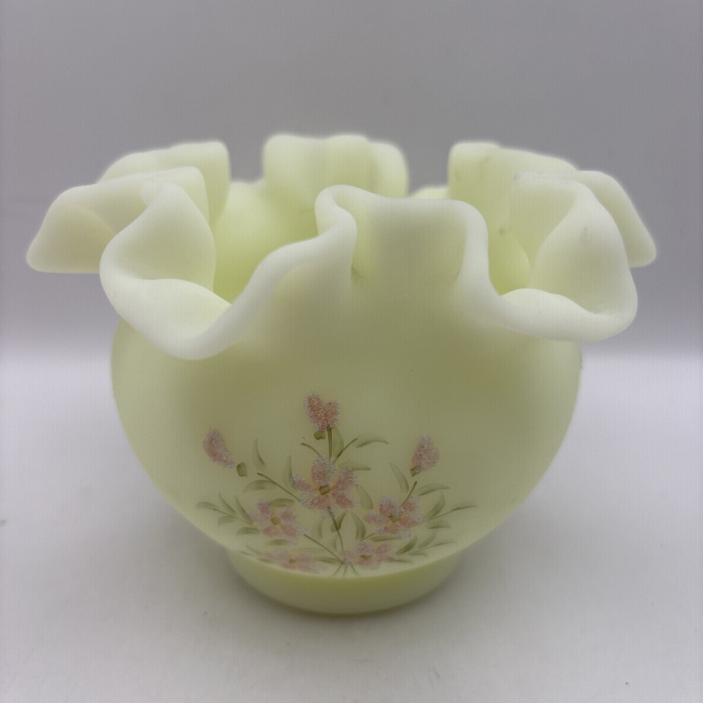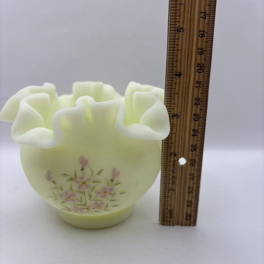 This vintage Fenton glass bowl features a beautiful hand-painted floral design in yellow and lime green colors. Made in the United States as part of the Art Glass production style, this piece is signed by the artist and showcases the brand's quality craftsmanship. With its charming flower theme and unique color combination, this Fenton glassware would make a lovely addition to any collection of decorative pottery and glassware.