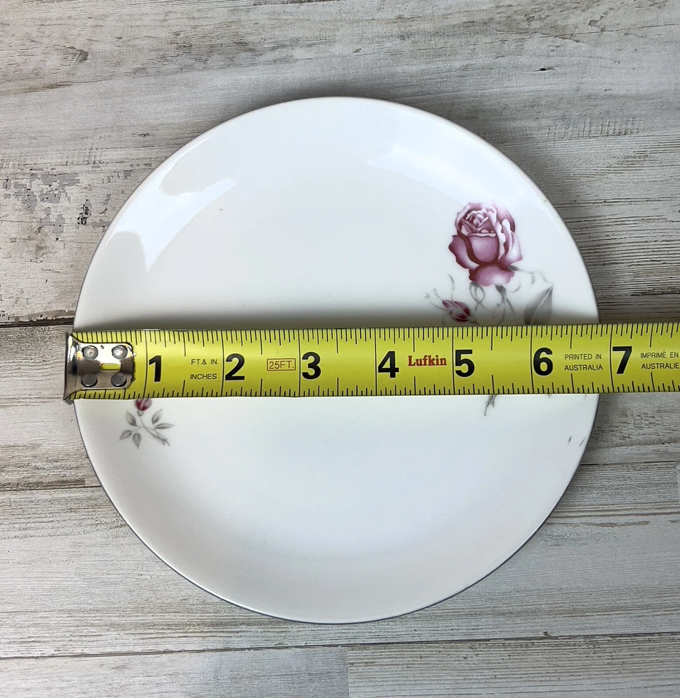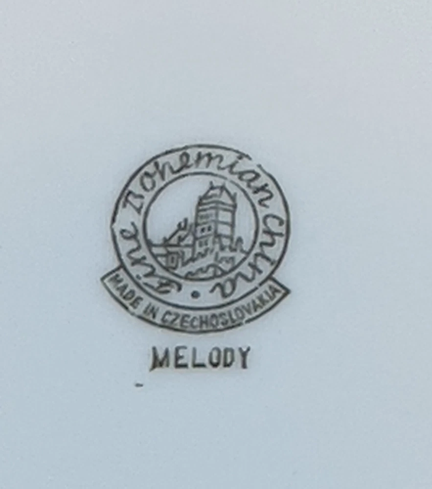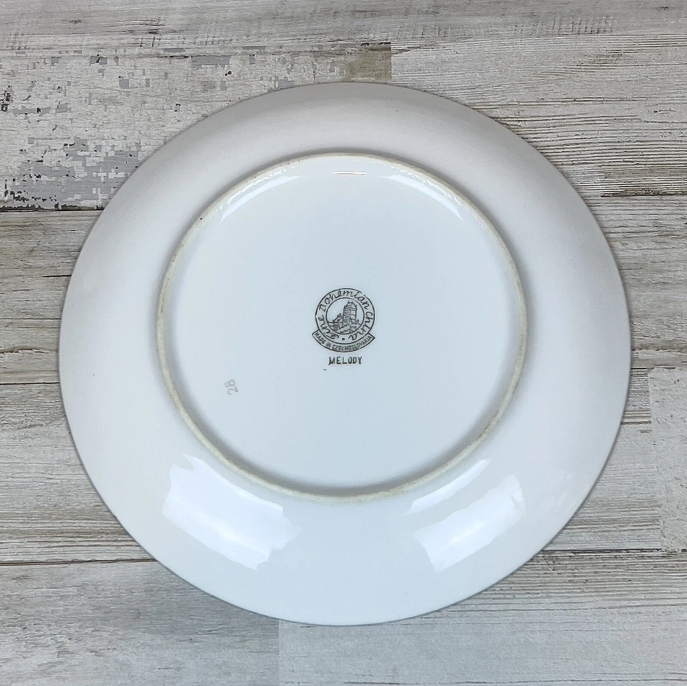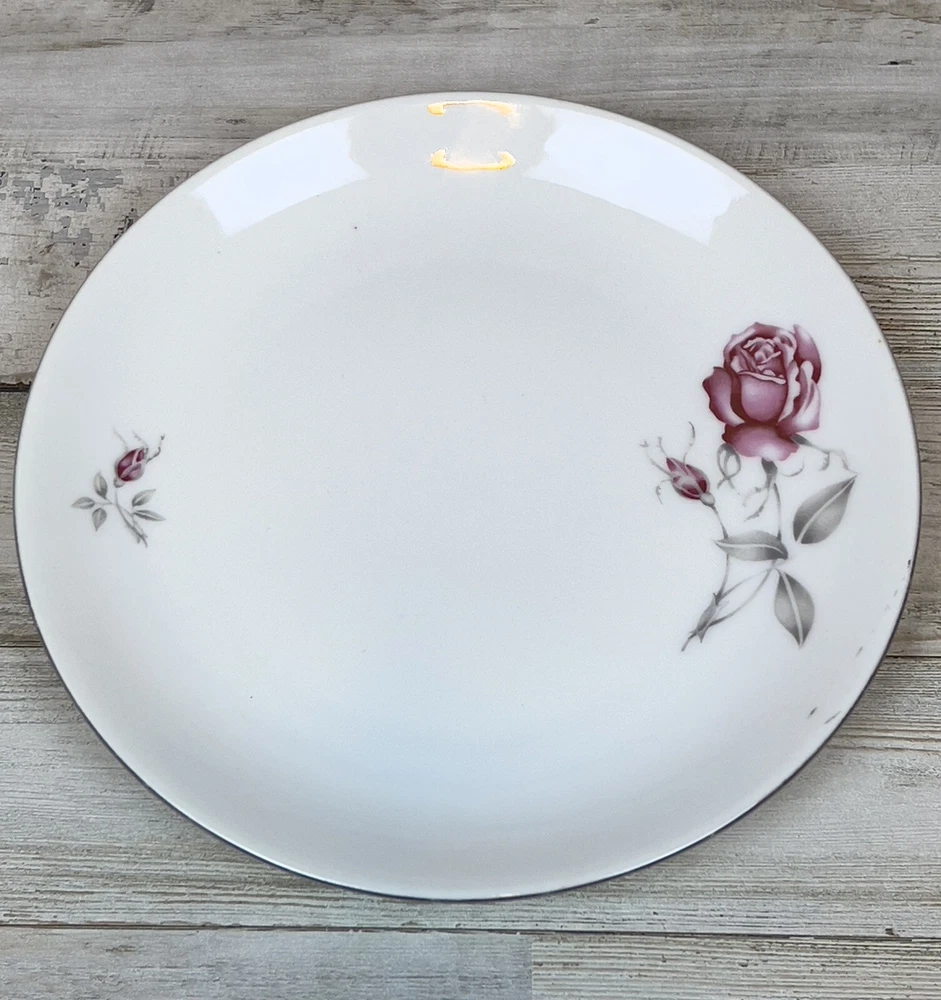 Vintage Fine Bohemian China MELODY Made in Czechoslovakia Rose Salad Plates (2). These plates feature a pink rose with silver petals on a white background. The plates are trimmed in silver. They are in excellent pre-owned condition. See photos for details.
