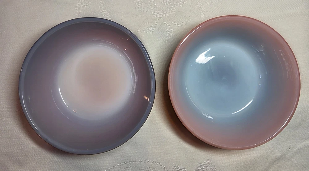 The product is a set of 2 vintage Fire King Pink/Black Ombré bowl stackable cereal bowls from Anchor Hocking. Made of glass with a glossy finish, these round bowls feature a multicolor ombré pattern and measure 2 inches in depth and 4.5 inches in diameter. Manufactured in the United States during the 1960s, these collectible bowls are a unique addition to any kitchen or dining space, embodying a retro design with a fire-themed aesthetic.