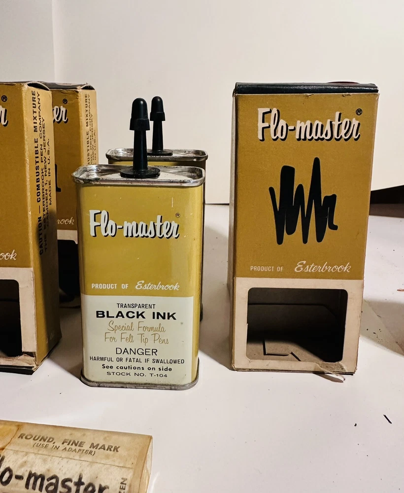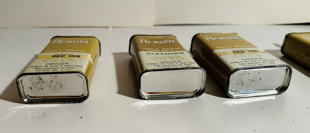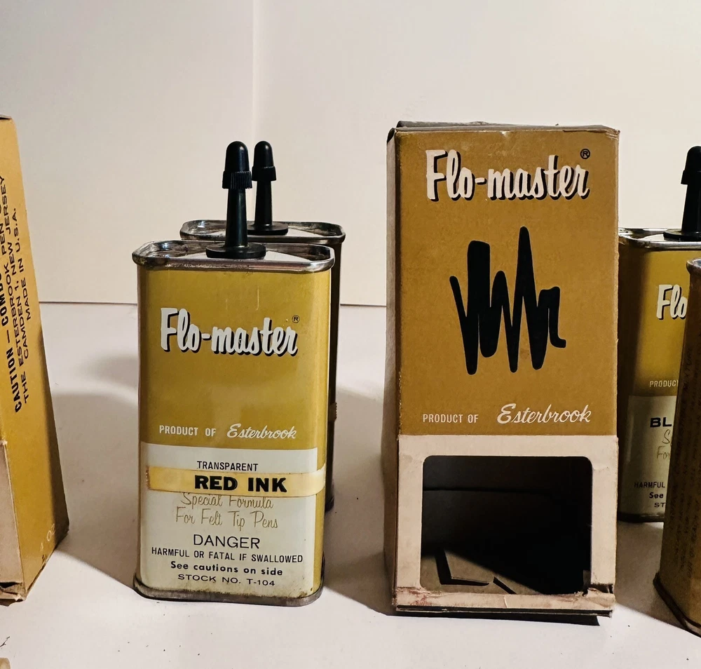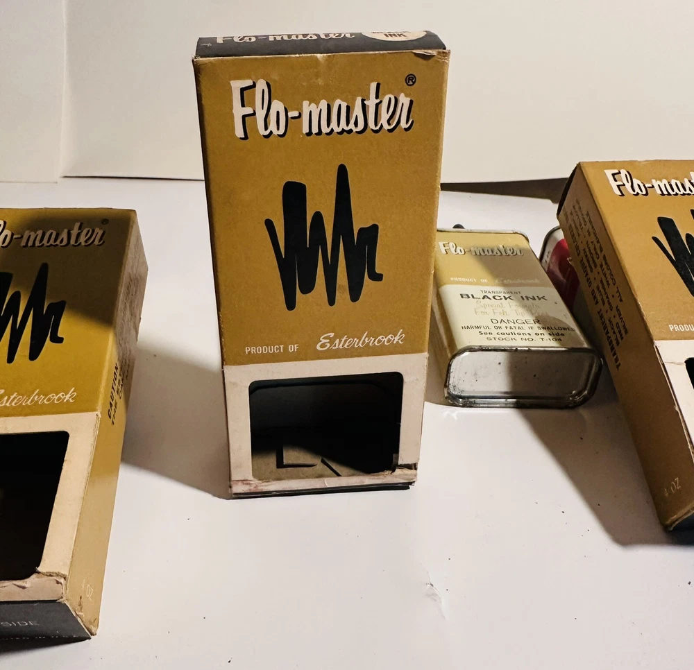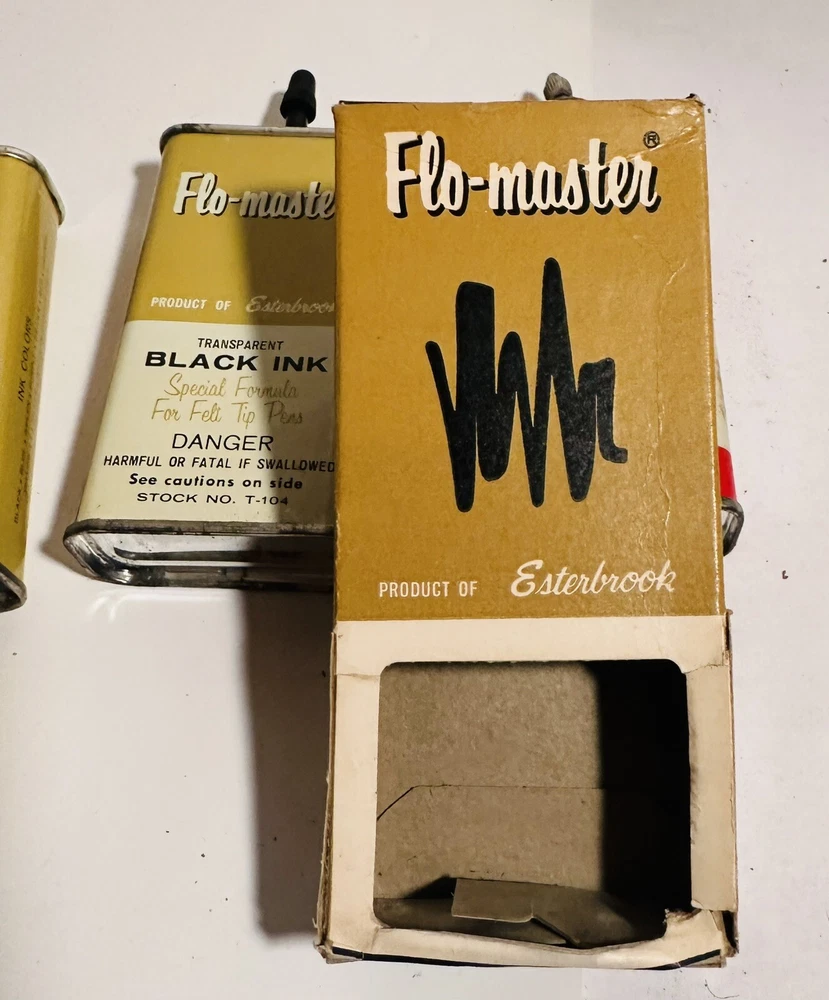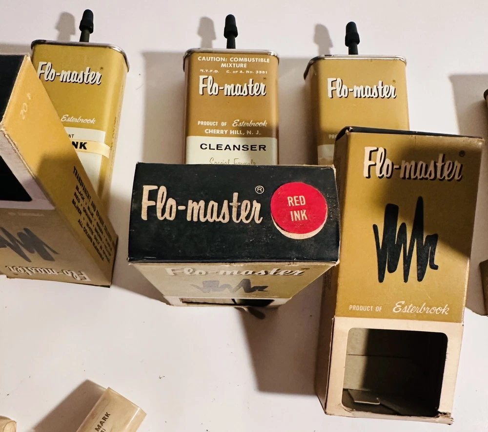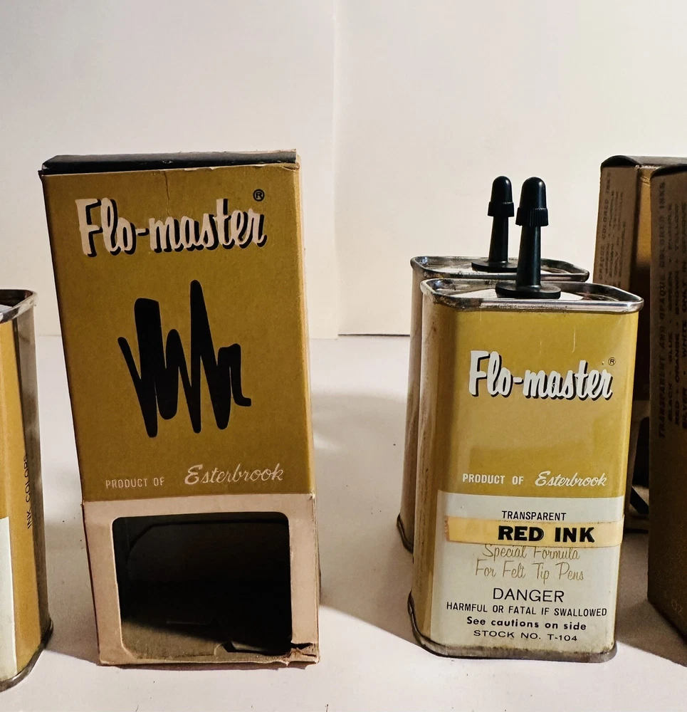 For Display Only; This is a rare find for collectors of vintage pen accessories. These are Flo Master ink and felt tips that are sure to add value to any collection. The unique design and quality of these tips make them a great addition to your pen accessories collection. They are perfect for those who appreciate rare and unique items. Don't miss out on the opportunity to own these vintage Flo Master ink and felt tips. Listed are : 1 Red tin w/ Black Ink (empty) , 2 Brown tins w/ Black ink (empty) , 2 Brown tins w/ red ink (empty) , 1 Brown tin w/ Cleanser (empty) , 2 Red Box w/ tins (Never Opened to my knowledge) , 8 plastic bottles of Felt Tips. 6 of 8 have felt tips inside. 4 seem to be unopened but not 100%. 7 original Display Boxes are included. No returns Flo- master ink