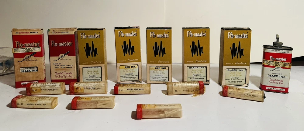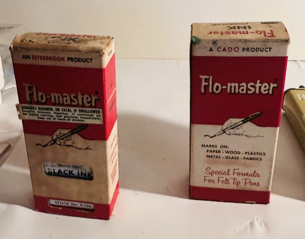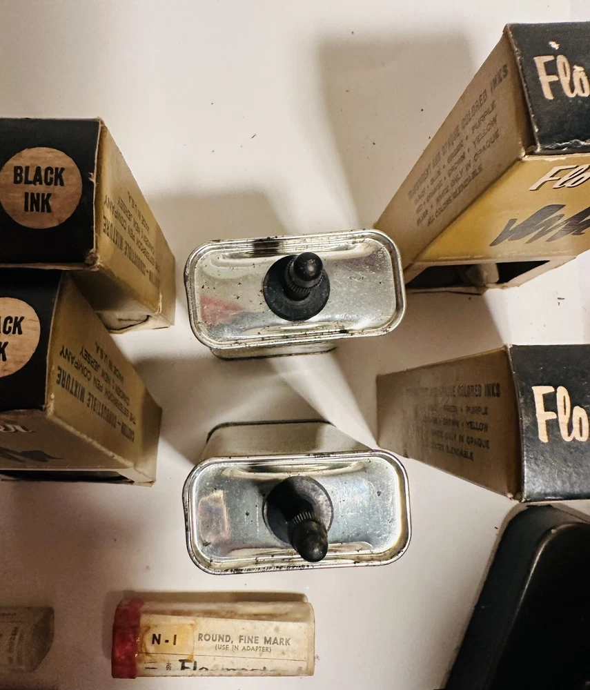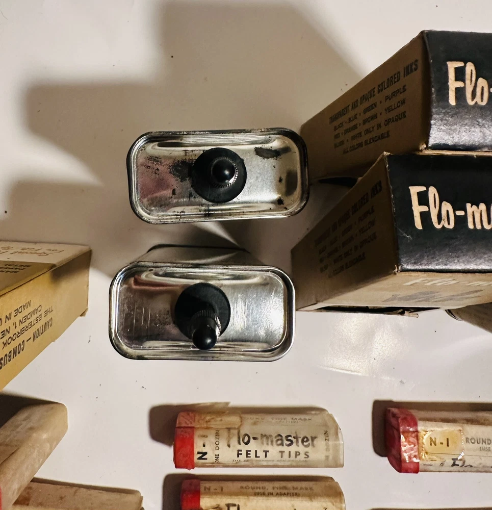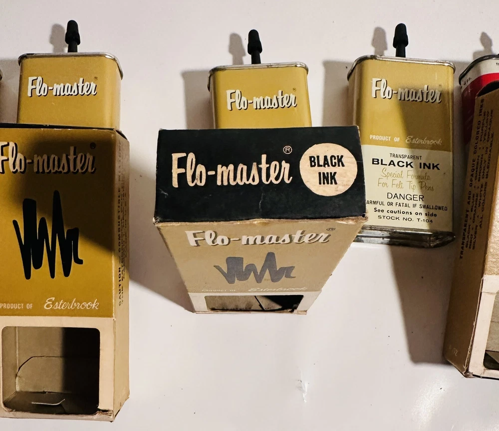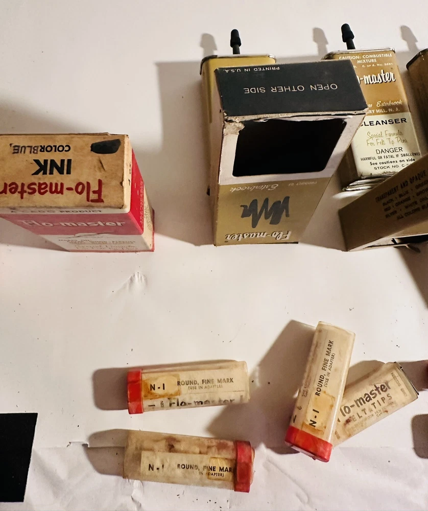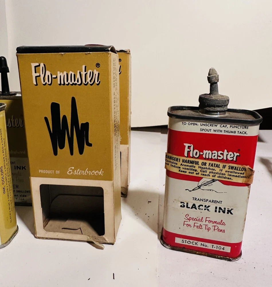For Display Only; This is a rare find for collectors of vintage pen accessories. These are Flo Master ink and felt tips that are sure to add value to any collection. The unique design and quality of these tips make them a great addition to your pen accessories collection. They are perfect for those who appreciate rare and unique items. Don't miss out on the opportunity to own these vintage Flo Master ink and felt tips. Listed are : 1 Red tin w/ Black Ink (empty) , 2 Brown tins w/ Black ink (empty) , 2 Brown tins w/ red ink (empty) , 1 Brown tin w/ Cleanser (empty) , 2 Red Box w/ tins (Never Opened to my knowledge) , 8 plastic bottles of Felt Tips. 6 of 8 have felt tips inside. 4 seem to be unopened but not 100%. 7 original Display Boxes are included. No returns Flo- master ink