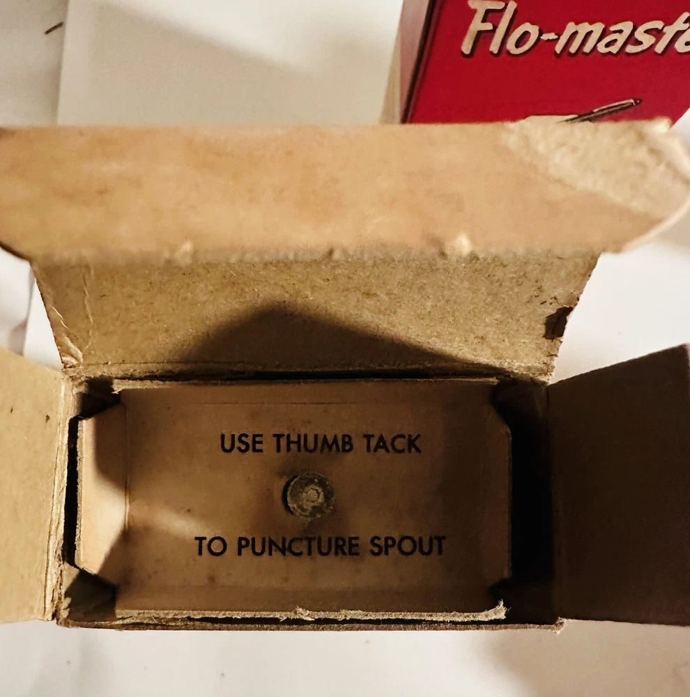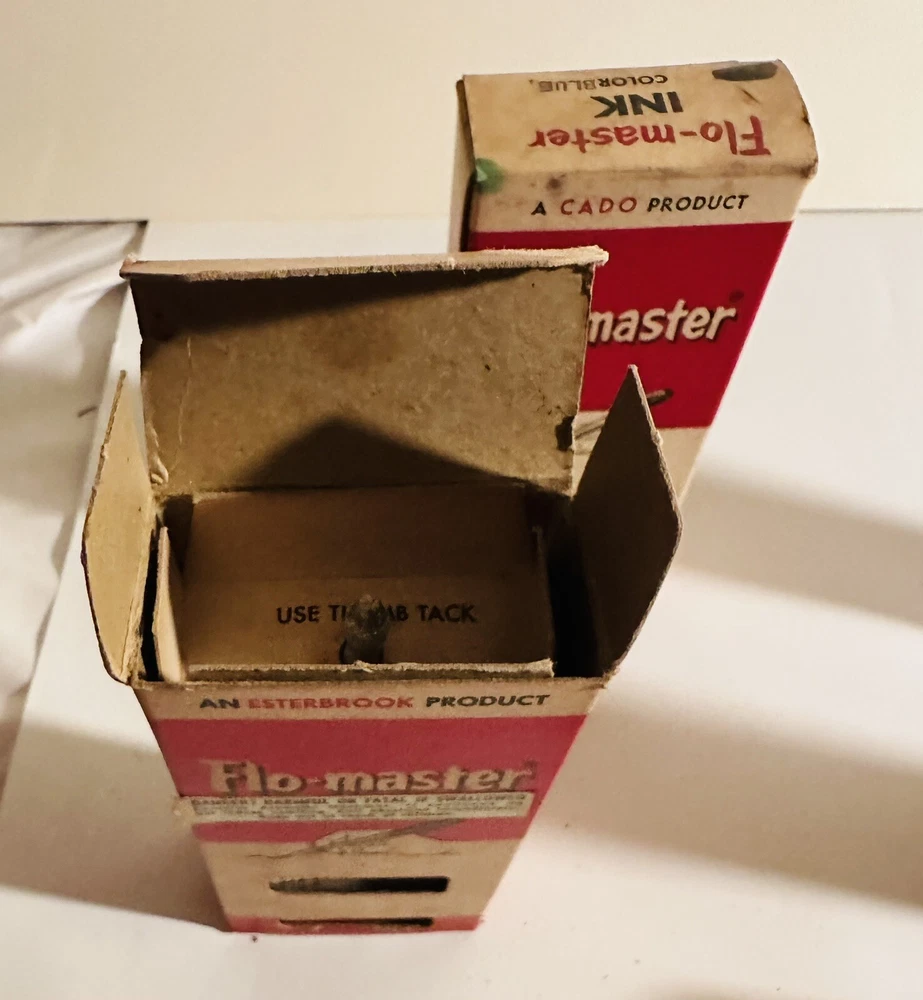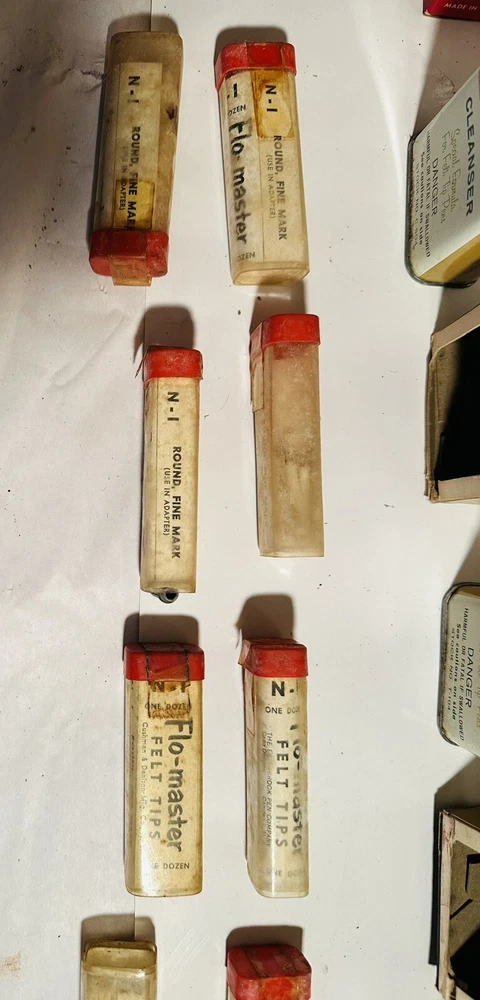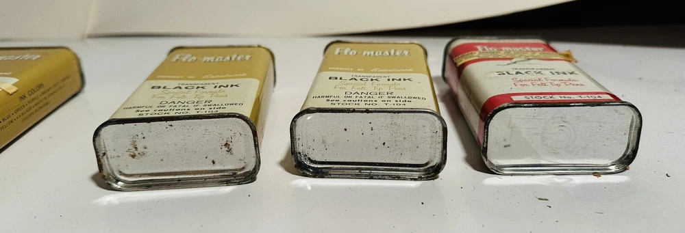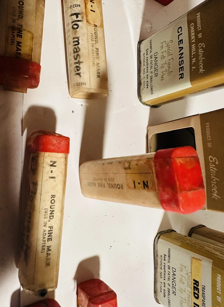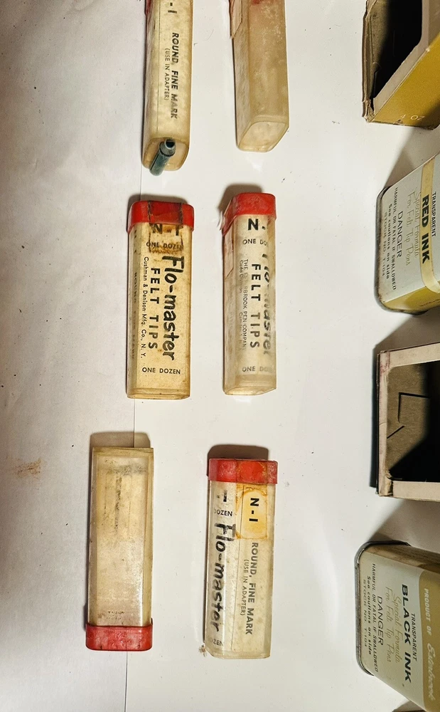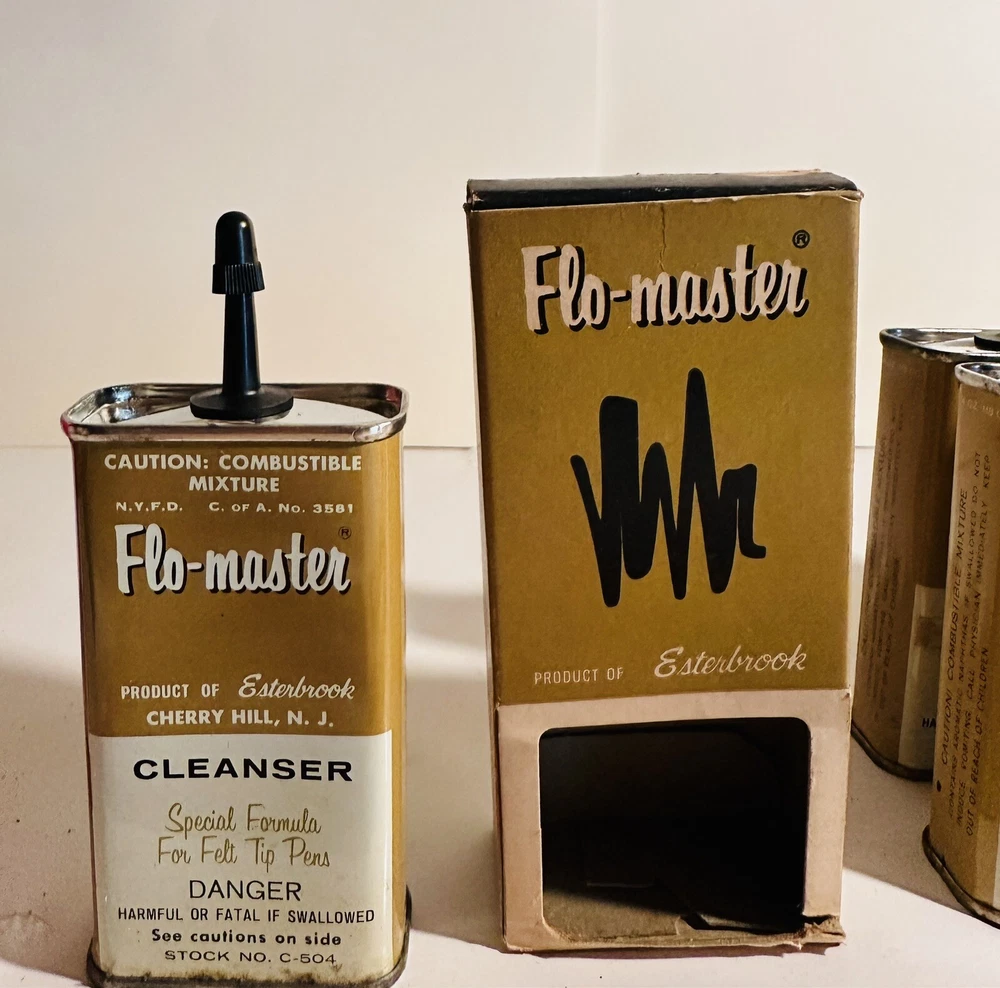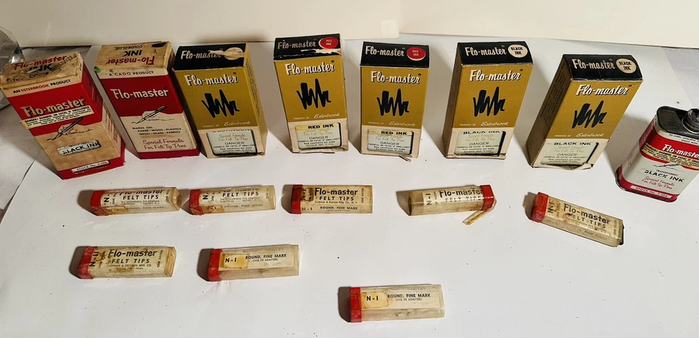 For Display Only; This is a rare find for collectors of vintage pen accessories. These are Flo Master ink and felt tips that are sure to add value to any collection. The unique design and quality of these tips make them a great addition to your pen accessories collection. They are perfect for those who appreciate rare and unique items. Don't miss out on the opportunity to own these vintage Flo Master ink and felt tips. Listed are : 1 Red tin w/ Black Ink (empty) , 2 Brown tins w/ Black ink (empty) , 2 Brown tins w/ red ink (empty) , 1 Brown tin w/ Cleanser (empty) , 2 Red Box w/ tins (Never Opened to my knowledge) , 8 plastic bottles of Felt Tips. 6 of 8 have felt tips inside. 4 seem to be unopened but not 100%. 7 original Display Boxes are included. No returns Flo- master ink