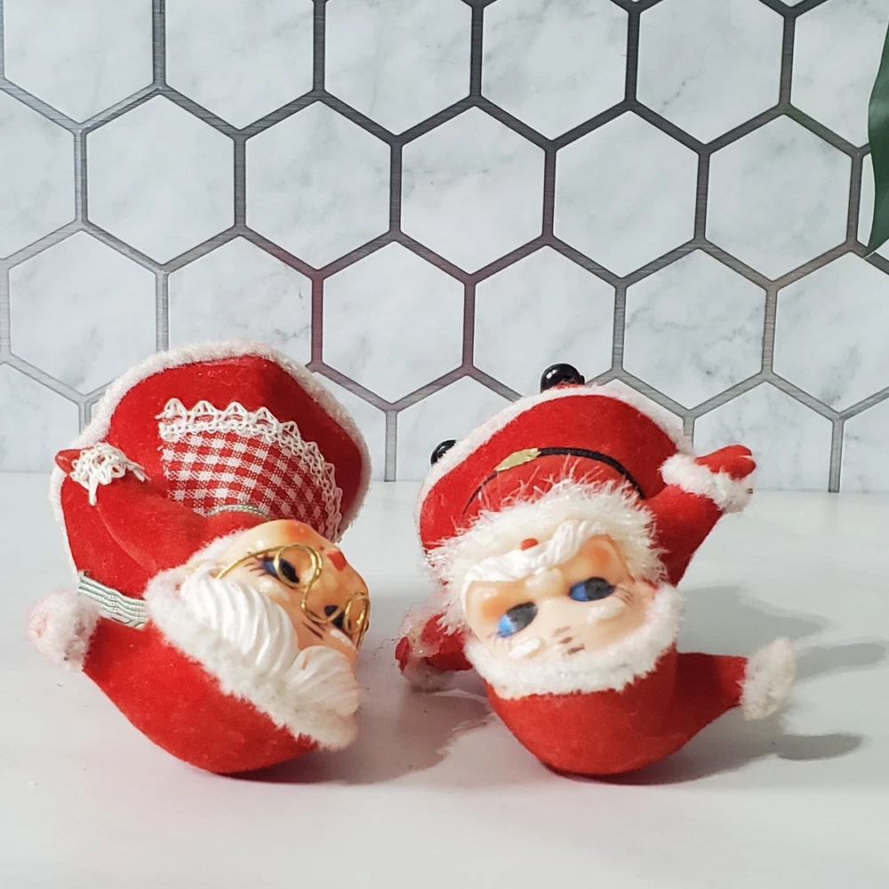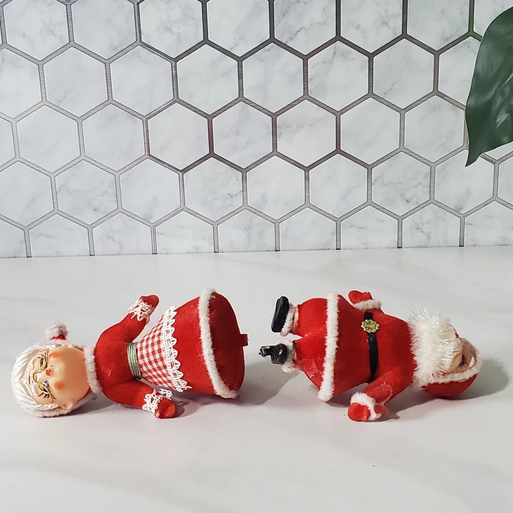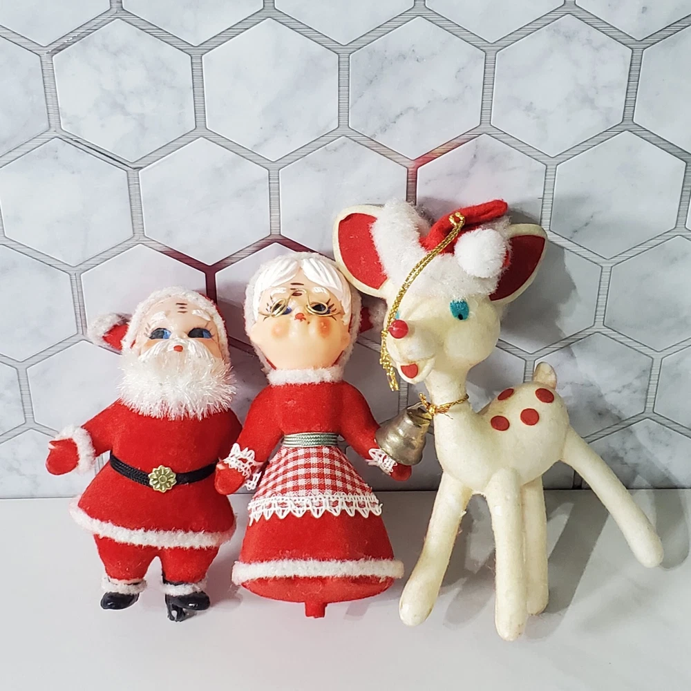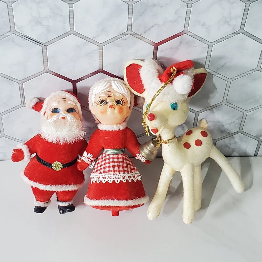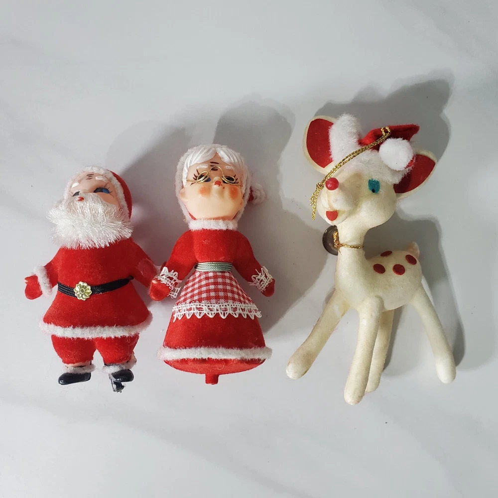 Vintage Flocked Plastic Santa and Mrs Claus Kissing with A Reindeer Santa has some glue on him Ms Claus is missing some flocking on her elbow where she was glued to Santa Reindeer is missing some flocking Does not stand on their own. Possibly missing base Thank you for viewing our products. PRODUCT SOLD AS IS. Please Message With Questions Prior To Purchase. If you have an issue with any of our items please reach out to us prior to contacting eBay. Thanks! Please note: We do sell new and used items. Our used items are pre-owned / pre-loved & may show signs of wear. Please view all photos for details, size, & imperfections as they are a form of the descriptions in addition to what is stated in the description section. We will do my best to inspect each item to find the best quality items possible. We do not include/replace batteries in any of our items unless they have been supplied by the manufacture and are in new unused condition. If an item is sent to you NEW / SEALED and you open it or remove the tags, it is NO LONGER ELIGIBLE FOR RETURN. Opened items / Removed tags - Means the item is NO LONGER in its original state and can no longer be sold as NEW. -Thank you for your understanding We are often asked about shipping cost. We are excited about your purchase and take pride in your package arriving to you undamaged . We wrap and cushion all necessary items prior to shipping which adds weight to your package. Unfortunately, this is not optional. Thank you for your understanding. We do not accept returns or issue refunds however in the event we do accept your return or issue a refund we do not reimburse your original shipping fee. Due to how eBay handles international shipping we do not accept any international returns. Thanks again!