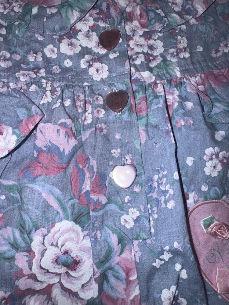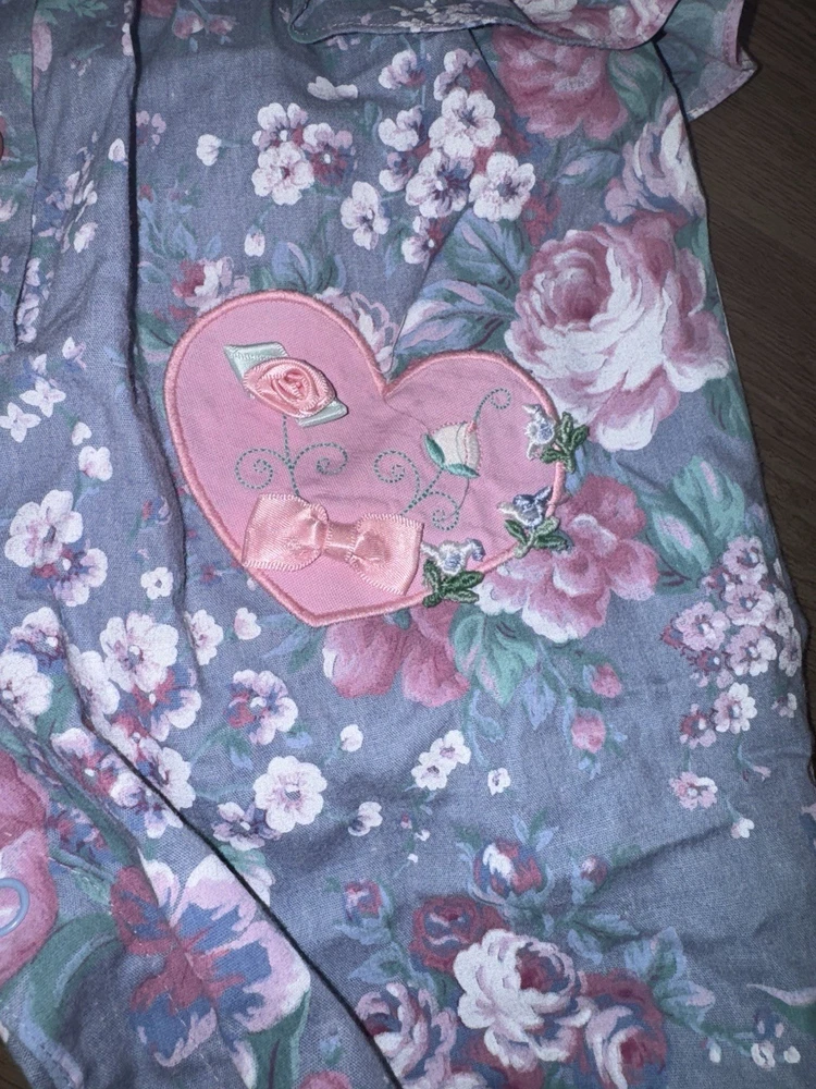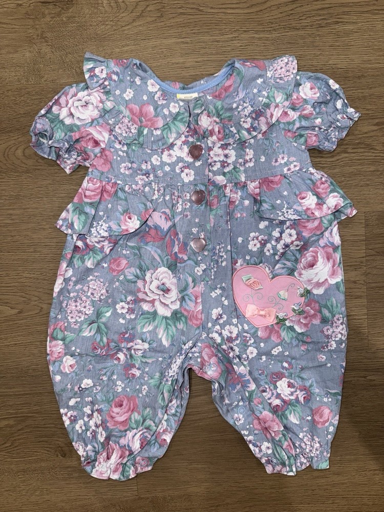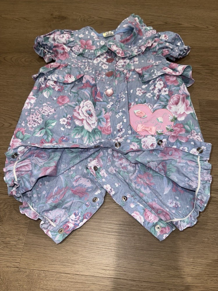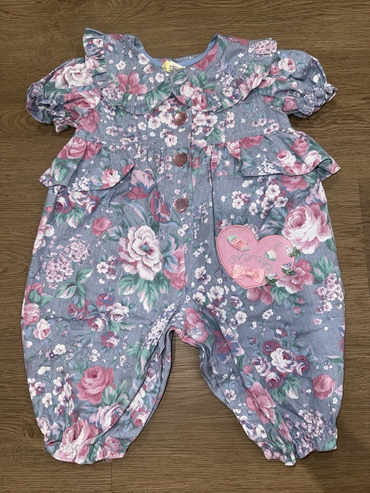 Vintage Floral Baby Girl Blue and Pink Romper-3-6Months Heart Accents -Great vintage shape -3-6 months -Baby girl romper with floral and heart design -50 % cotton and 50% polyester -Heart button closure -Bottom snap closure
