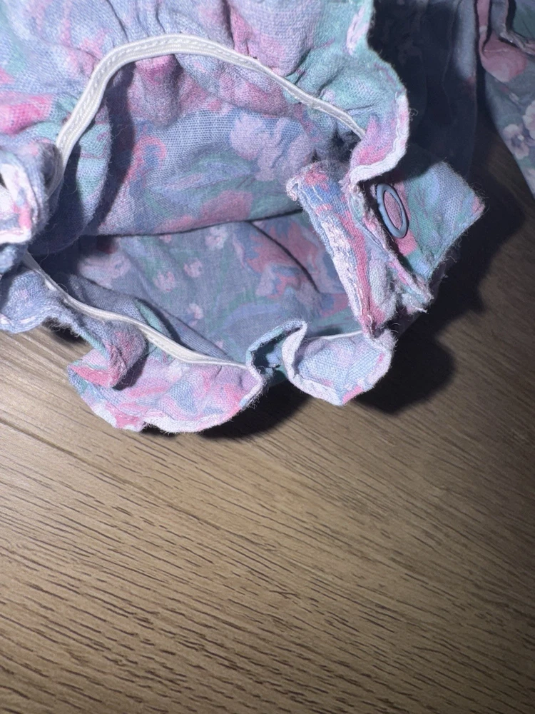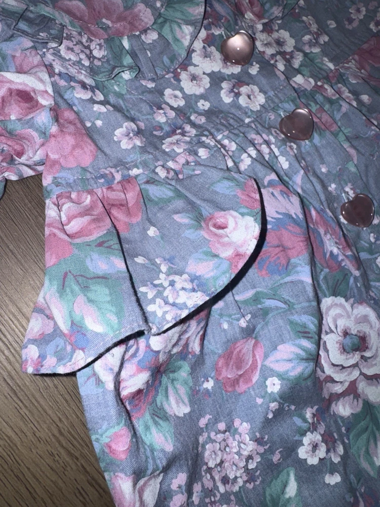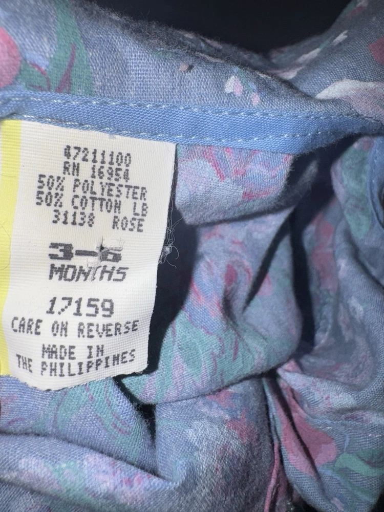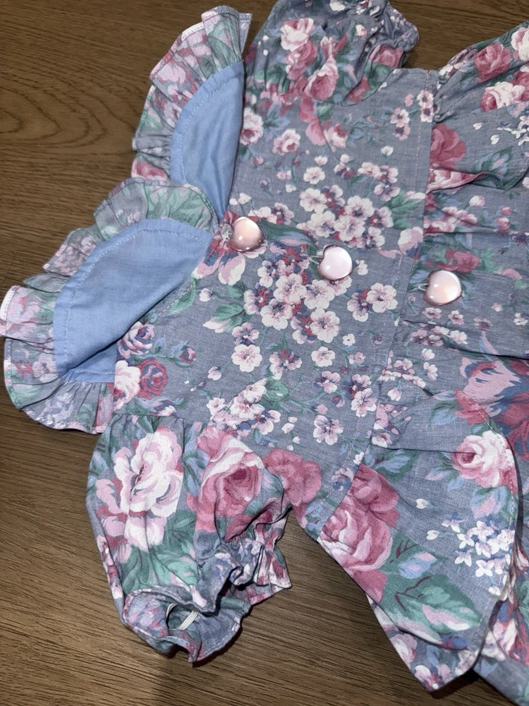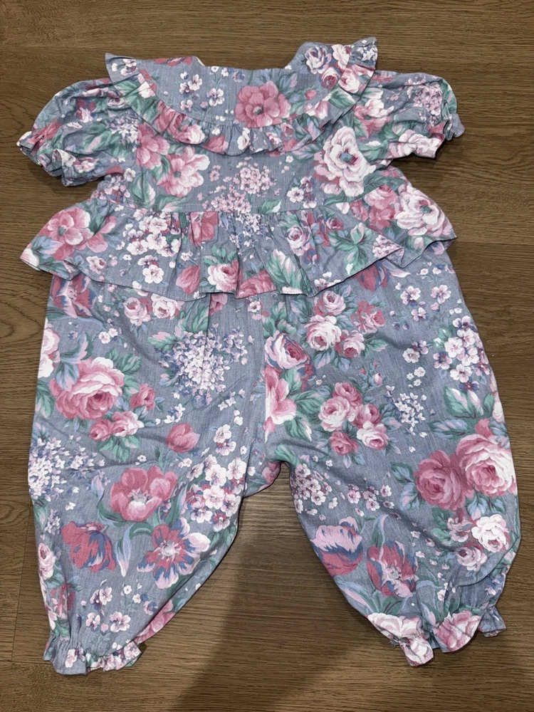 Vintage Floral Baby Girl Blue and Pink Romper-3-6Months Heart Accents -Great vintage shape -3-6 months -Baby girl romper with floral and heart design -50 % cotton and 50% polyester -Heart button closure -Bottom snap closure