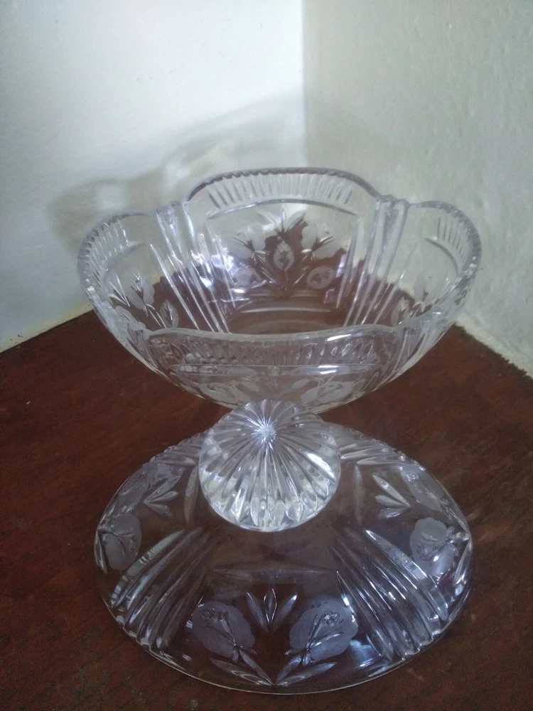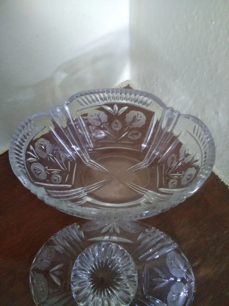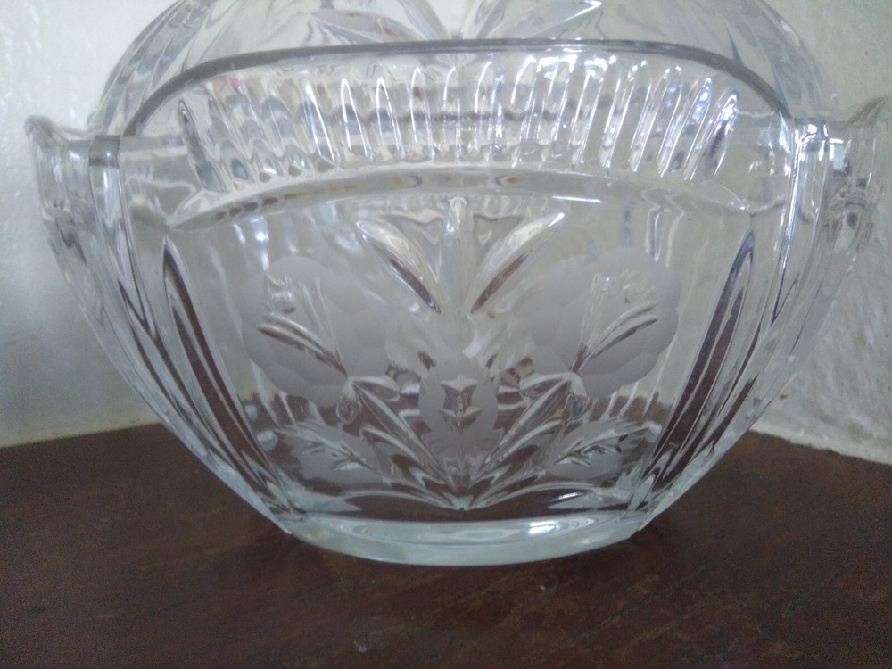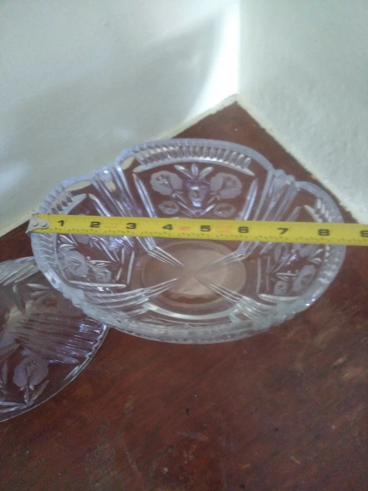 Item Height:8inProduction Style:Elegant GlassBrand:UnmarkedNumber of Items in Set:2Pattern:FloralVintage:YesShape:OvalOriginal/Licensed Reproduction:OriginalFinish:GlossyMaterial:GlassColor:ClearItem Width:8.25inType:Candy DishFeatures:Decorative, Lid Included