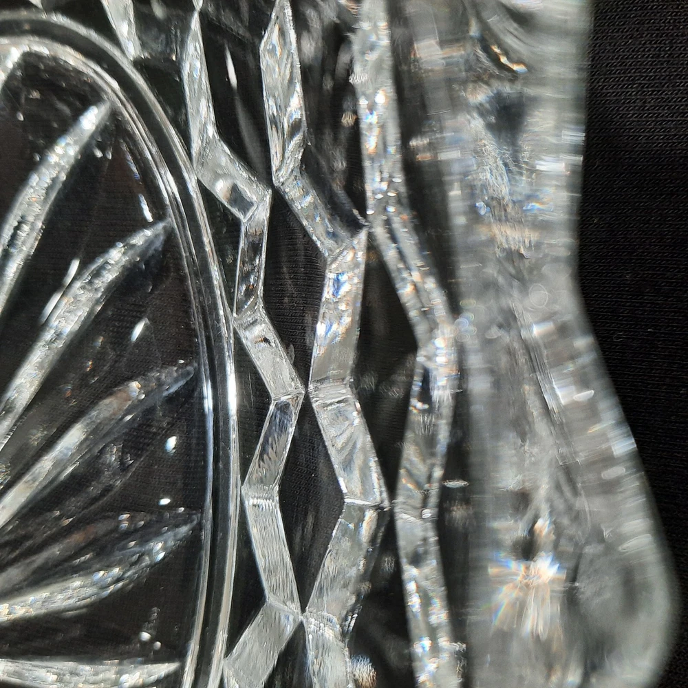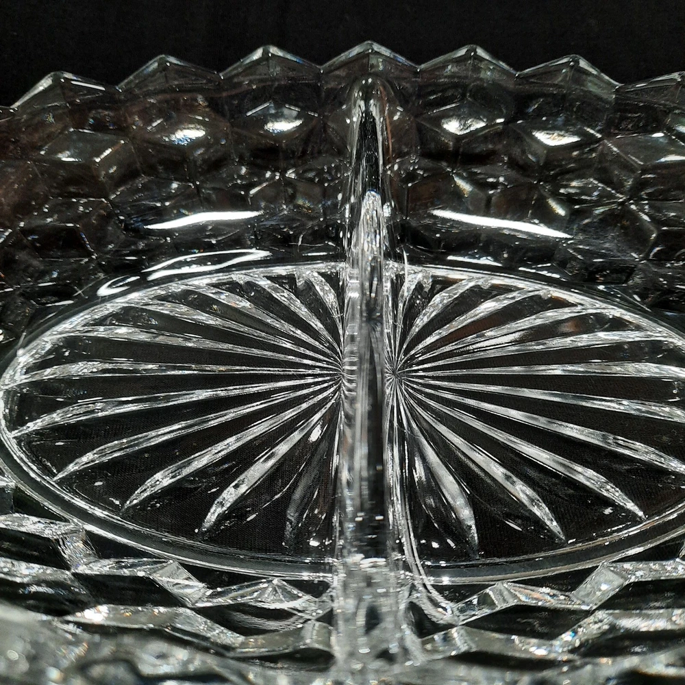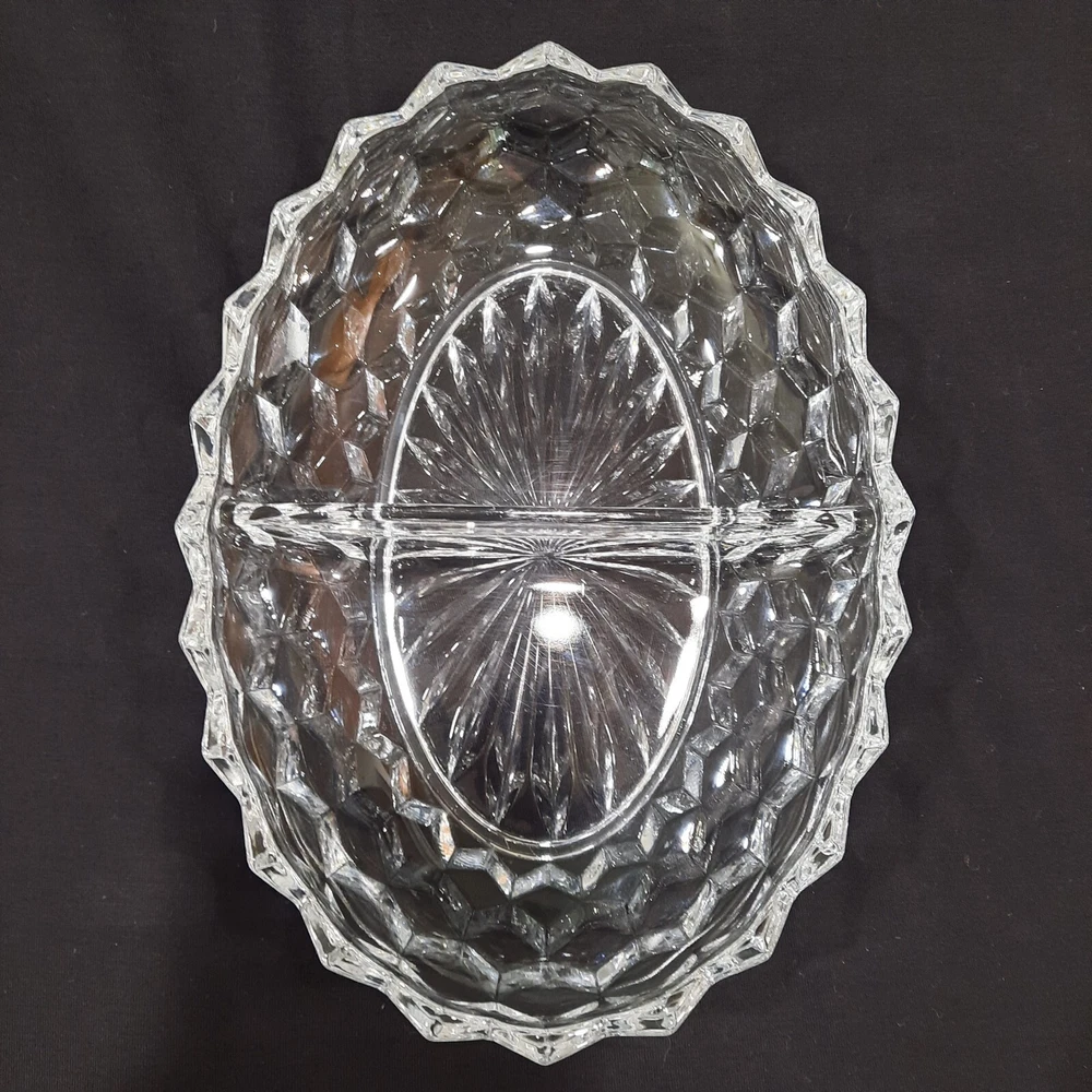 This vintage Fostoria American Clear Glass Divided Dish features an elegant oval shape with a geometric design, measuring 10 inches in diameter and 2 inches in height. Made of clear glass, this dish was manufactured in the United States as part of the American Clear product line. The Fostoria brand is known for its elegant glassware, making this item a stylish and vintage piece for serving various dips or snacks.