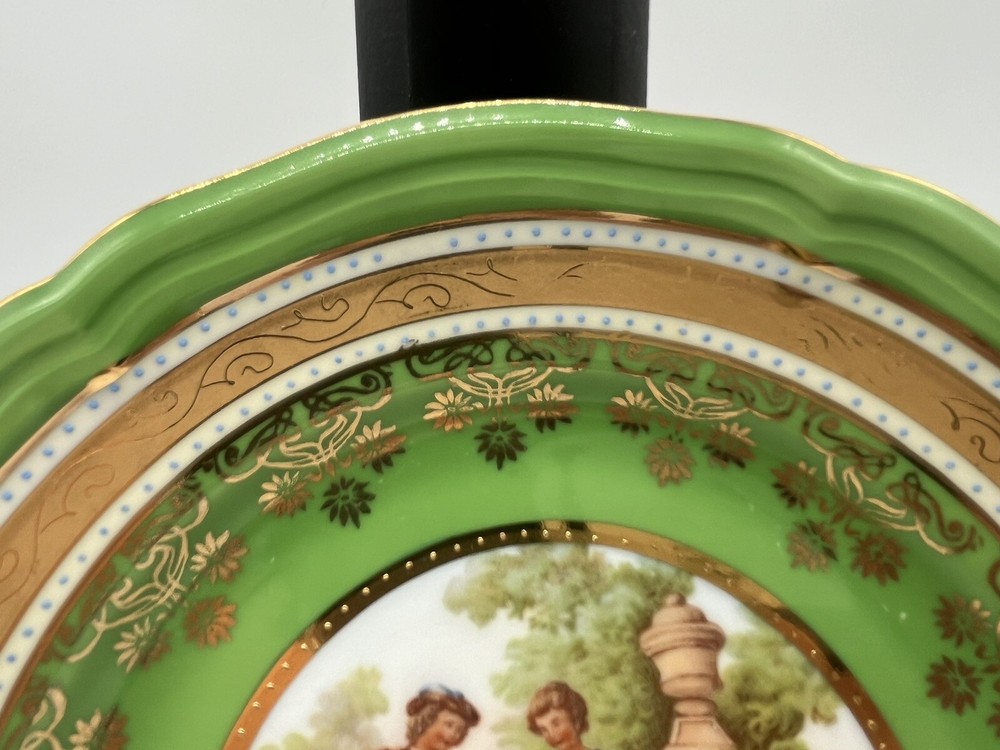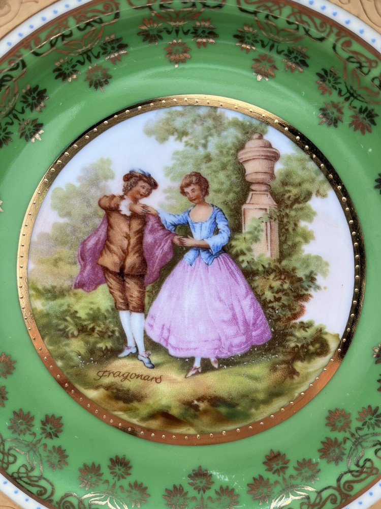 This vintage Fragonard courting plate from MM Bavaria is a beautiful addition to any collection. The round plate measures 7.5 inches in diameter and features a stunning green color with a love and romance theme. Made of high-quality porcelain, this collector plate is a true gem. The plate bears the MM Crown Backstamp and is from Germany, making it a unique piece with a rich history. Whether you're a collector or simply looking for a special decorative item, this vintage plate is sure to impress. Add it to your collection today!