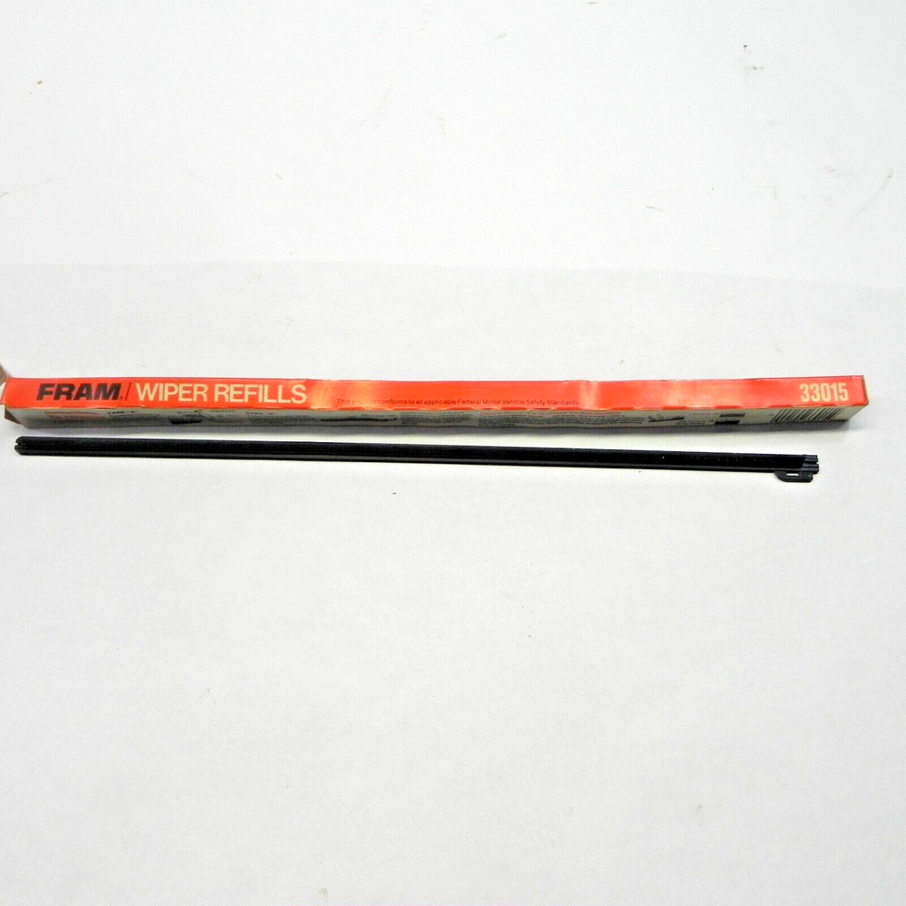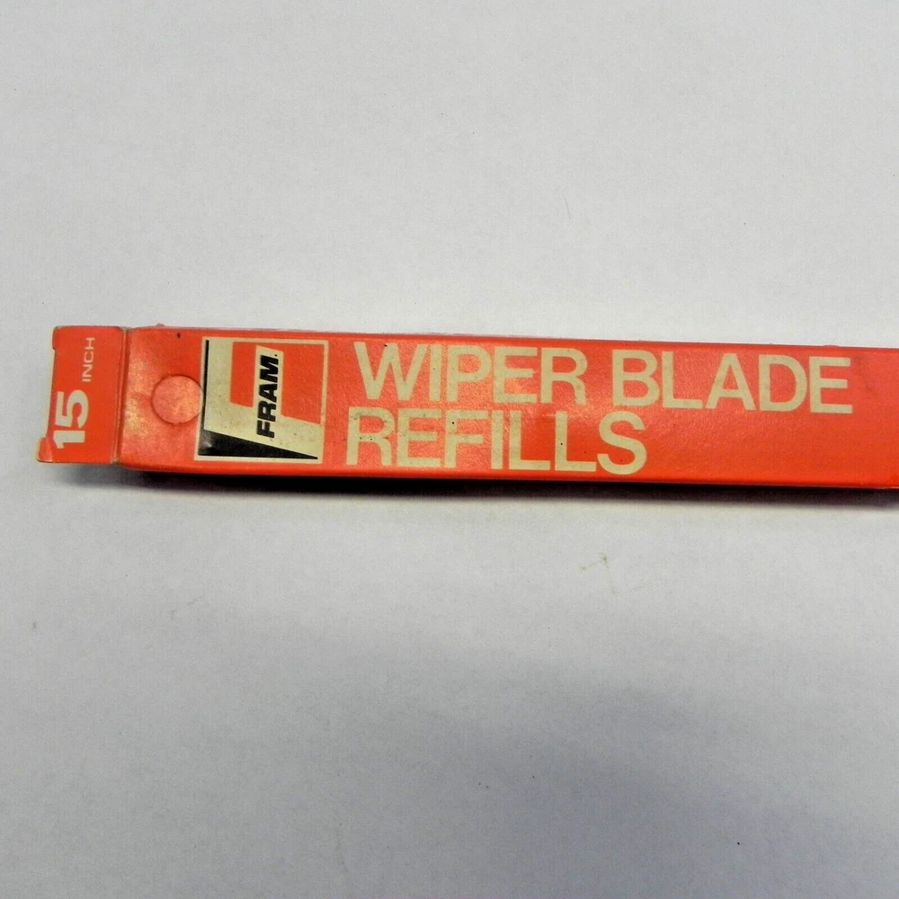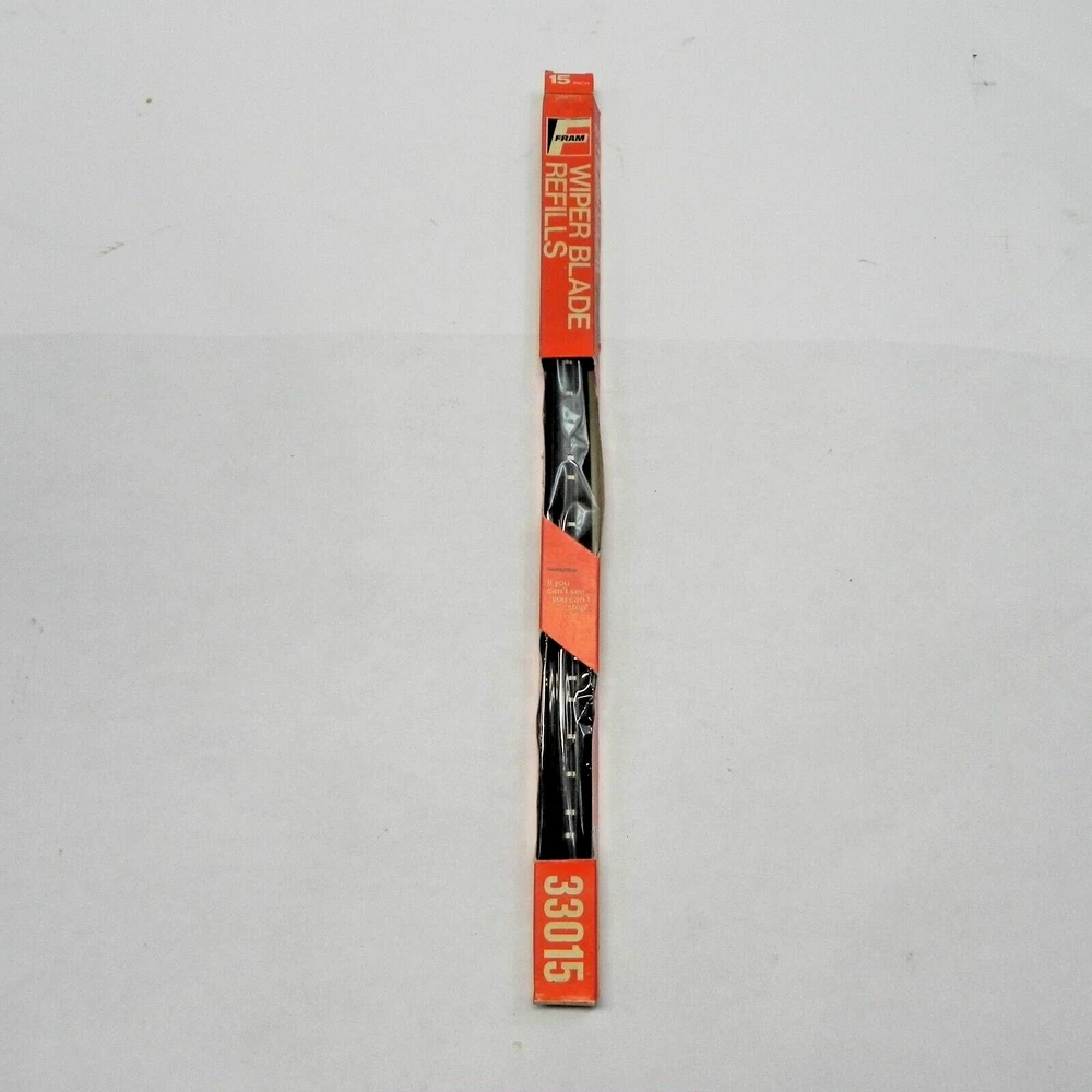 The product is a set of vintage Fram 15-inch replacement wiper blades refills (part number 33015) designed for universal windshield use. It includes mounting hardware for easy installation. The blades are suitable for various vehicles and offer a convenient and reliable solution for maintaining clear visibility during inclement weather conditions. A genuine Fram product, these wiper blade refills provide quality performance and durability for efficient windshield wiping. Fit many makes and models, chevrolet chevy ford mopar chrysler plymouth pontiac honda nissan datsun.