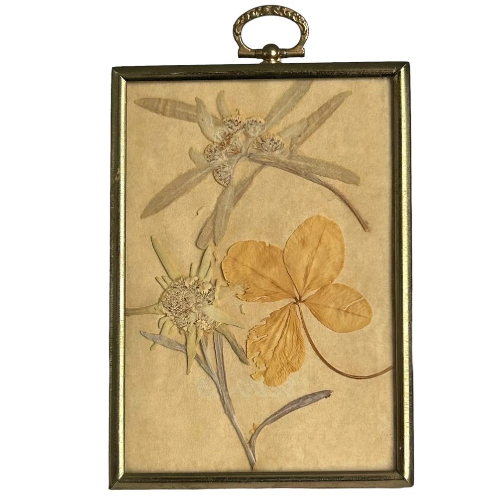 Vintage Framed Pressed Edelweiss Flowers & Four Leaf Clover Art