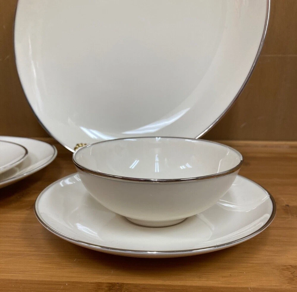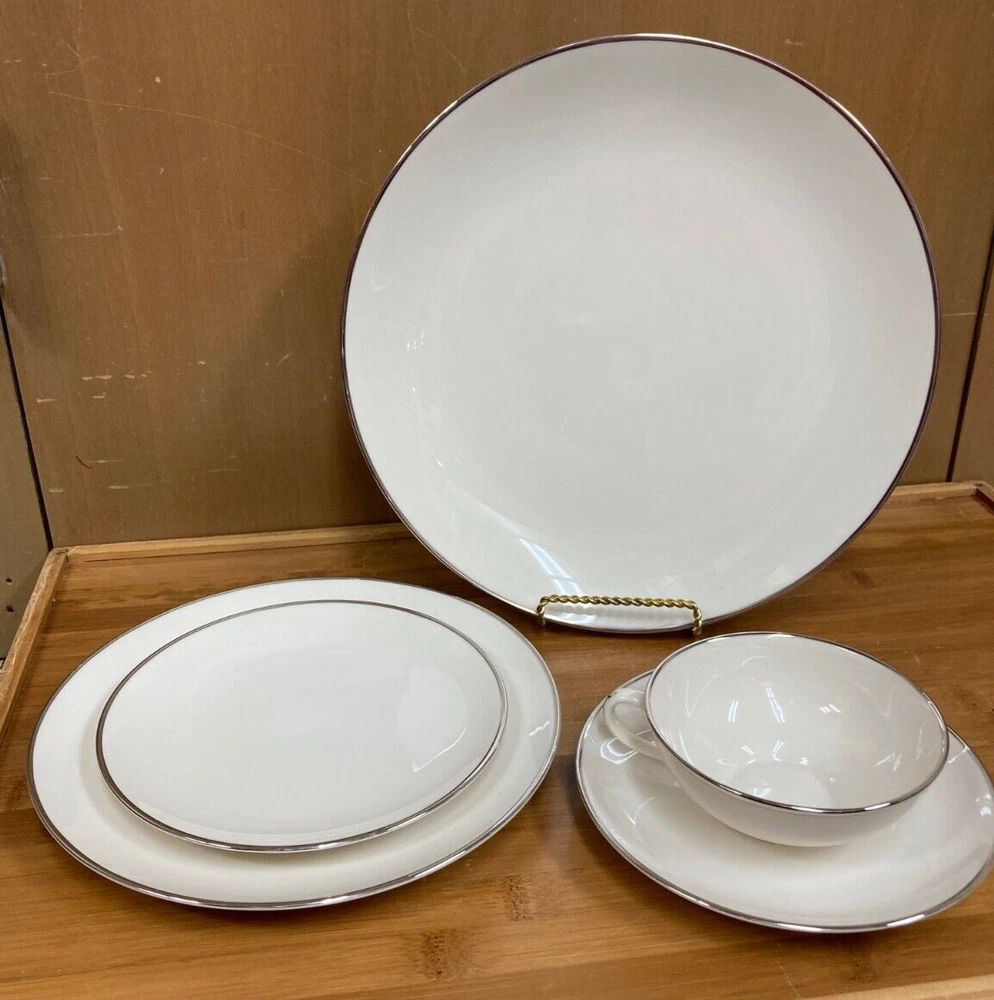 Enhance your dining experience with this elegant five-piece set of Franciscan Masterpiece China. The set includes a cup/saucer, salad plate, dinner plate, and bread/dessert plate all of which are crafted with care and attention to detail. The ivory color and glossy finish of the plates make them suitable for all occasions, whether you are hosting a formal dinner party or a casual get-together with friends and family. Each plate in the set is made of high-quality ceramic with platinum trim, ensuring that they are durable and long-lasting. The plates are 10.5 inches in diameter and are designed to fit comfortably in your hand. They are easy to clean and maintain, making them a perfect addition to your dinnerware collection. Bring home this beautiful set of plates today and add a touch of elegance to your dining experience.