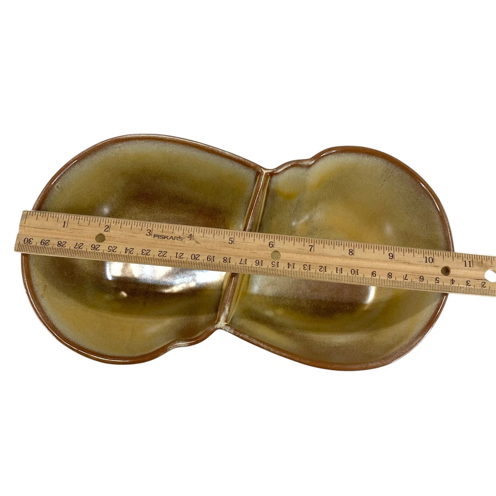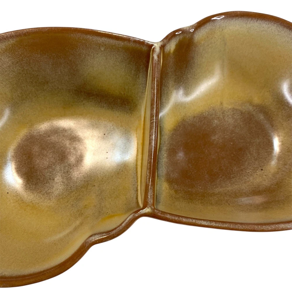 Discover the charm of classic American art pottery with this vintage Frankoma Pottery divided serving bowl. Exquisitely crafted in the United States, the bowl showcases the timeless appeal of Gold Desert, an enchanting hue that adds a touch of elegance to any table setting. The oval shape and unique divided design make it an ideal piece for serving relish or desserts, bringing both function and style to your culinary presentations. Adhering to traditional pottery techniques, this piece hails from the revered era of Frankoma/Gracetone, renowned for its quality and craftsmanship. Whether you're a collector of vintage pottery or seeking to infuse your home with a slice of history, this clay bowl is a testament to the enduring beauty of artisanal goods.
