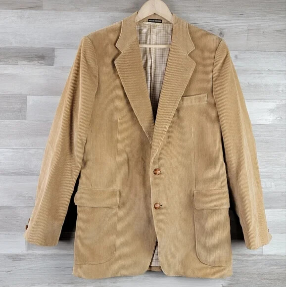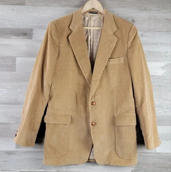 Vintage Frenchman Tan Whale Corduroy Blazer Mens Size 42R No Major Flaws In Great Overall Condition Cotton Corduroy Material Button Closure All measurements laying flat and in inches: Shoulder to hem: 31" Pit to pit: 21" Sleeves: 19" Cuff to Pit k5_121524 Vintage, Corduroy, Fall, Winter