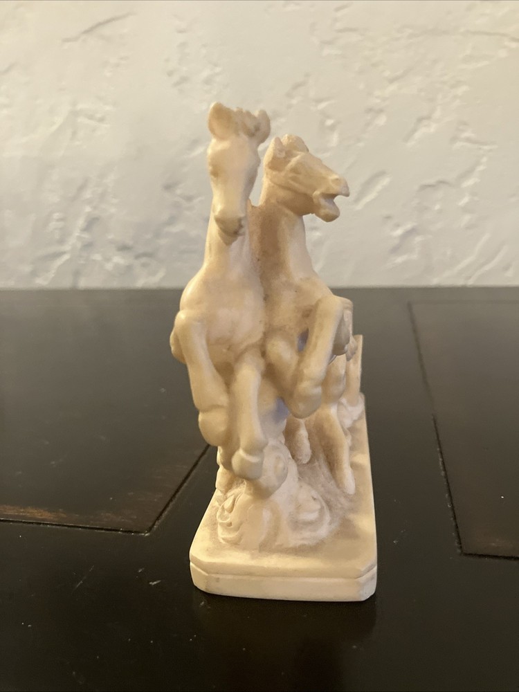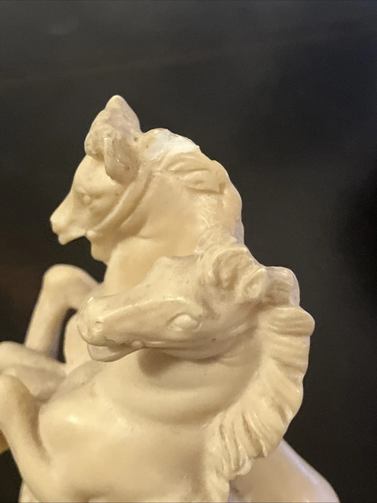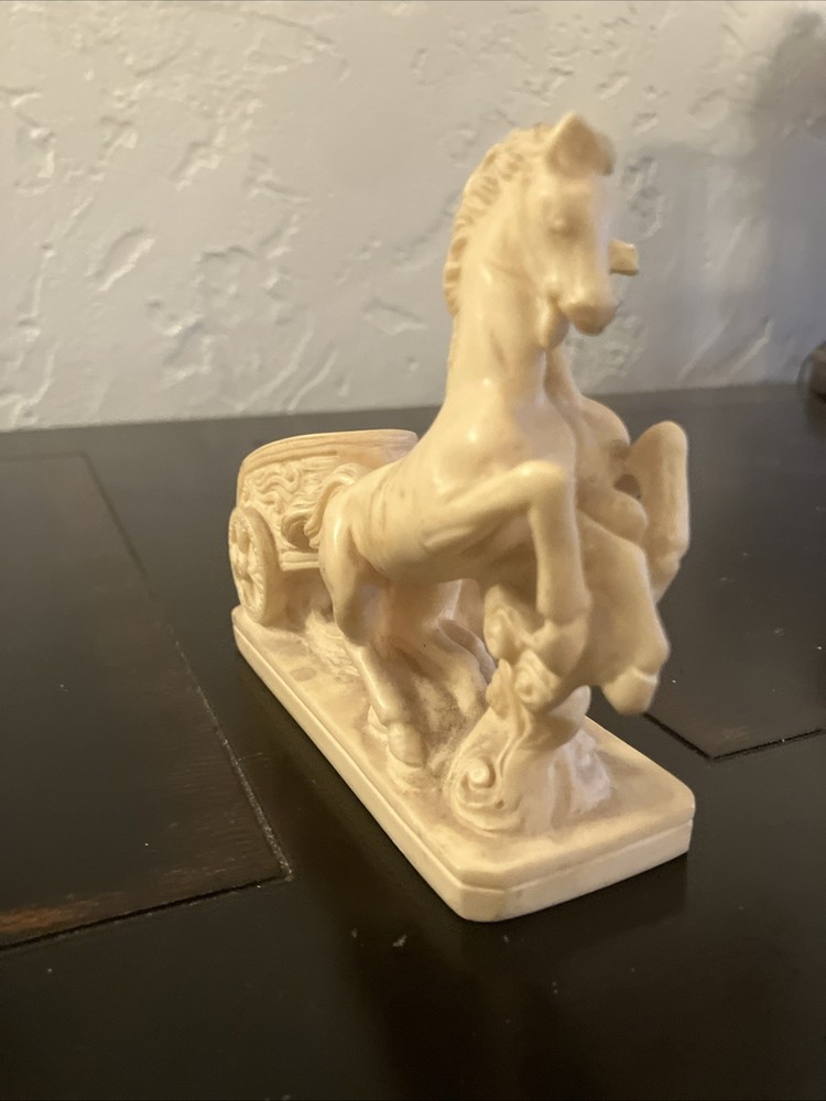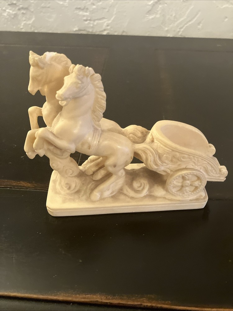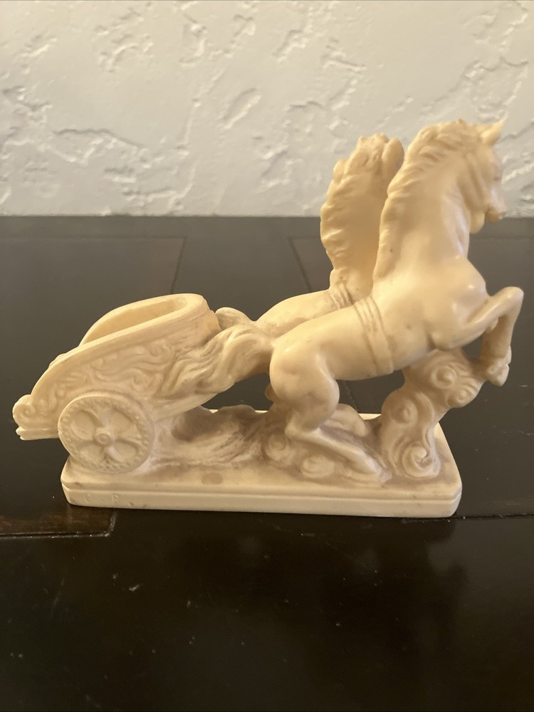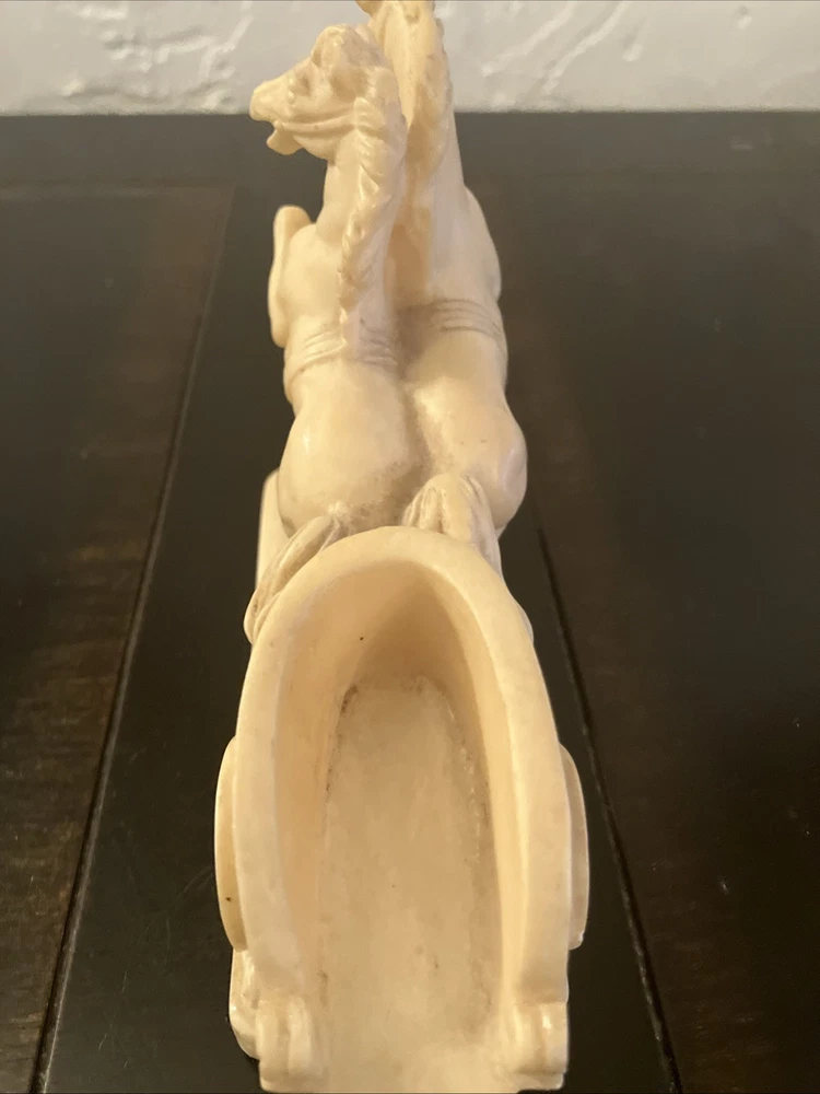 The Vintage G. Ruggeri Alabaster Horses and Roman Chariot Sculpture is a small, original sculpture made in Italy in 1966. Featuring intricate detailing and a Renaissance style, this piece captures the ancient Roman subject with alabaster material and European craftsmanship. The unique charm of this sculpture is highlighted by its European origin and cultural theme, making it a valuable addition to any art collection or tabletop display.