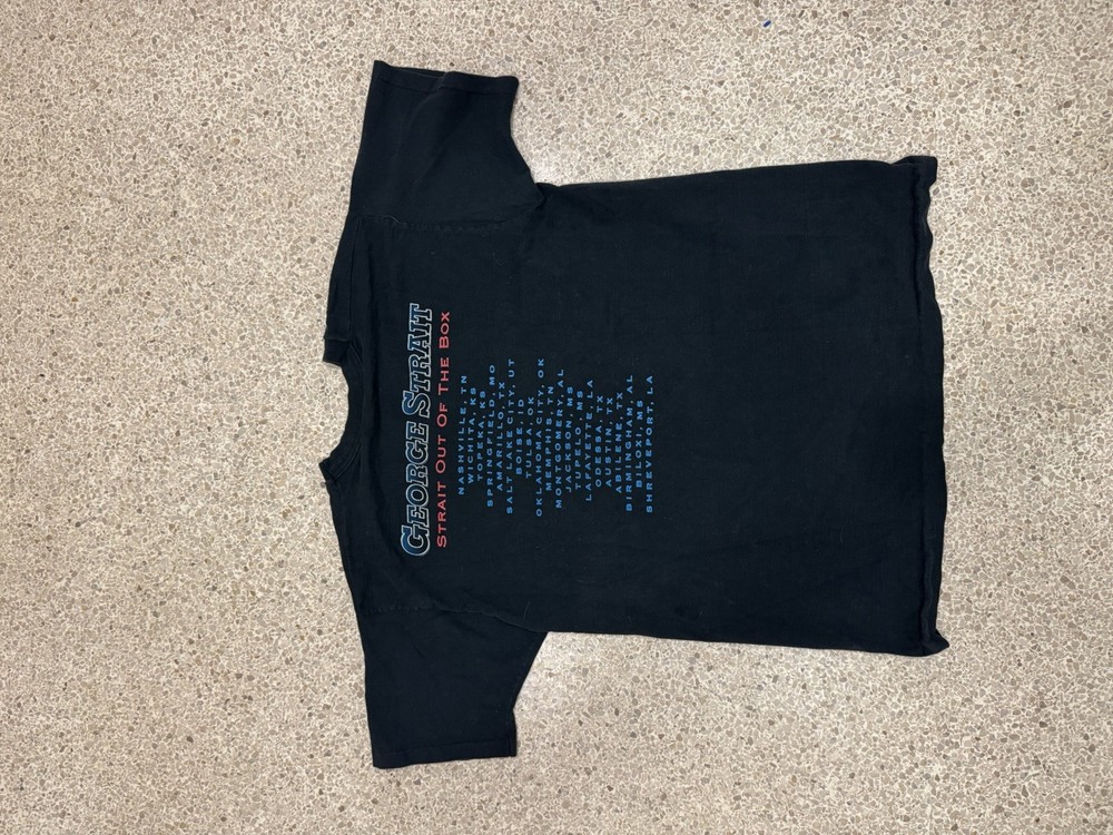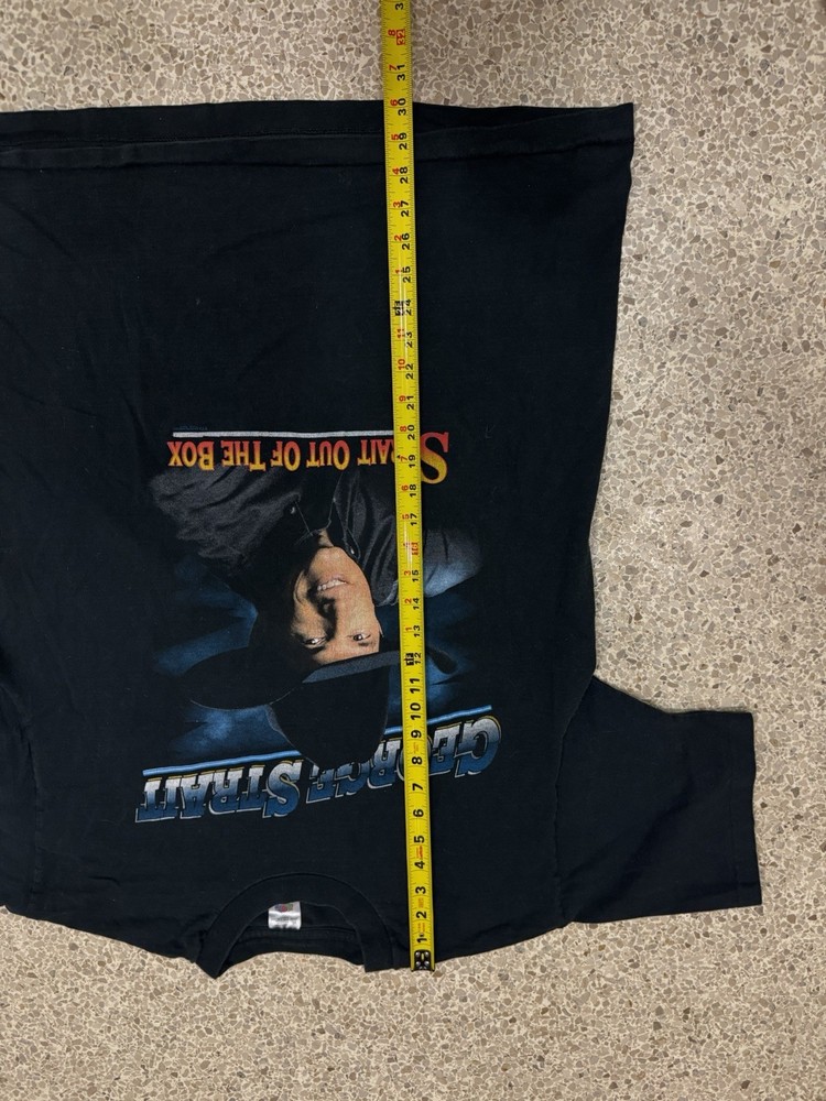 Vintage George Strait concert t-shirt from the Strait Out of the Box tour featuring front portrait graphic and full back tour dates. Printed on a Fruit of the Loom tag with classic early 2000s fit and feel. Pre-owned vintage condition with light wear consistent with age. A must-have for country music fans and vintage tee collectors. • Size XL • Black cotton tee • Front & back graphics • Original tour merchandise