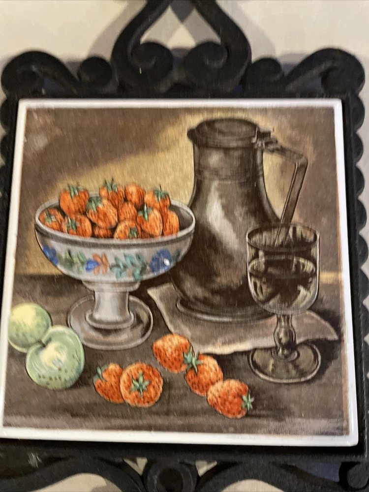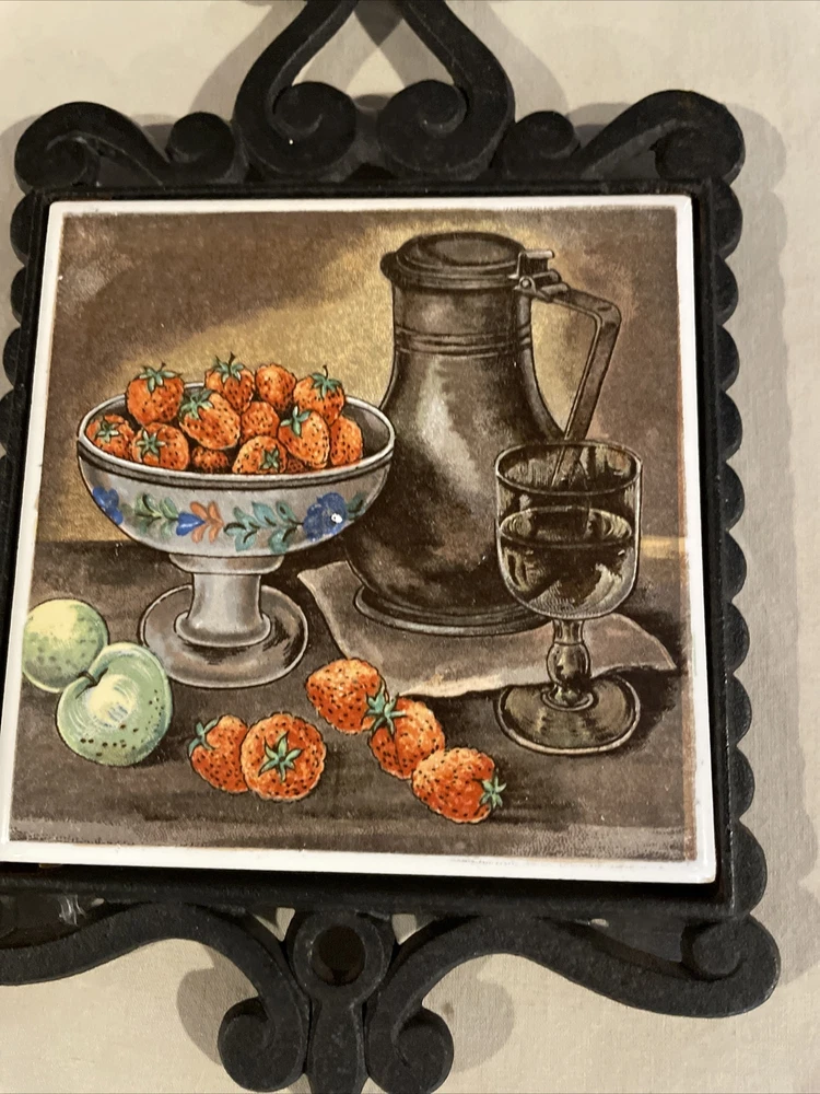 HomeVintage Gift Gallery Trivet Cast Iron and Ceramic Fruit Bowl Tile Made In Japan
