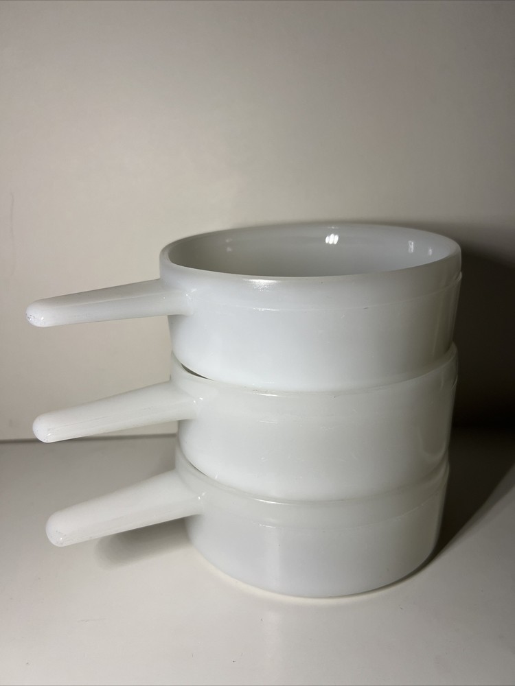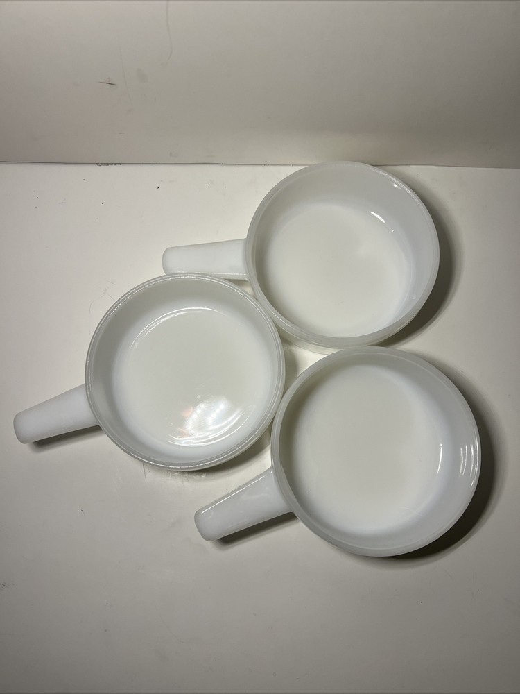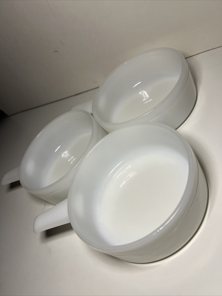 Lot of 3 Vintage Jeanette Milk Glass Bowls with handles in great condition. All bowls have no stains, cracks or chips. ***Please review all photos before purchasing due to bowls having some very mild signs of wear due to age, use and vintage nature.***