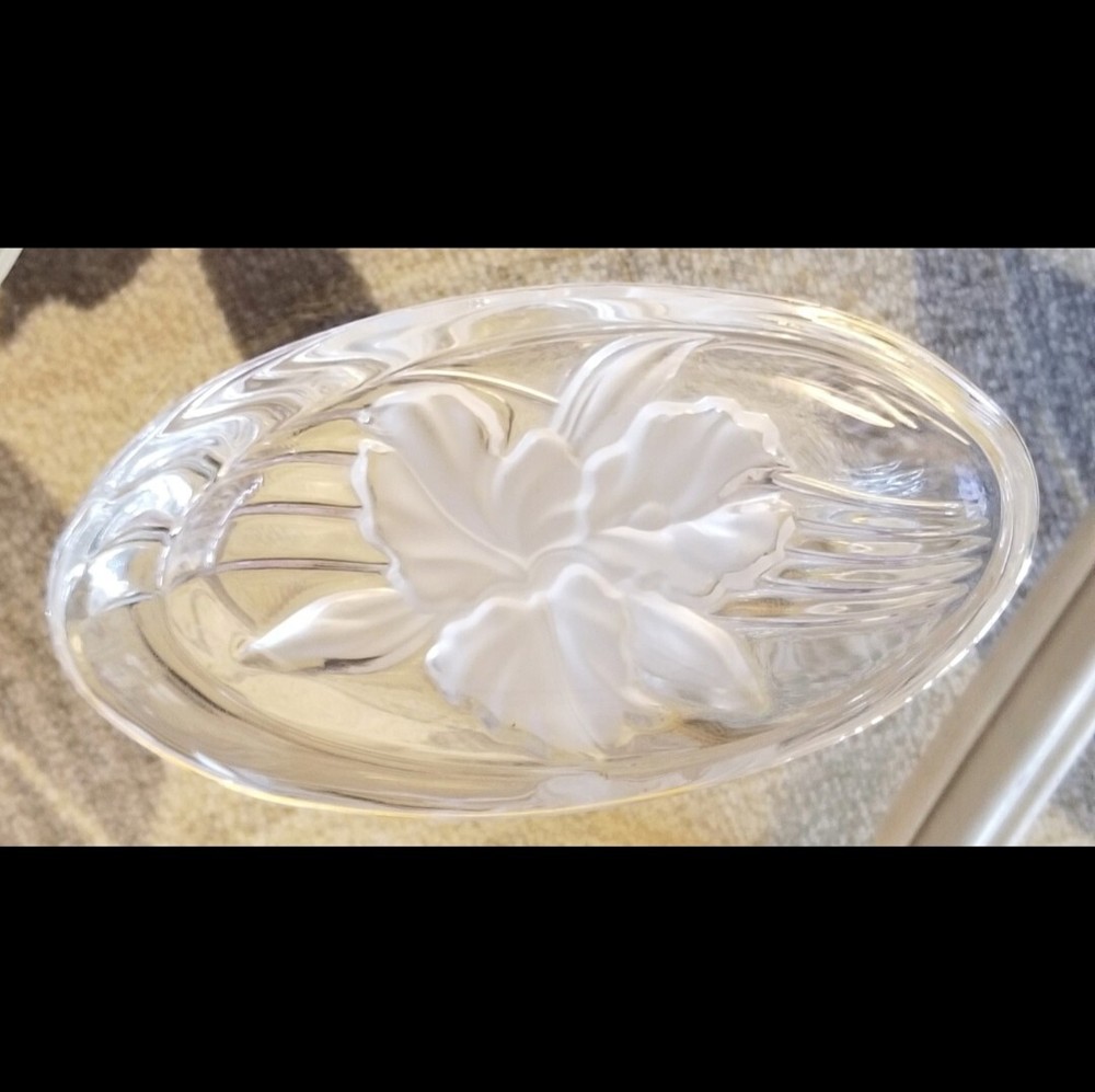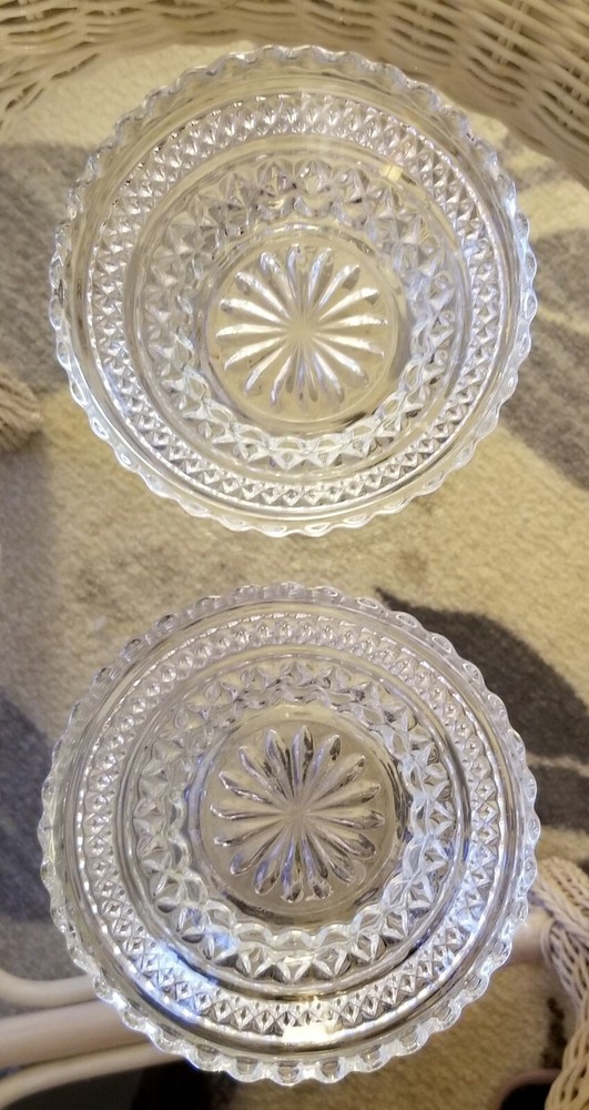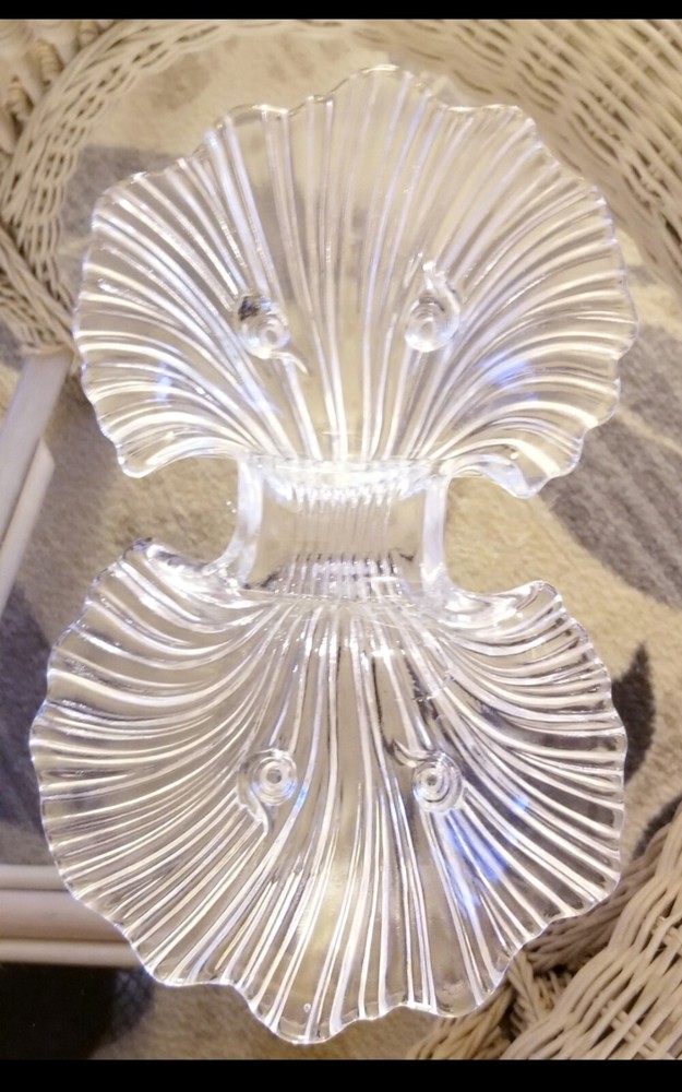 Vintage Glass Trinket Dishes. #1 Fancy 5.5" candy dishes 2 available please specify both if purchasing more than one no flaws mint condition. #2 D ouble leaf dual glass candy dish 11"x 6.5" has mini fine hairline crack bottom blends barely noticeable when empty, no leakage, dish is decorative and usable . #3 Vintage collectable oval frosted floral iris glass trinket dish no flaws mint condition. #4 Vintage sawtooth dual eared trinket dish no flaws mint condition. #5 Vintage sawtooth deco ashtray trinket dish no flaws. #6 Vintage collectable 1960's starburst ashtray trinket dish mint no flaws. Please note item number when placing order thank you.