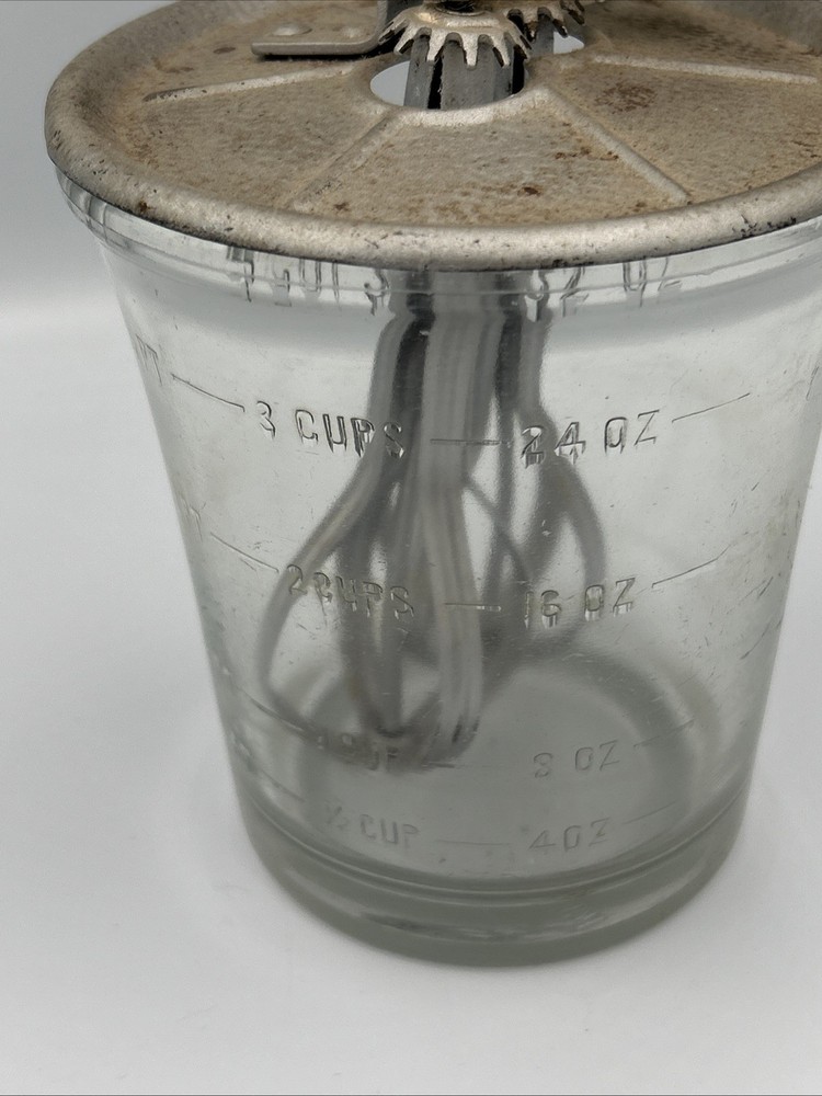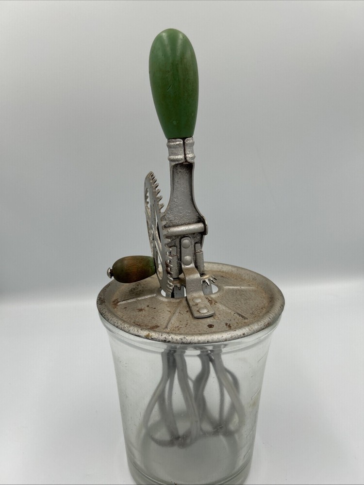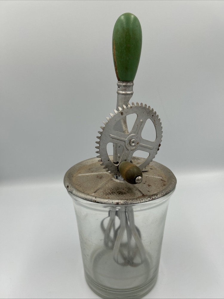 This vintage hand crank egg beater features a clear glass jar with a ribbed pattern, a metal lid with exposed gear mechanism, and a green handle knob. Designed for manual mixing, it reflects classic early kitchenware craftsmanship and makes a great collectible, display piece, or rustic farmhouse décor item. The item is undated, with no visible manufacturer markings or stamped year. The mechanical components appear intact, and the piece shows age-related wear consistent with vintage kitchen tools. Item comes as is. Please review photos before purchase and feel free to ask any questions. Condition Used. Shows visible wear consistent with age, including surface patina and discoloration on metal components. Glass jar appears intact with no major cracks noted. Specifications Item Type: Hand Crank Egg Beater / Mixer Era: Vintage (undated) Material: Glass jar, metal lid and mechanism Handle: Green handle knob Pattern: Ribbed glass Operation: Manual hand crank Features Manual crank-operated mixing mechanism Ribbed glass jar design Exposed metal gear assembly Classic vintage kitchen aesthetic Suitable for display or collection Shipping Ships within 2 business days Carefully packaged Tracking uploaded promptly Smoke-free storage environment Notes Undated vintage item. Surface wear and patina present on metal components. No maker’s marks or production date observed.