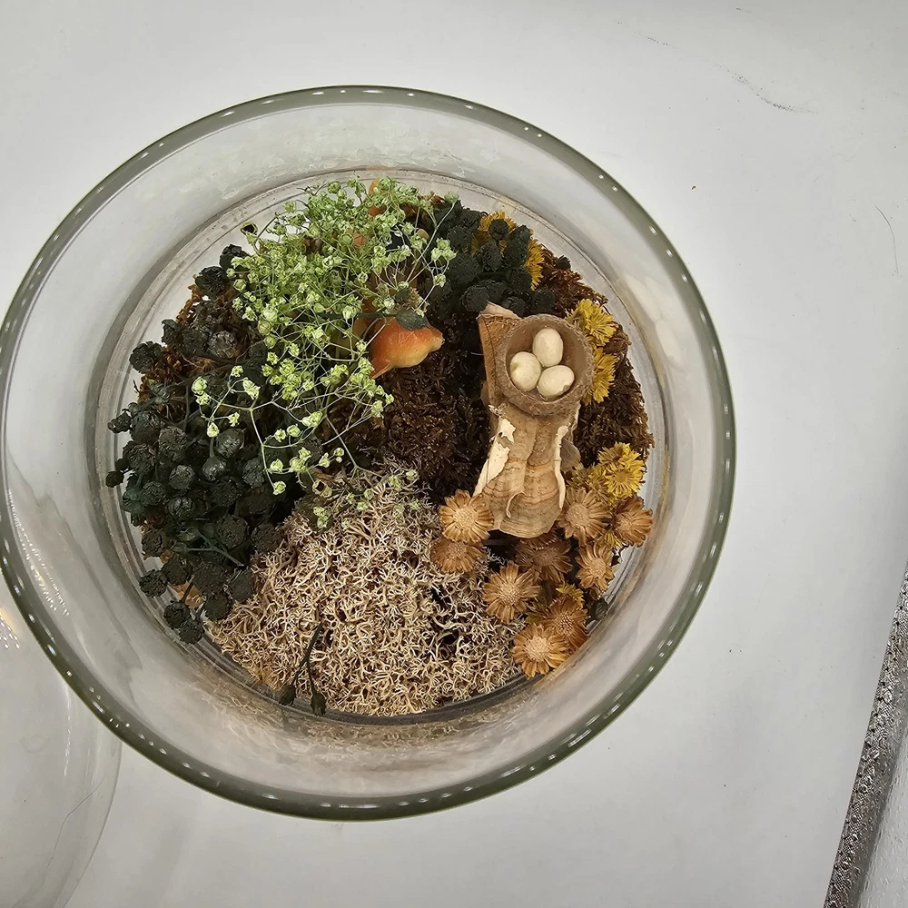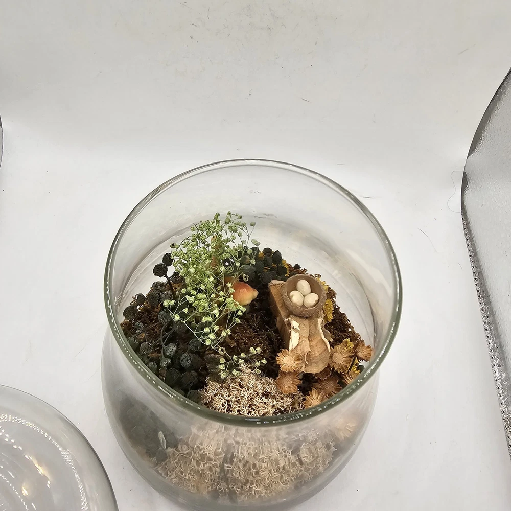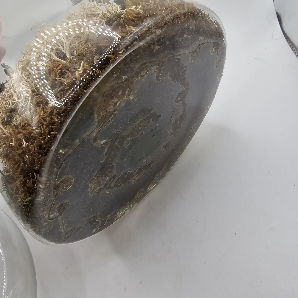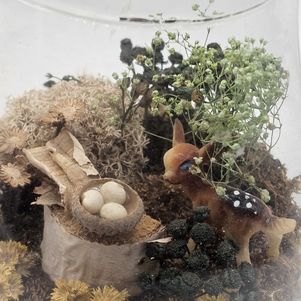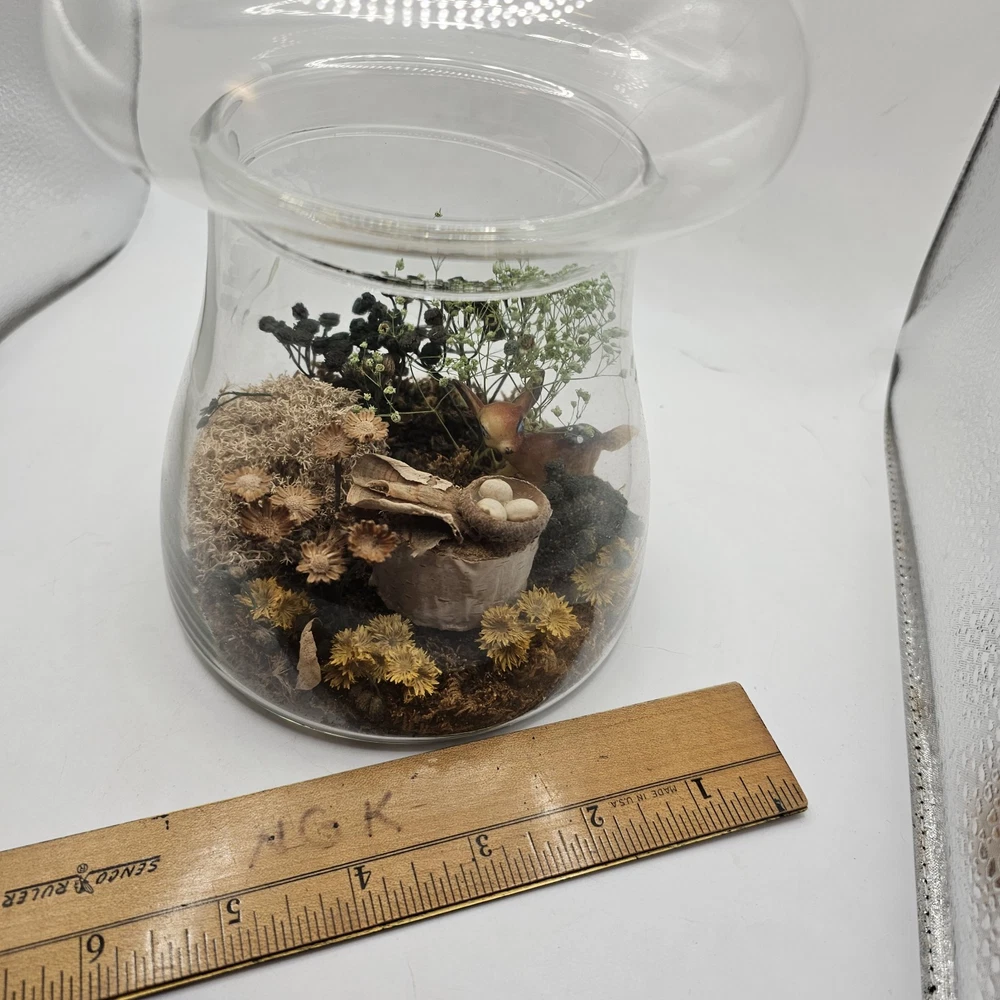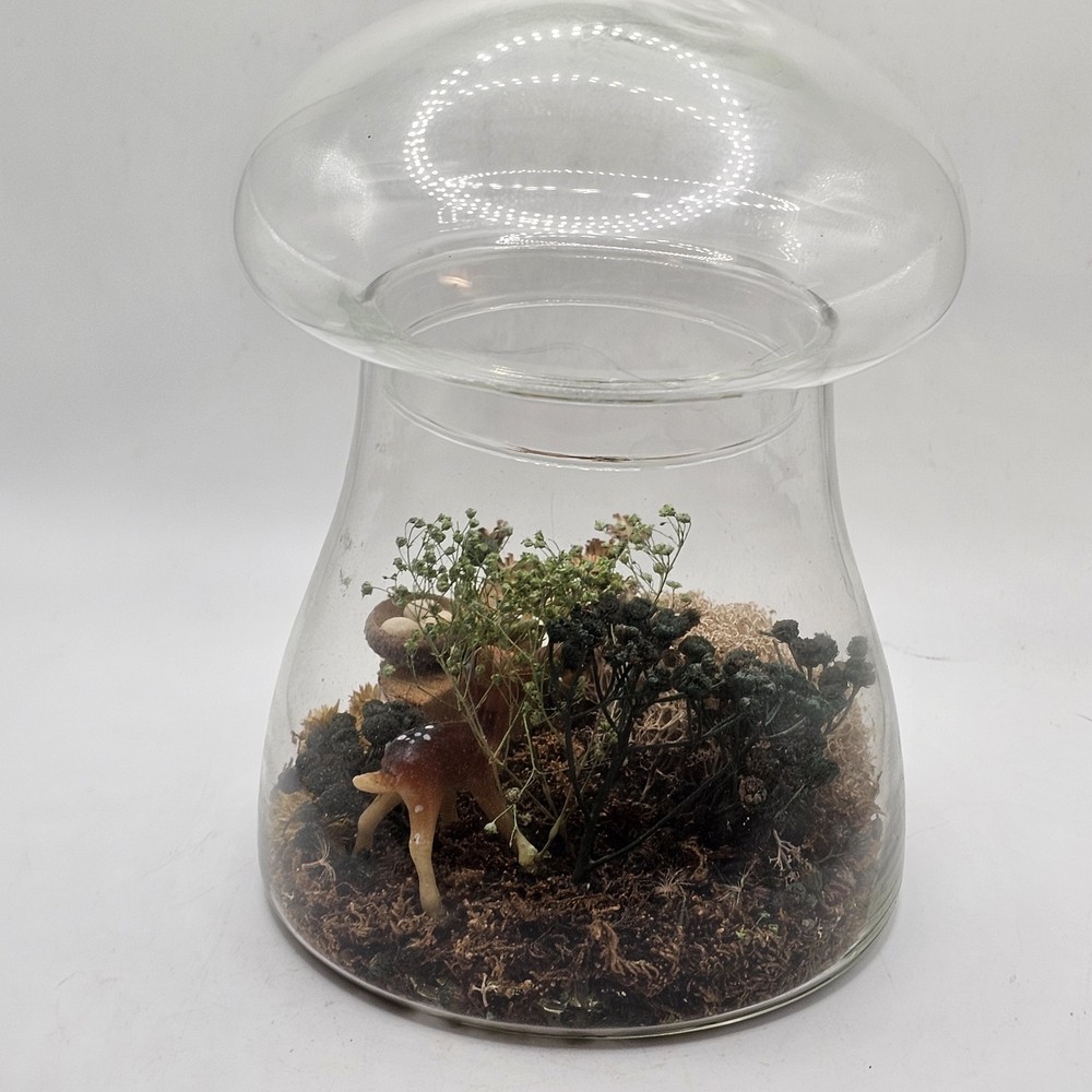 This vintage collectible is a glass mushroom adorned with woodland terrarium deer and flowers. The mushroom is made of multi-color glass and features intricate detailing. Perfect for adding a whimsical touch to any decorative display. The jar has a lid. See photos for wear