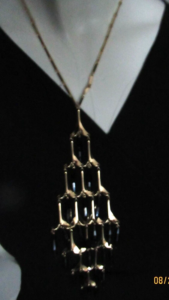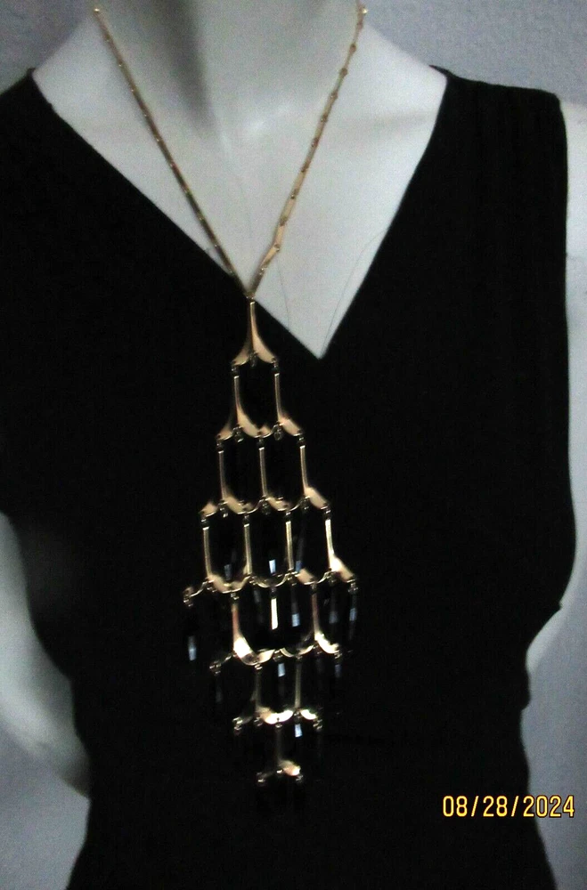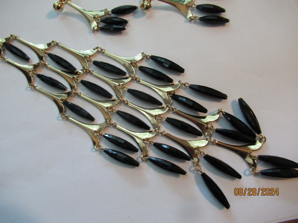 28.Make a bold fashion statement with this vintage gold tone black lucite necklace and earring set. The set includes a stunning necklace that features a unique design that will catch everyone's eye. The earrings are also a part of the set and are crafted to perfection. The jewelry set is perfect for anyone who wants to add a touch of vintage to their wardrobe. The set is crafted with high-quality materials and is sure to last for years to come. This Estate jewelry set is a must-have for anyone who wants to make a statement with their fashion choices.