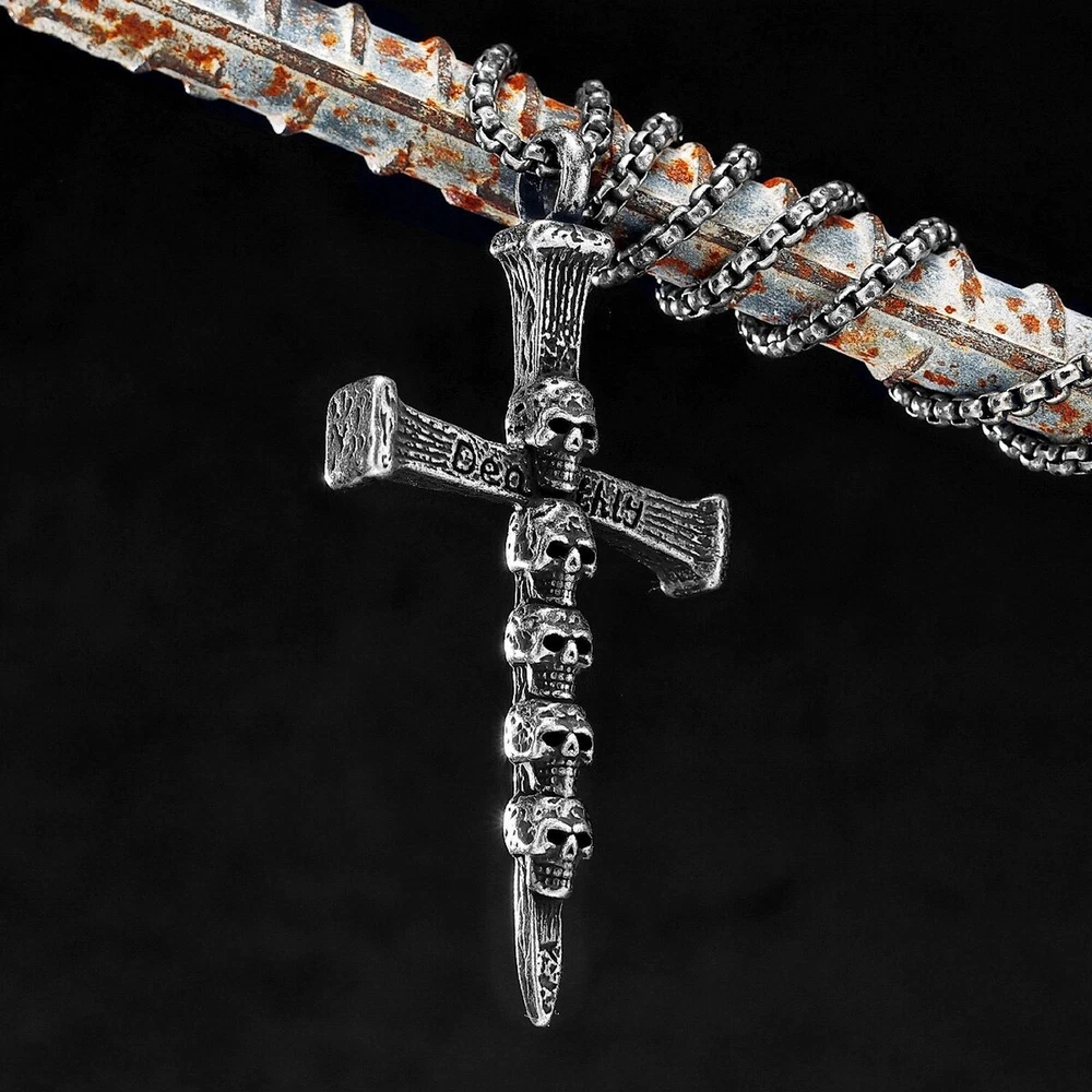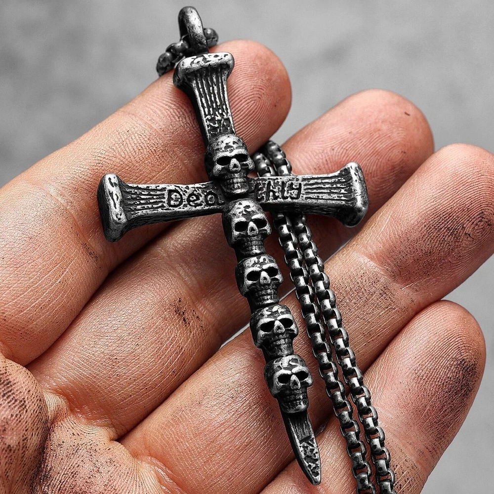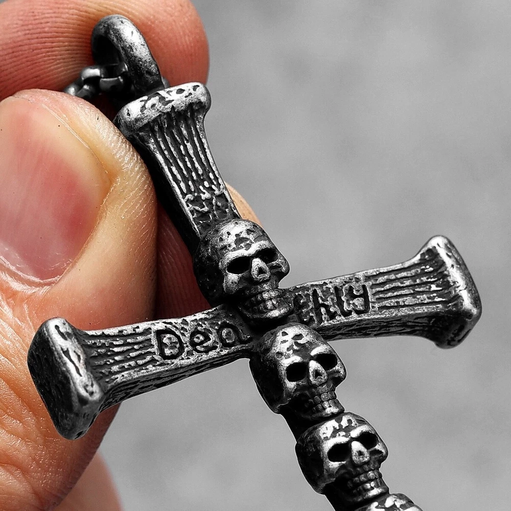 Vintage Gothic 5 Skull Cross Stainless Steel Halloween Unisex Necklace Chain Pendant