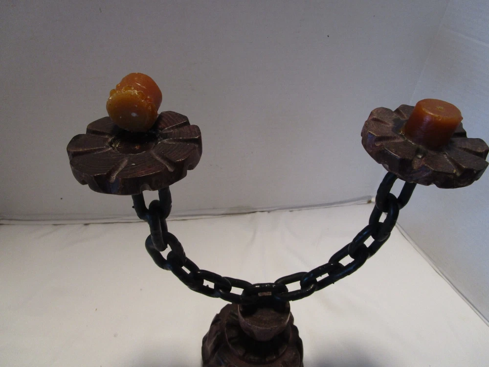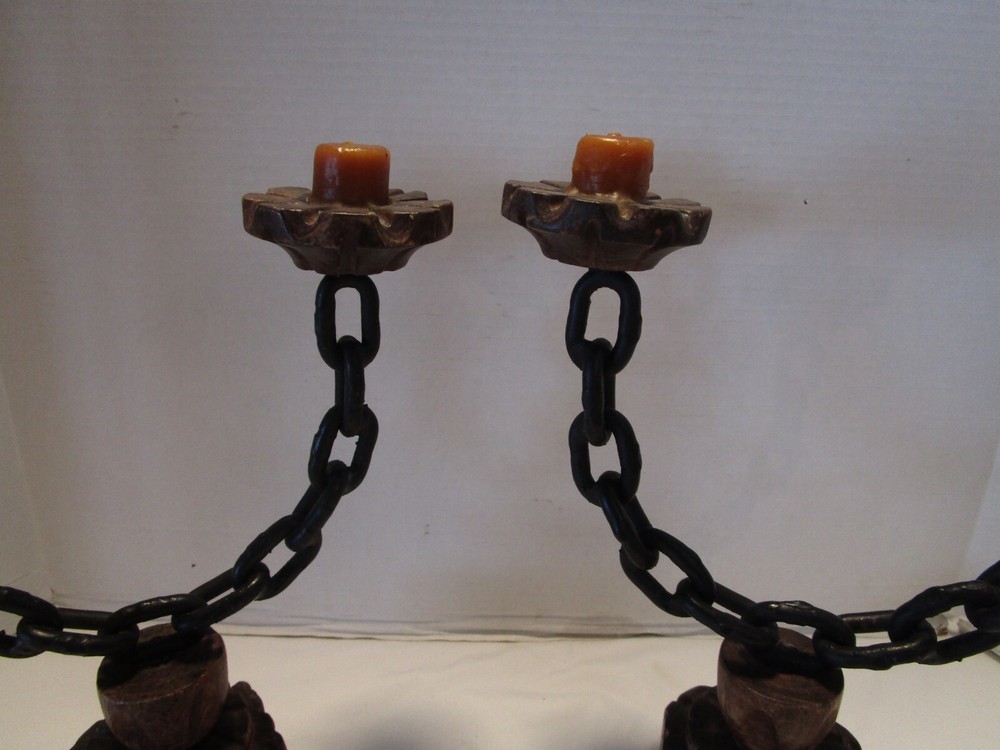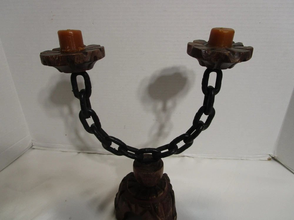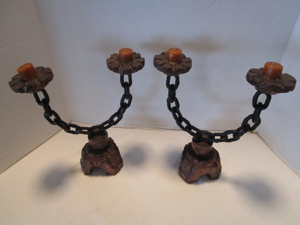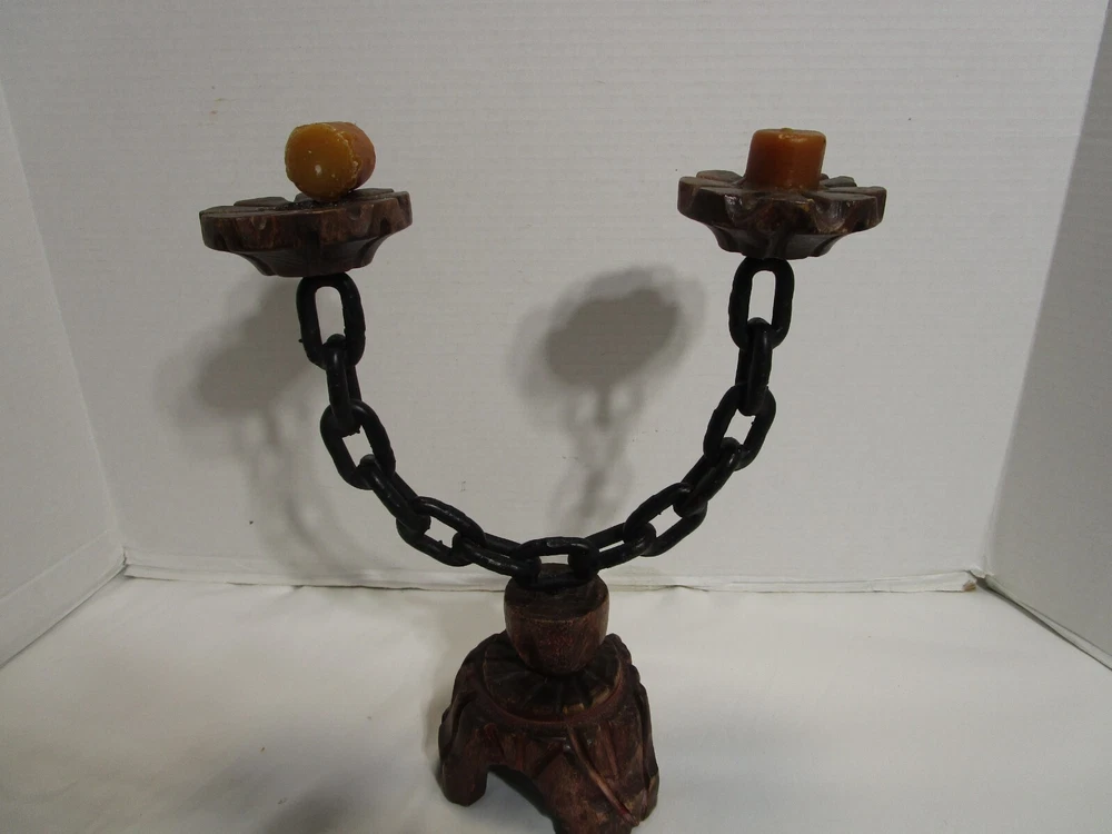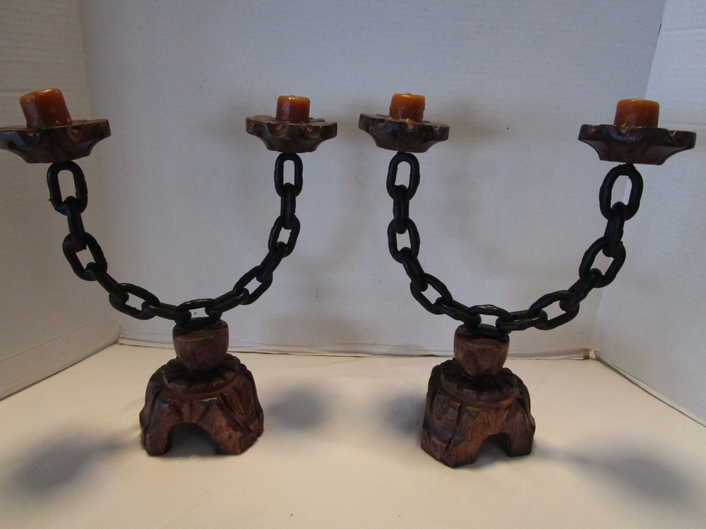 Description: 8/16/14/12/book # 507 Mid Century Modern Spanish- Mediterranean Gothic Medieval carved wood and metal set of 2 tabletop candelabras. Each has a 2-arm iron chain holding up candleholder The base is carved wood, the same as the cup’s/ candleholders. The chains are welded to stay up. They are not exactly identical as they are handcrafted in the 1960’s, not machine-made mass production. Each is approx. 13” tall x 10.5” wide and 4.5” deep Unpacked they weigh 3.75 pounds The candles are decorative only- I have a few pictures showing that you can use other candles if you want. Nice retro used condition- appropriate patina for their age, as found. Please zoom and view all pictures for more details as they are part of the description. I DO MY BEST TO DESCRIBE EVERY LISTING BUT I AM NOT AN EXPERT AND ITEMS ARE SOLD “AS IS”. My idea of great/good may be different than yours, so EXAMINE PHOTOS CAREFULLY since they are binding and a supplement to the word description in case I should miss something. If I fail to mention something, it does not qualify as “item not as described” if it shows in my pictures. EACH PHOTO IS WORTH A THOUSAND WORDS AND THEY ARE OF THE EXACT ITEM YOU WILL RECEIVE. RETURN POLICY: Returns are acceptable ONLY if the item doesn’t match the description, is defective, or grossly misrepresented. All sales are final. THIS MEANS I DO NOT ACCEPT RETURNS for FIT, SIZING, COLOR ISSUES, OR BUYER'S REMORSE. Please zoom and view ALL pictures for more details as they are part of the description. Email me with any questions you may have. Please note: Buyer pays ALL return shipping and fees. · FEEDBACK I do not leave feedback until the end of a transaction. The transaction is considered over once I receive feedback from you confirming that you have received it and expressed satisfaction with it. If you are unsatisfied with your purchase, please contact me before leaving a neutral or negative feedback- so I can fix the issues. Thanks again for shopping at our eBay store and look forward to serve you. · · Email me with any questions. · No reasonable offer refused.