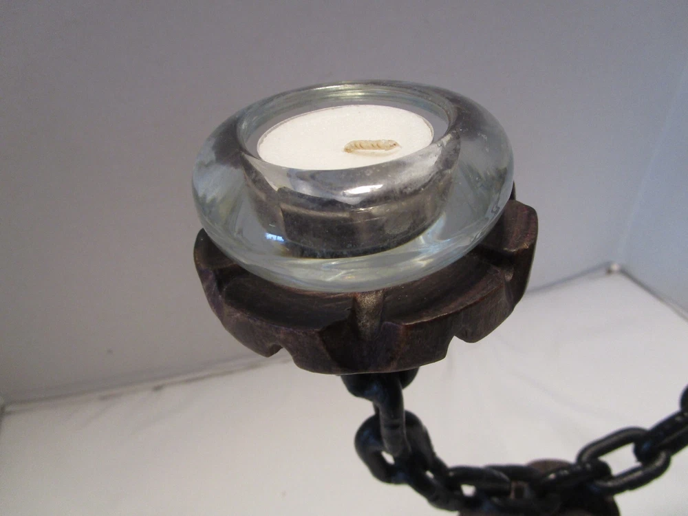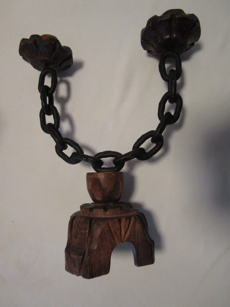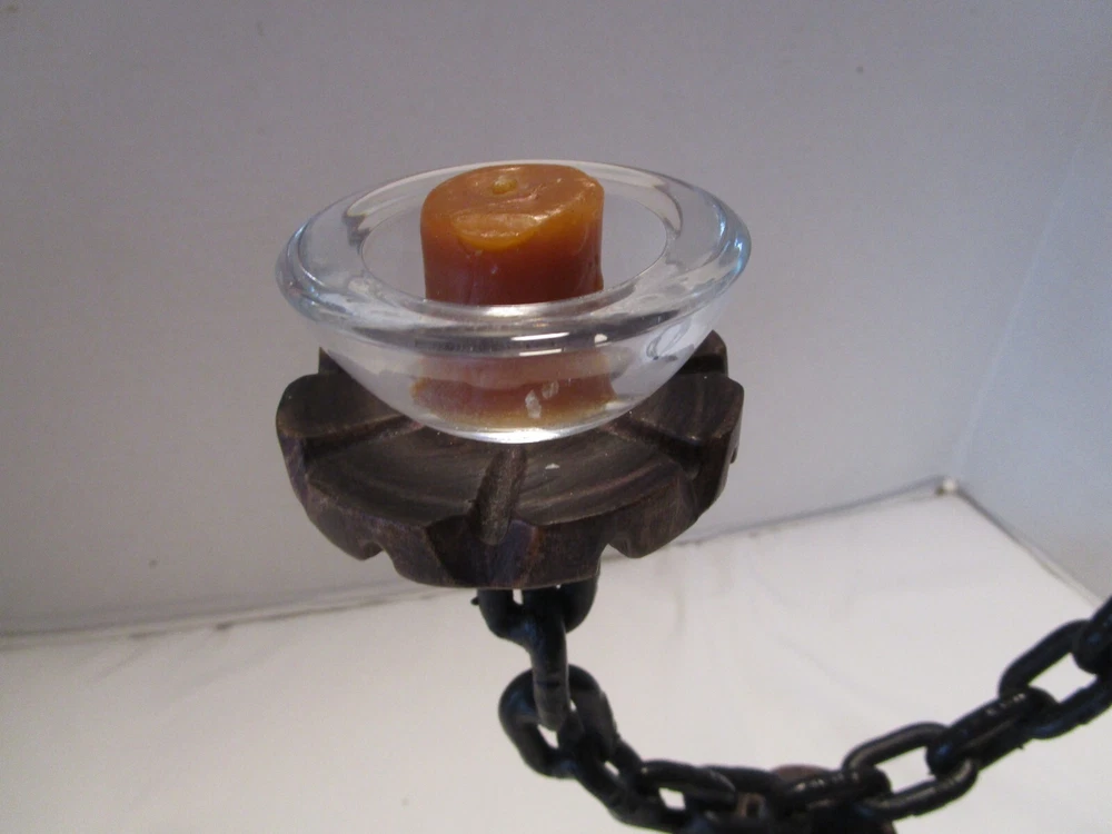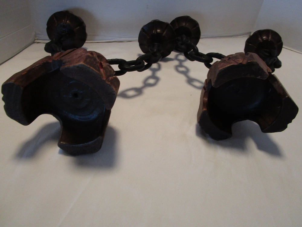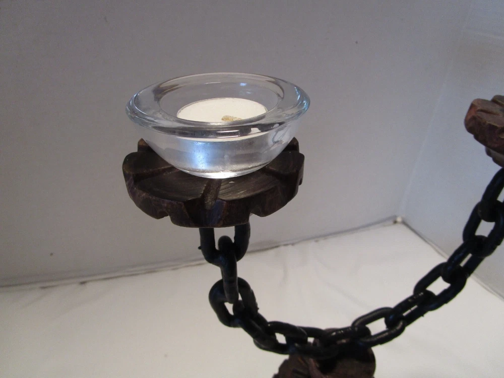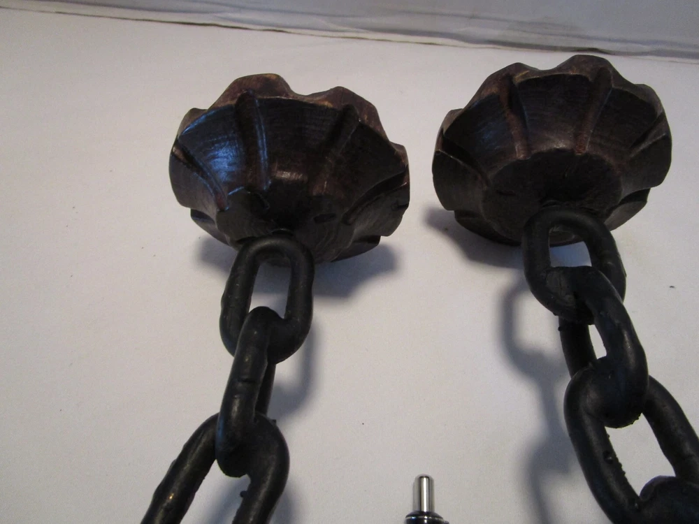 Description: 8/16/14/12/book # 507 Mid Century Modern Spanish- Mediterranean Gothic Medieval carved wood and metal set of 2 tabletop candelabras. Each has a 2-arm iron chain holding up candleholder The base is carved wood, the same as the cup’s/ candleholders. The chains are welded to stay up. They are not exactly identical as they are handcrafted in the 1960’s, not machine-made mass production. Each is approx. 13” tall x 10.5” wide and 4.5” deep Unpacked they weigh 3.75 pounds The candles are decorative only- I have a few pictures showing that you can use other candles if you want. Nice retro used condition- appropriate patina for their age, as found. Please zoom and view all pictures for more details as they are part of the description. I DO MY BEST TO DESCRIBE EVERY LISTING BUT I AM NOT AN EXPERT AND ITEMS ARE SOLD “AS IS”. My idea of great/good may be different than yours, so EXAMINE PHOTOS CAREFULLY since they are binding and a supplement to the word description in case I should miss something. If I fail to mention something, it does not qualify as “item not as described” if it shows in my pictures. EACH PHOTO IS WORTH A THOUSAND WORDS AND THEY ARE OF THE EXACT ITEM YOU WILL RECEIVE. RETURN POLICY: Returns are acceptable ONLY if the item doesn’t match the description, is defective, or grossly misrepresented. All sales are final. THIS MEANS I DO NOT ACCEPT RETURNS for FIT, SIZING, COLOR ISSUES, OR BUYER'S REMORSE. Please zoom and view ALL pictures for more details as they are part of the description. Email me with any questions you may have. Please note: Buyer pays ALL return shipping and fees. · FEEDBACK I do not leave feedback until the end of a transaction. The transaction is considered over once I receive feedback from you confirming that you have received it and expressed satisfaction with it. If you are unsatisfied with your purchase, please contact me before leaving a neutral or negative feedback- so I can fix the issues. Thanks again for shopping at our eBay store and look forward to serve you. · · Email me with any questions. · No reasonable offer refused.