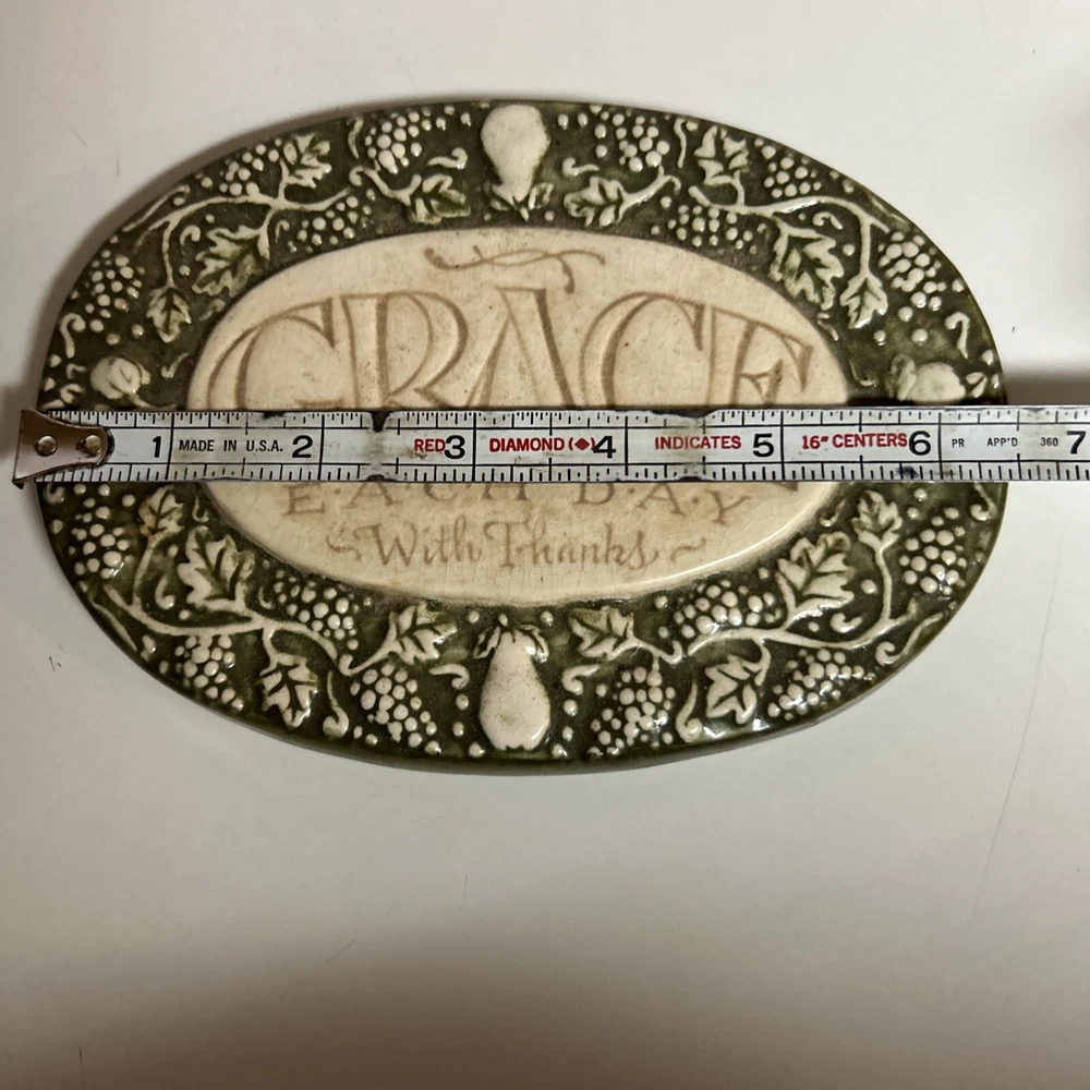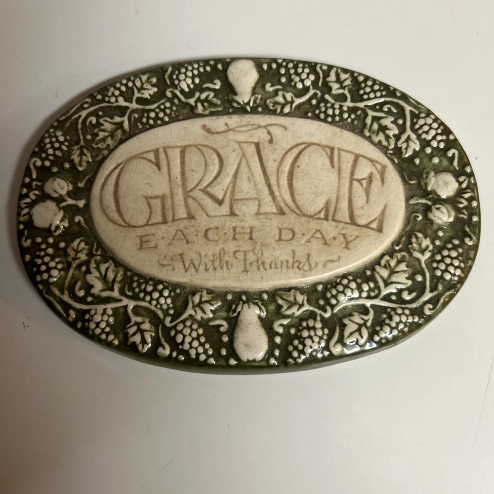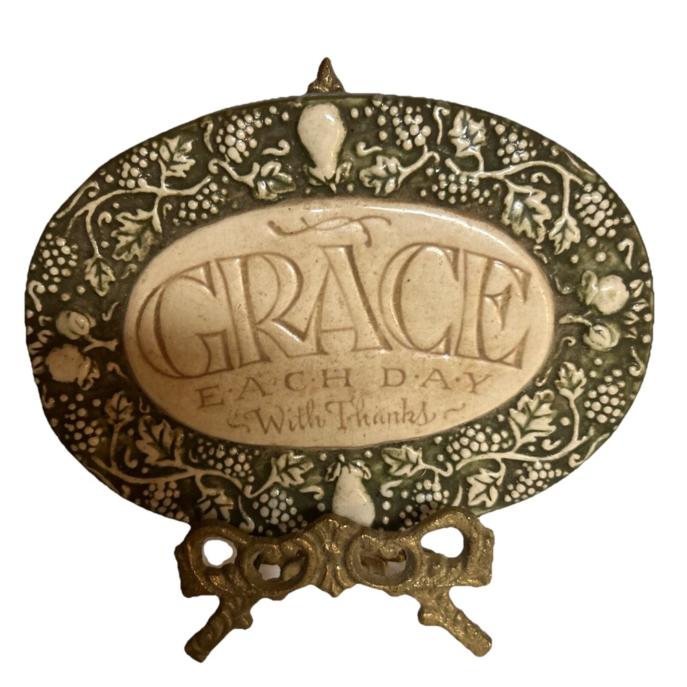 This vintage Amscan plaque and stand is a beautiful addition to any room. With a classic style and a 3D effect, it features hand-painted vines and fruit in olive green, cream gold, and glossy finishes. The plaque is small, measuring 4 1/2" in height and 6 1/2" in width, and it comes with a hanging feature for easy display. The plaque is perfect for anyone who loves art, inspirational words, or religious themes. It is made of ceramic material and can be cleaned with a damp cloth. The plaque is not personalized and does not require any additional parts. Its model name is "Grace" and it weighs 10.5 ounces. This plaque is a great way to show your thankfulness and add a touch of cottagecore, Victorian, or momcore vibes to your home. Excellent condition Comes with stand or can be hung on wall