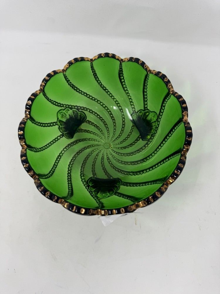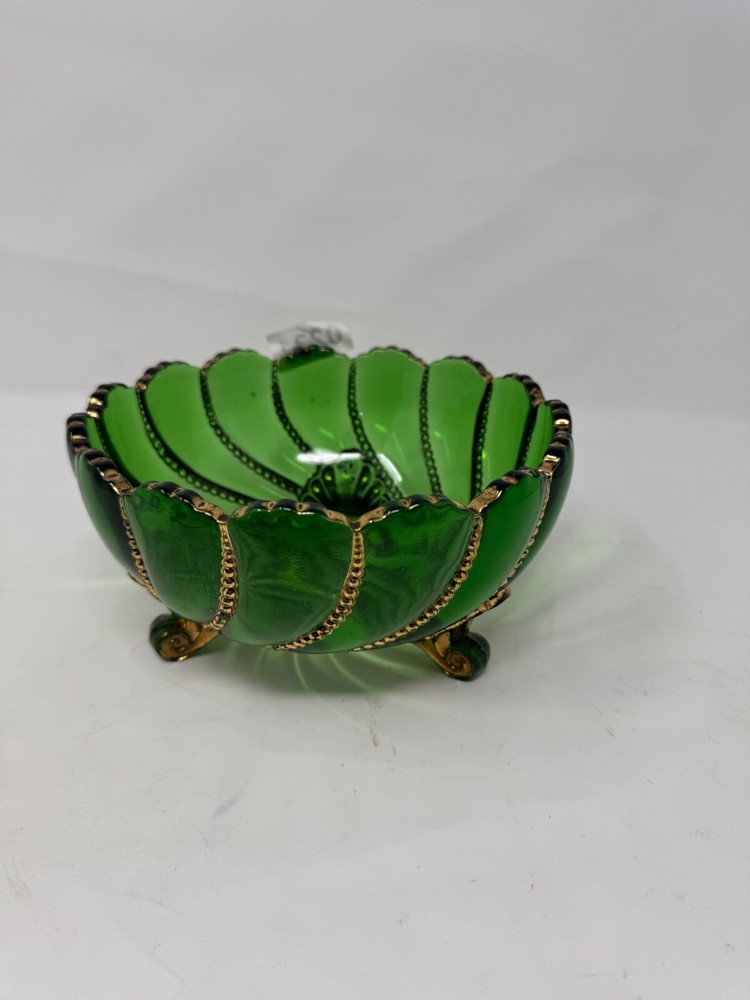 This vintage green glass footed bowl is a stunning decorative piece featuring a swirl pattern with gold accents and raised beaded detailing . The bowl sits on three ornate feet with gold-painted designs, adding an elegant touch to any space. ๐ Key Features: Material: Green glass with gold-painted details Size: 7.5โ wide x 4โ tall Condition: Excellent vintage condition with minor wear on gold detailing Perfect for: A centerpiece, candy dish, or trinket bowl Style: Victorian, Mid-Century, Bohemian A must-have for glassware collectors, vintage home decor lovers, and those who appreciate fine craftsmanship.