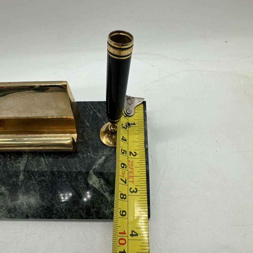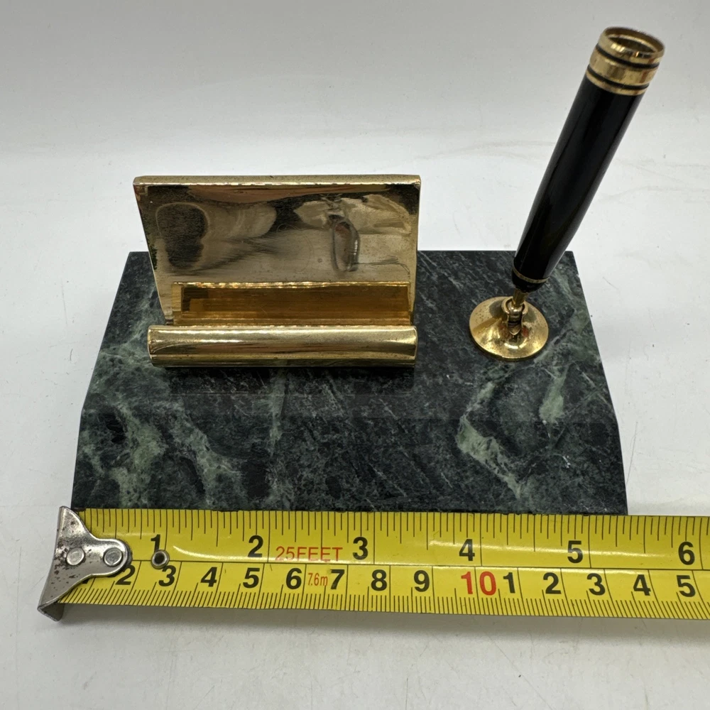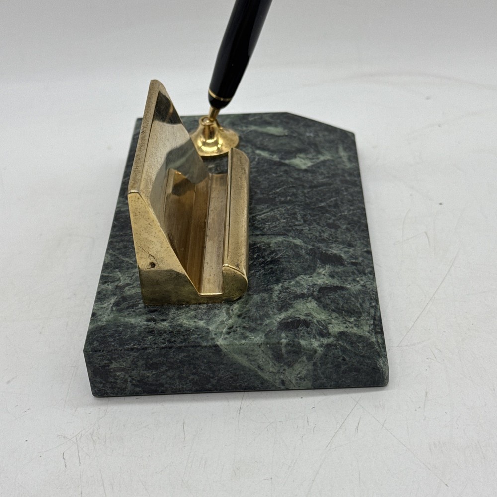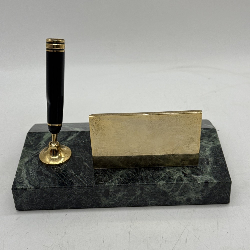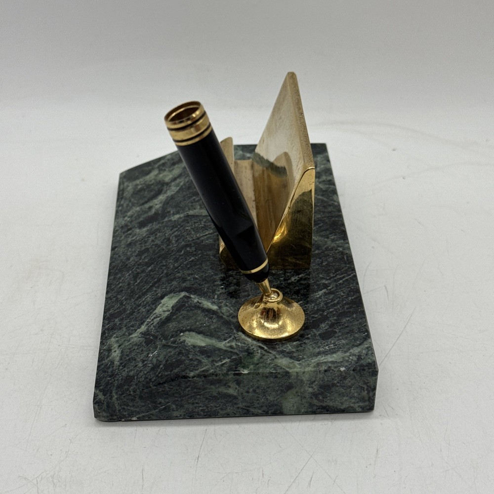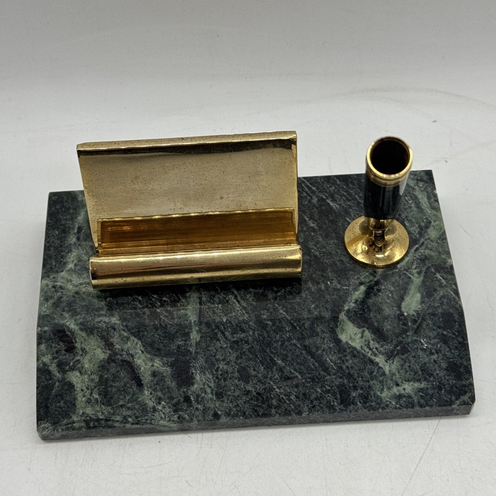 This vintage desk set from Taiwan features a charming green marble base with a brass business card and pen holder. The set exudes a sense of nostalgia and elegance, making it a unique addition to any office or collector's display. Crafted with quality materials and a touch of retro charm, this desk set is a functional and stylish piece for any workspace.