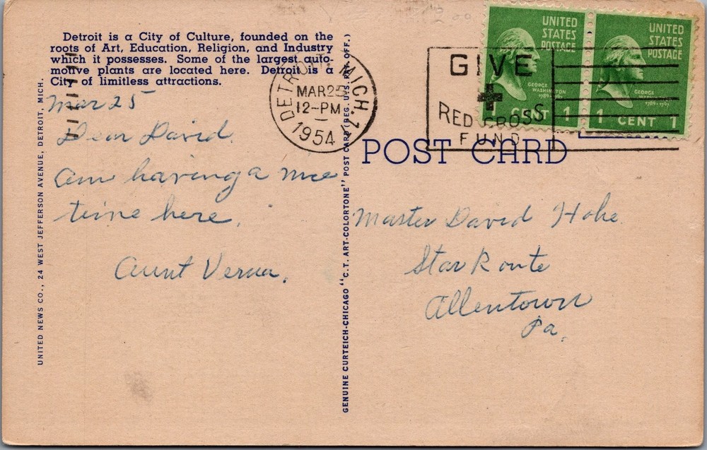 This charming vintage linen postcard features a colorful "Greetings from Detroit Michigan" design, showcasing iconic Detroit landmarks within the large block letters. The card highlights notable architectural and cultural sites of Detroit, including prominent buildings and bridges, capturing the city's rich industrial and cultural heritage. Printed on a textured linen cardstock, this postcard exemplifies mid-20th century American postcard production known for vibrant colors and detailed lithography. Postmarked in 1954, the postcard offers a glimpse into Detroit's history as a thriving city of culture, art, education, and industry during the post-war era. The reverse side contains a handwritten message and two 1-cent George Washington stamps, adding to its collectible appeal. Produced by Genuine Curteich-Chicago "C.T. Art-Colortone," a well-known publisher of high-quality linen postcards, this piece is a great collectible for postcard enthusiasts and those interested in Detroit memorabilia.