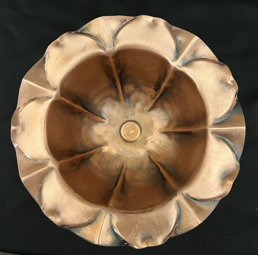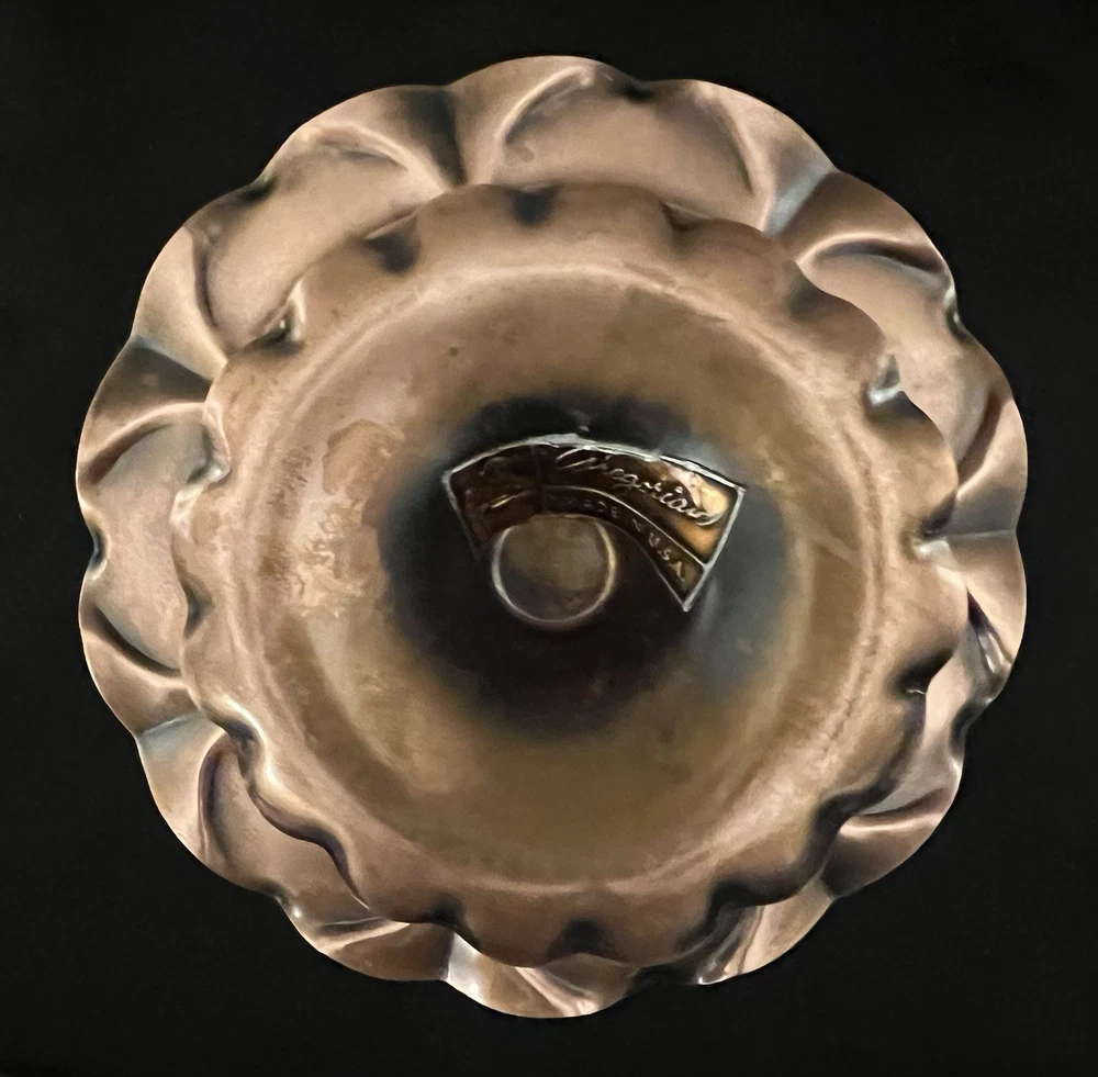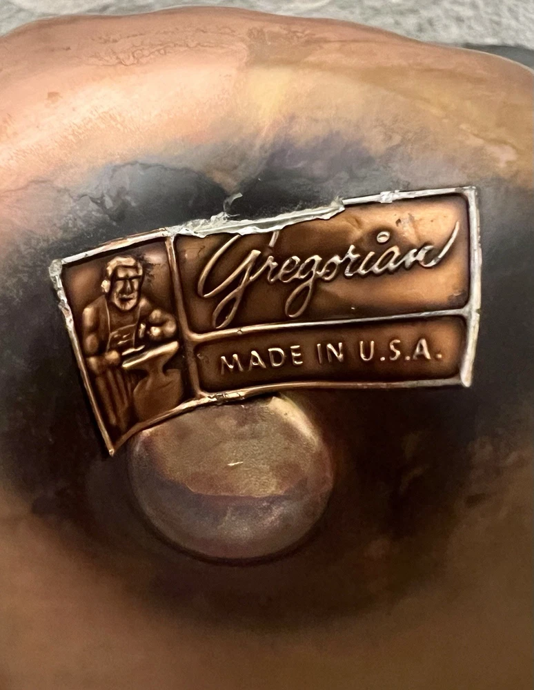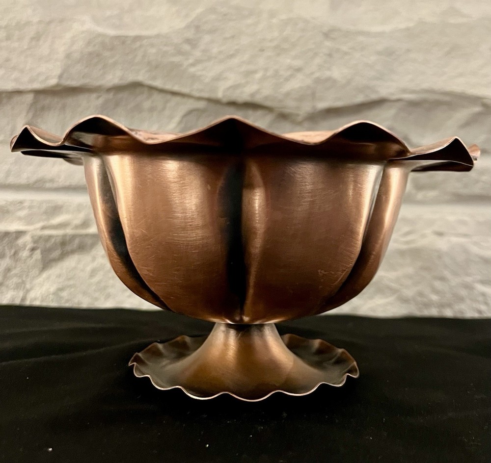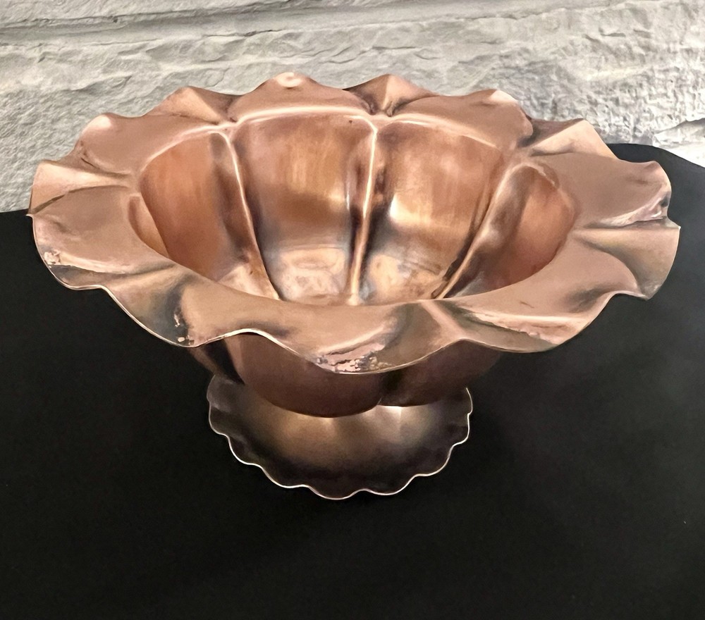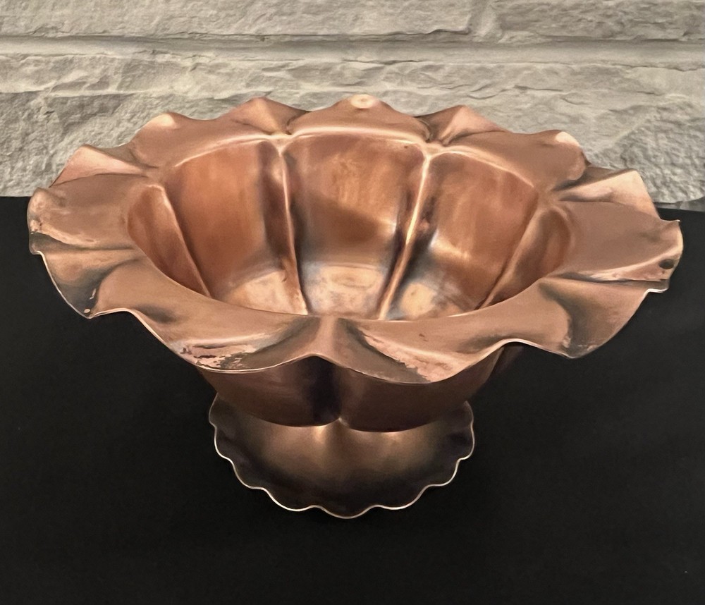 This vintage Gregorian copper hand hammered pedestal bowl is a stunning piece of metalware that exudes craftsmanship and artistry. The bowl features a beautiful floral design that is perfect for display in any space. Measuring 7 inches in diameter, this bowl is a great addition to any collection of copper items. Made in the United States, this handmade bowl is of exceptional quality and is in excellent condition. It is a perfect item for collectors of vintage copperware or those who appreciate the beauty of handcrafted objects. Don't miss out on the opportunity to own this unique and beautiful piece of copper art.