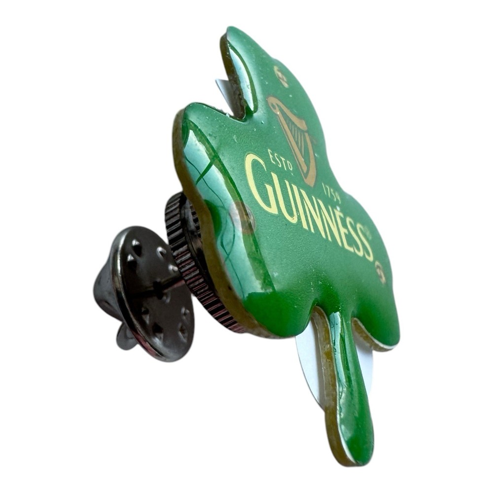 Celebrate your Irish pride or love for Guinness with this vintage Guinness shamrock pin! This green enamel lapel pin features the classic Guinness harp logo and “ESTD 1759” across a vibrant shamrock shape. A fun collector’s item for fans of the iconic Irish beer or St. Patrick’s Day memorabilia. Details: • Size: Approximately 1 inch • Design: Shamrock with Guinness harp logo and branding • Color: Green with gold and cream accents • Backing: Butterfly clutch • Condition: Pre-owned with noticeable surface wear/scratches (see photos)