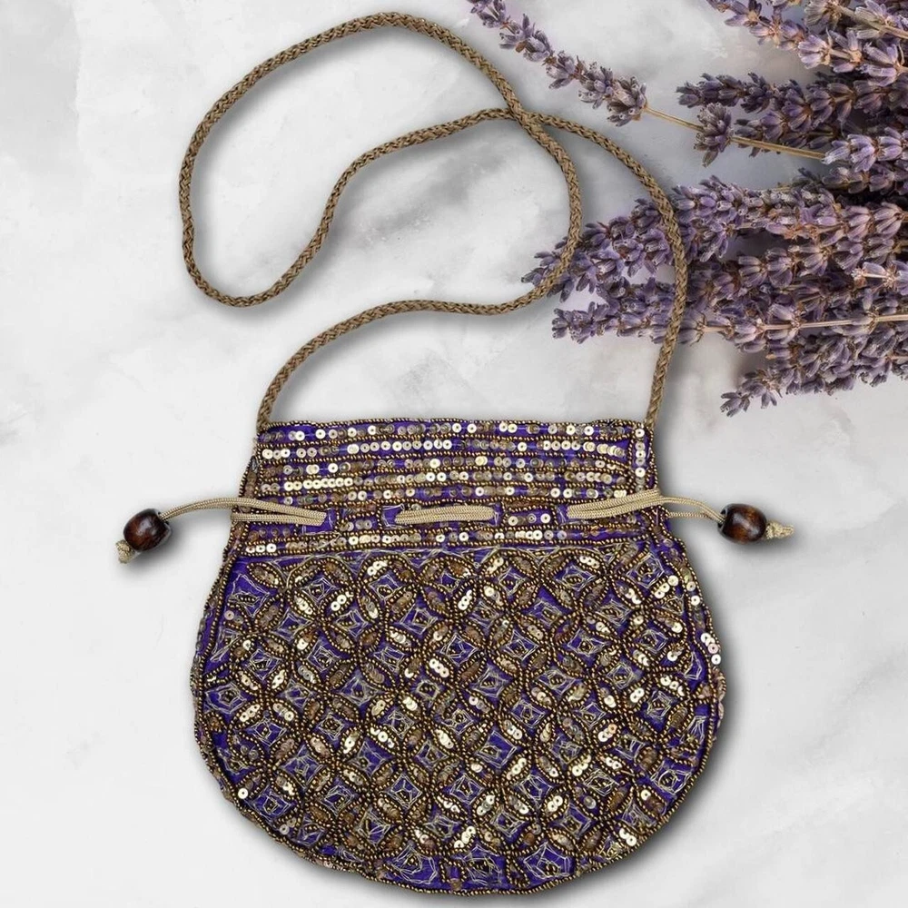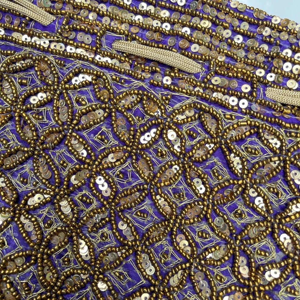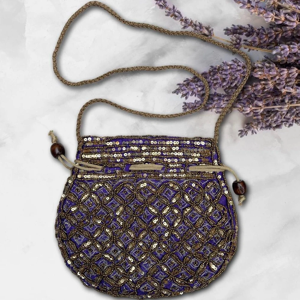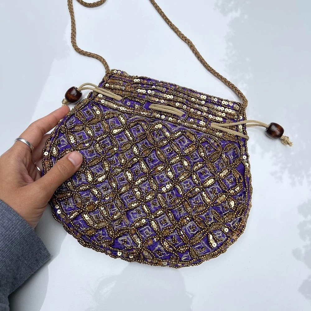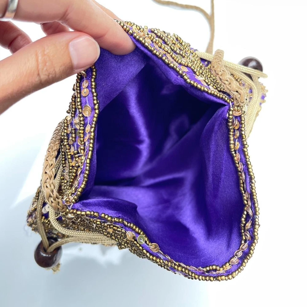 Vintage Beaded Pouch Bag Description: absolutely gorgeous gold tone beaded and sequined pouch bag with pull tie closure and purple satin lining. It’s giving boho gypsy princess. So much more beautiful in person ✨ Condition: excellent condition. Some very slight wear on the strap (pictured). Dimensions: 9”x8”