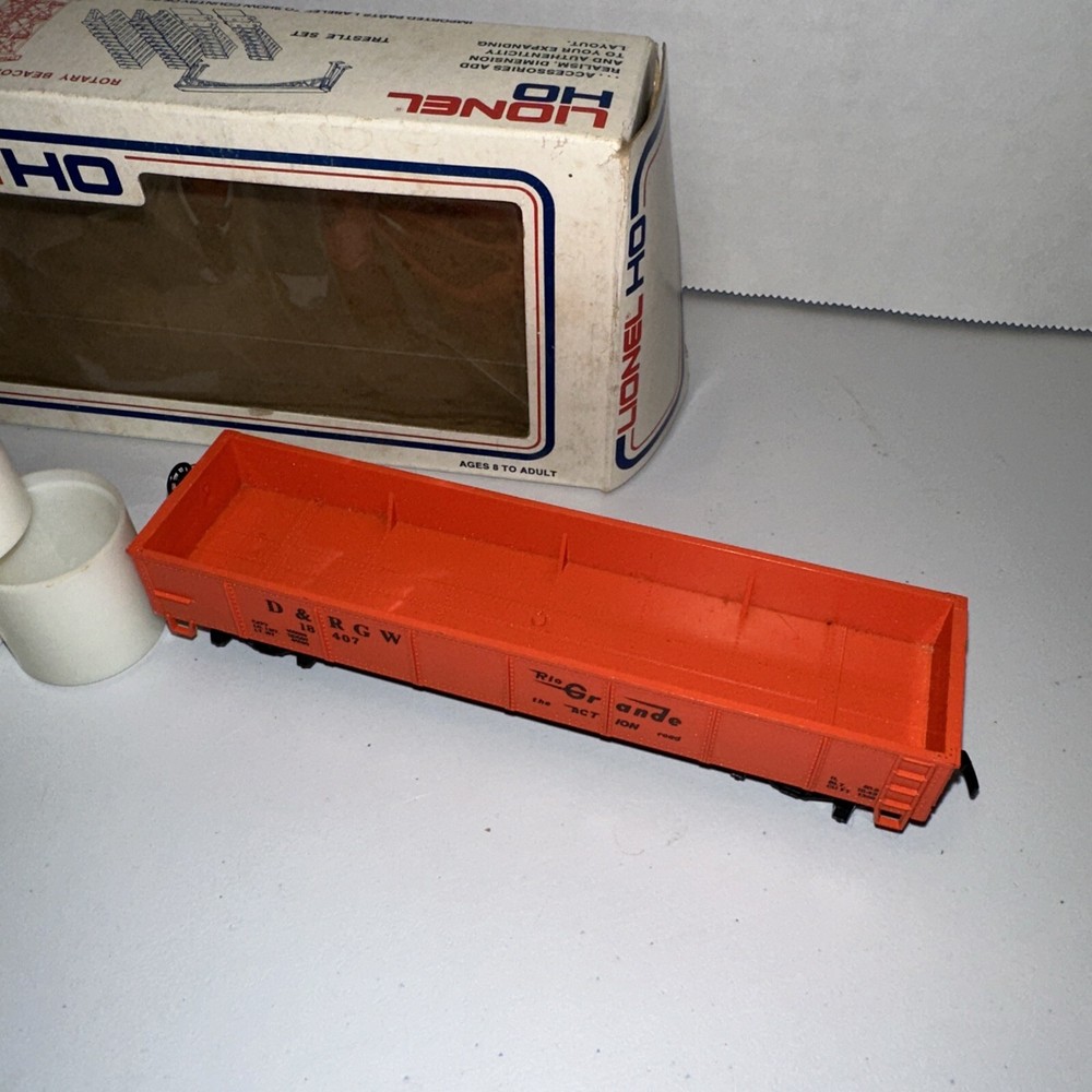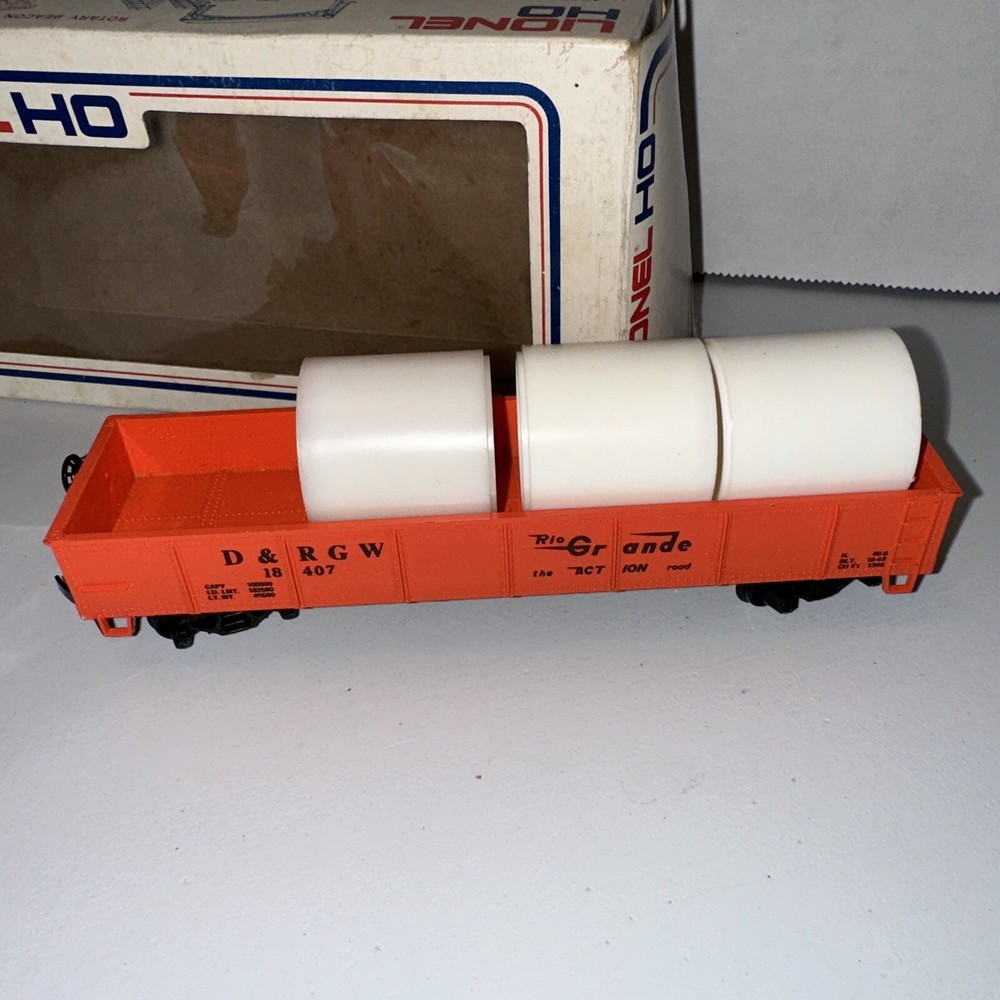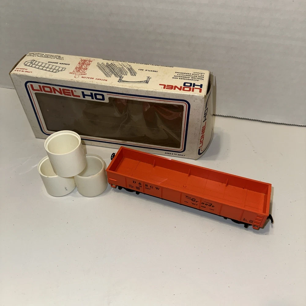 This is a vintage HO scale Lionel open gondola model train car featuring the corporate roadname "Rio Grande" and a steel construction. It includes a load and is designed in a multicolor scheme. The control system is analog, and it is part of the Rio Grande franchise. This HO scale model is a two-rail system with a plastic material construction, suitable for collectors aged 17 years and up.