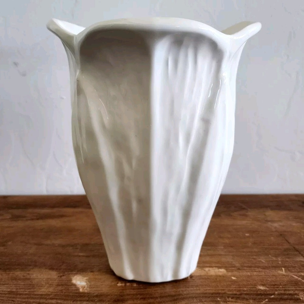 This is a vintage Haegar ceramic vase, number 808-24. The cream colored vase has a raised relief leaf pattern and is reminiscent of art deco style decor.
