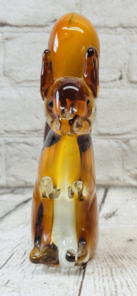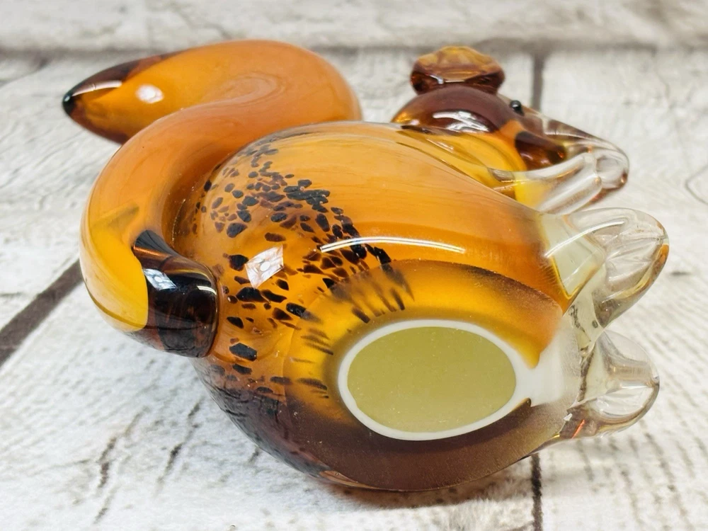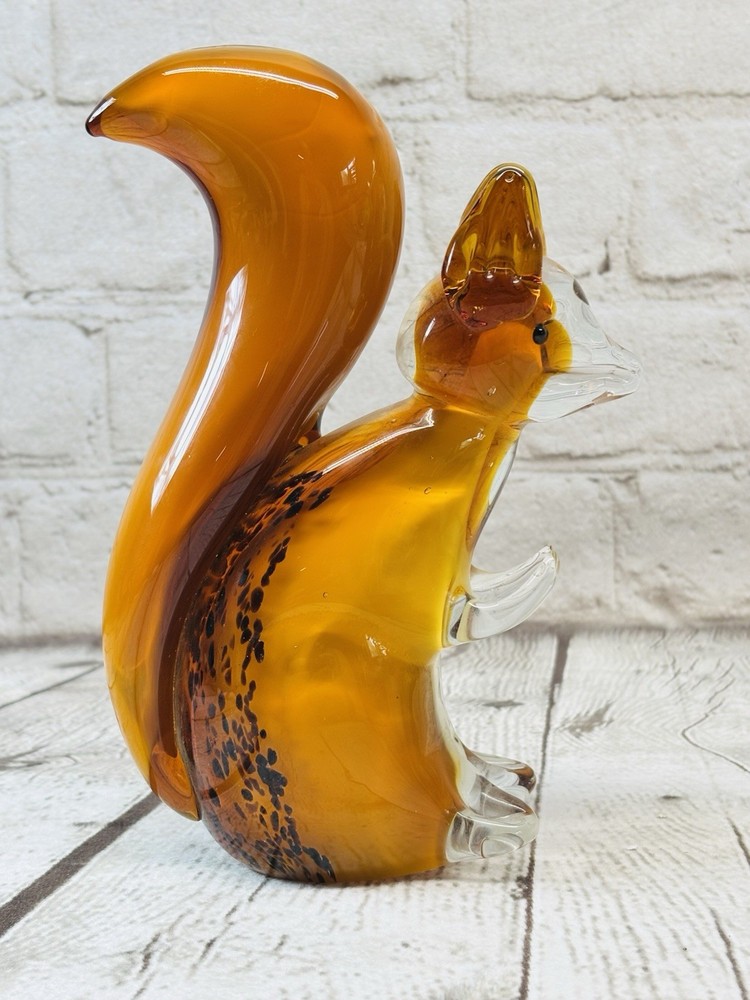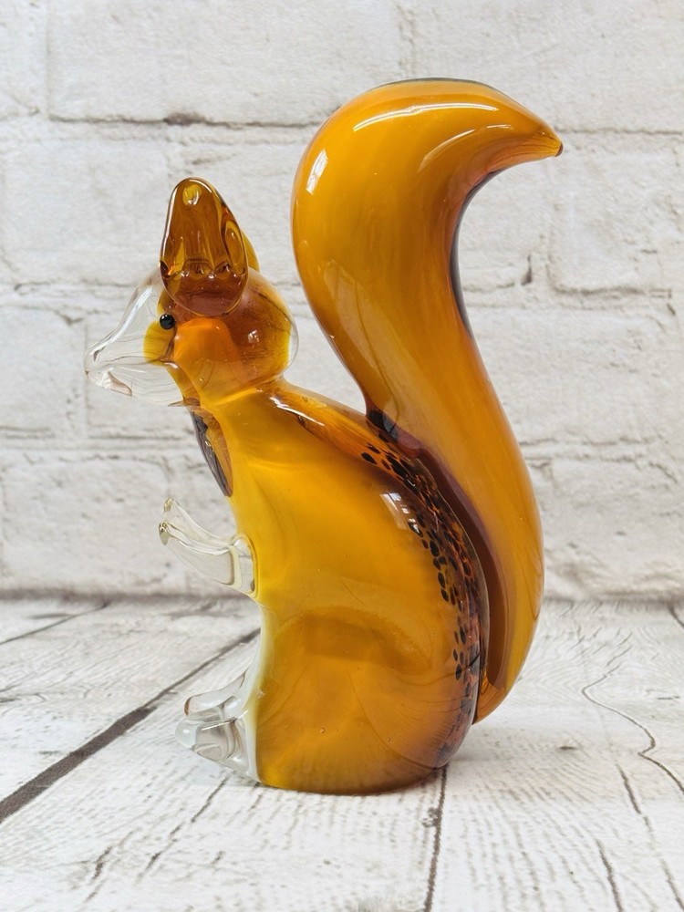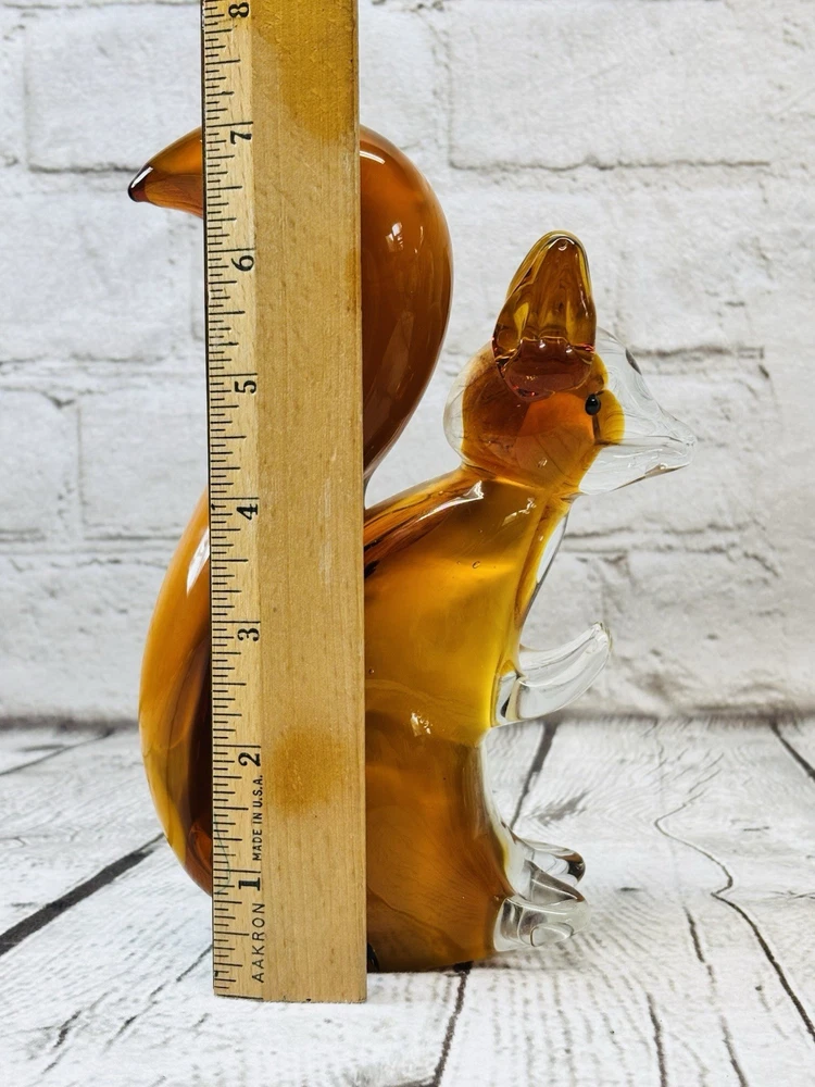 Vintage Hand Blown Art Glass Squirrel Figurine Amber Brown Clear 7” Animal Statue This charming hand blown glass squirrel figurine stands about 7 inches tall and features rich amber, brown, and clear tones with intricate detailing. A perfect collectible or accent piece for display, it showcases mid-century style craftsmanship and animal art appeal. •Type: Art glass figurine •Design: Squirrel with curled tail •Colors: Amber, brown, clear •Size: Approx. 7” tall x 4” deep x 2” wide •Material: Hand blown glass •Condition: Excellent with no chips or cracks •Style: Vintage decorative collectible Ships securely with care.