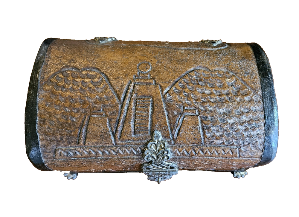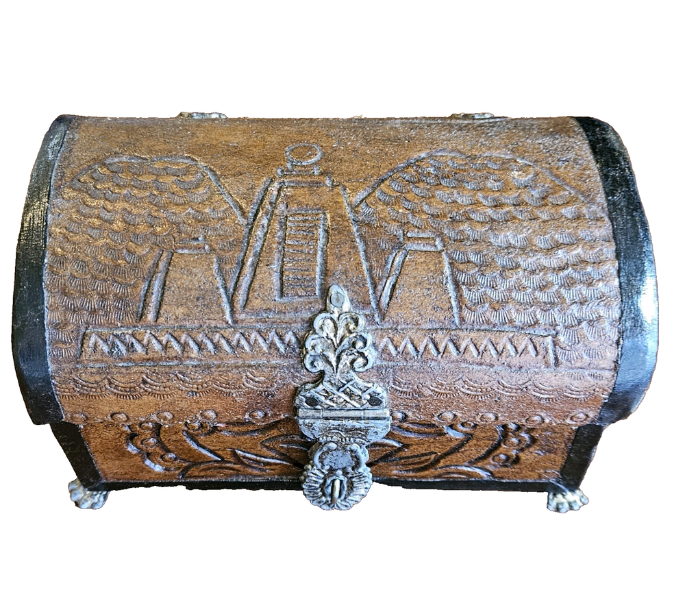 Vintage Wood Carved Treasure Box Footed Gandaberunda Vishnu Hindu Temple. Measures 7 x 4 x 4, lined with red felt.