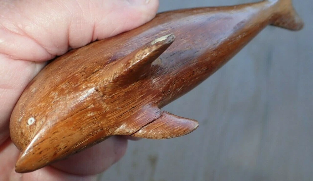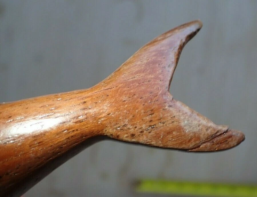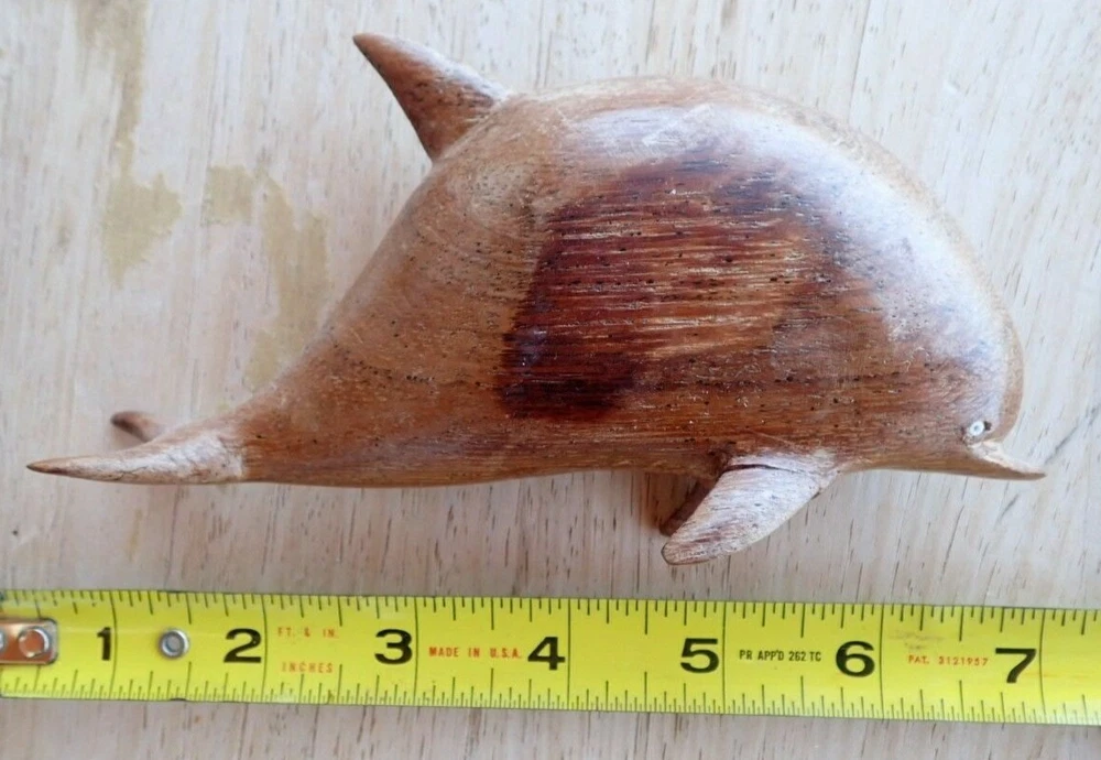 Add a unique touch to your collection with this vintage hand-carved hard wood dolphin sculpture figurine. Crafted by skilled artisans in Papua New Guinea, this piece showcases the beauty of wood carving. Measuring 6.5 inches in length, this figurine captures the essence of the dolphin's grace and elegance. The material used for this piece is wood, and it is considered a handmade item. This dolphin figurine is a great addition to any collection and is perfect for animal lovers. It is suitable for display in any room and makes for a thoughtful gift for any occasion. Vintage Hand Carved Hard Wood Dolphin Sculpture. small Mother of Pearl eyes. Figurine appx. 6.5" Long. Condition is "Used". Two small pieces of the fins had broken off and are glued back on. See photos. About 6.5" long x 2" wide appx. Carved from solid kwila wood. Shows some discoloration commensurate with age. I purchased this from a craftsman in Lae, Morobe Province for my private collection in the 1980s when I worked in PNG.