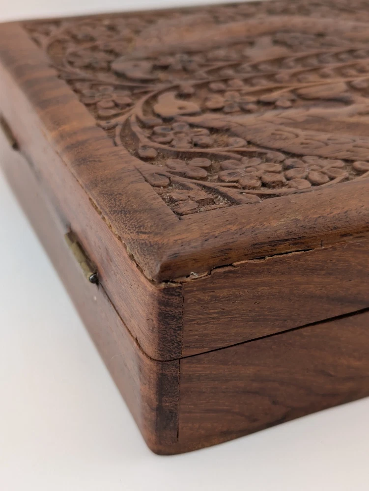HomeVintage Hand Carved Wood Wooden Box Made In India Trinket Jewelry Floral Peacock