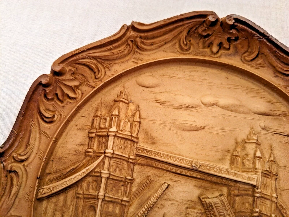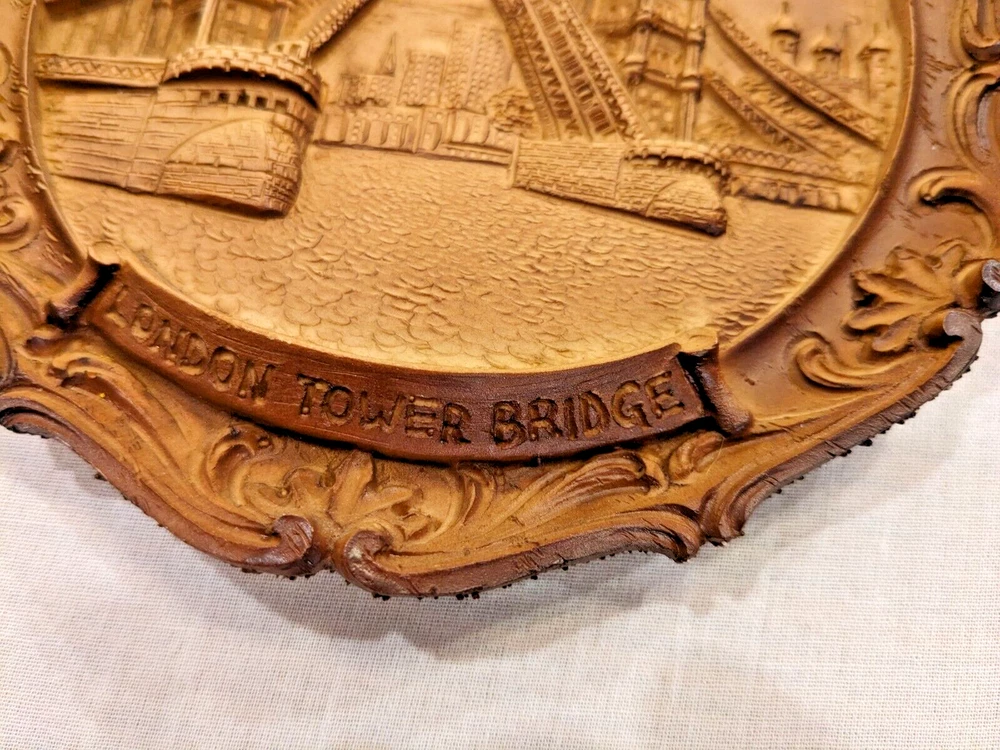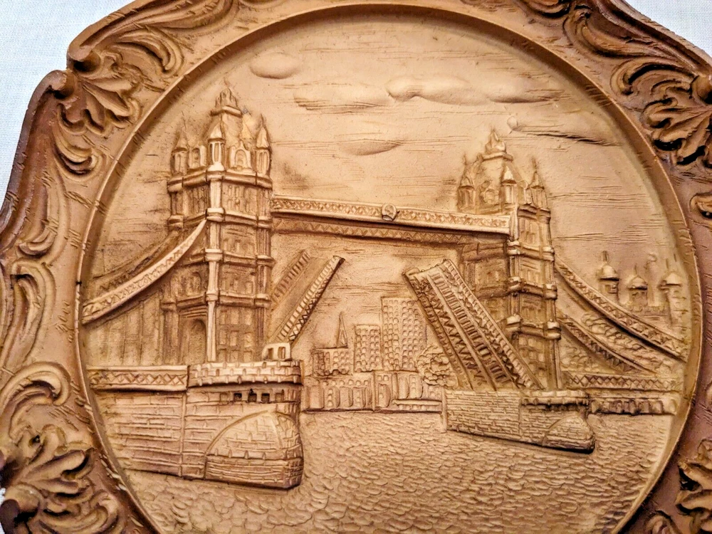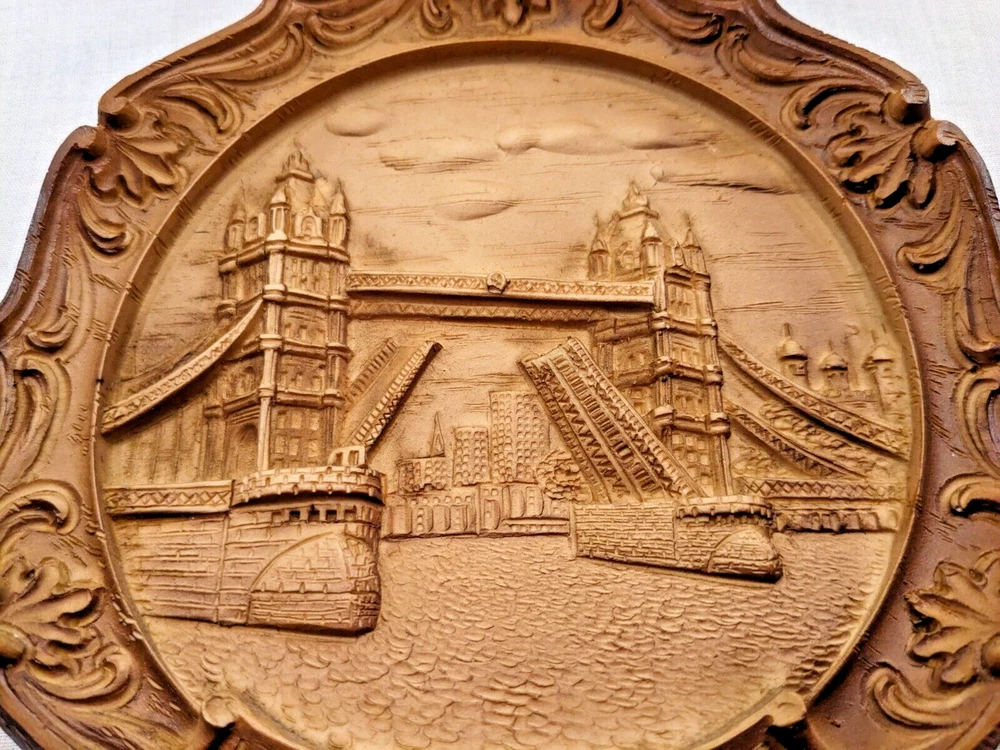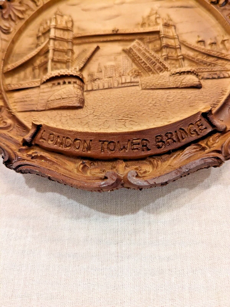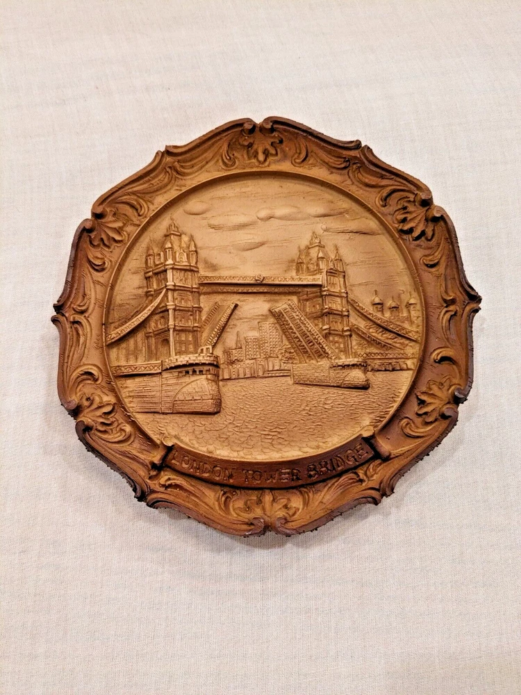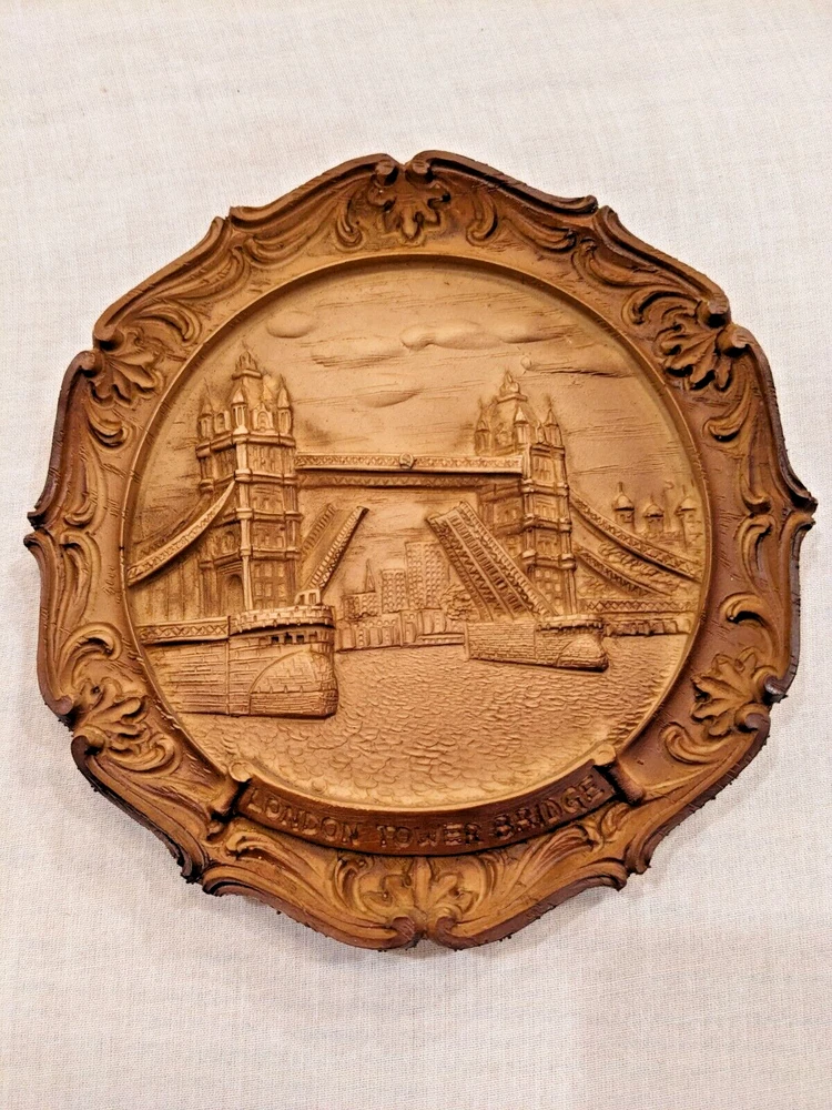 This is a vintage hand-carved wooden wall plaque with a diameter of 6 inches. The plaque features a round shape, brown color, and natural finish. It depicts the London Tower Bridge and has carvings on it. The plaque comes with the wall hanger already connected. Take a look at my Ebay store for more Vintage Collectibles,Home Decor, and Fashion Accessories/Clothing. Thank You and Happy Shopping!!!