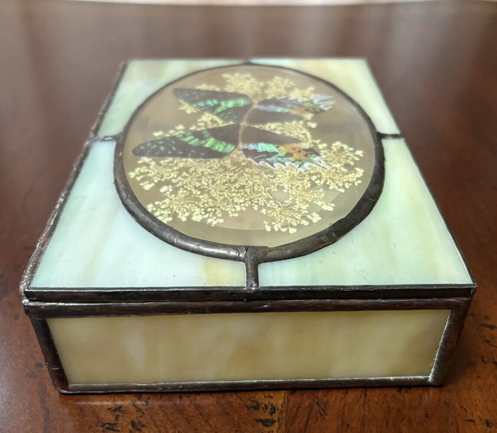 Beautifully hand-crafted jewelry box decorated with butterfly and pressed plants. It is in excellent condition. Measures ( approx.): 7" L, 5.25" W. It has the original sticker. Please see photos for more details. Please note that the item is vintage and may show signs of wear. We have done our best to honestly and accurately describe and photograph the item, including possible flaws. What you see are the actual photos of the item being sold. If you have any questions regarding the item, please ask! We DO NOT SELL outside United States. SHIPPING The item will be shipped within three business days after receipt of payment. We ship via USPS to any location within the 48 continental United States, NO INTERNATIONAL SHIPPING. Shipping is calculated by EBAY based on the weight and size of the item plus packaging. We can combine shipping in case you buy multiple items that can be safely shipped together. Thanks for looking!
