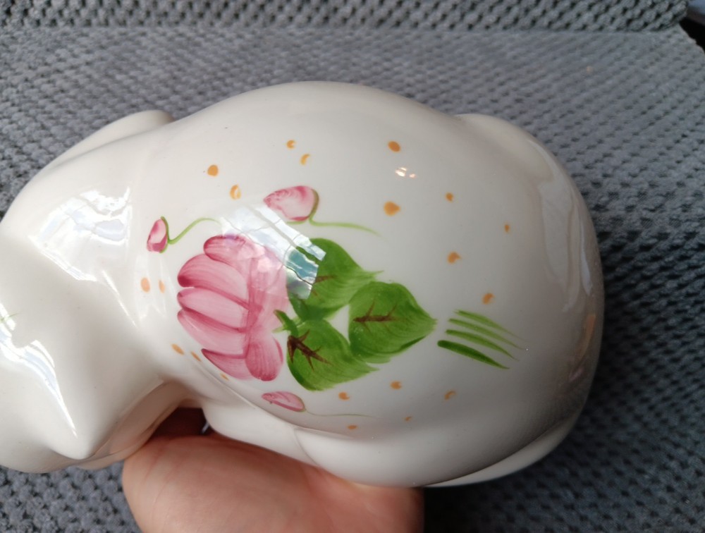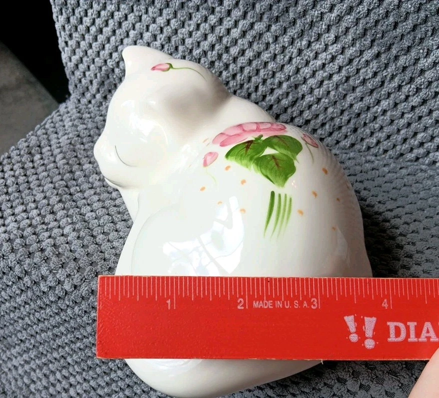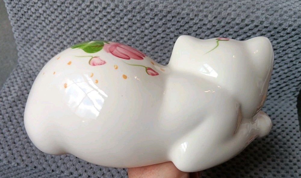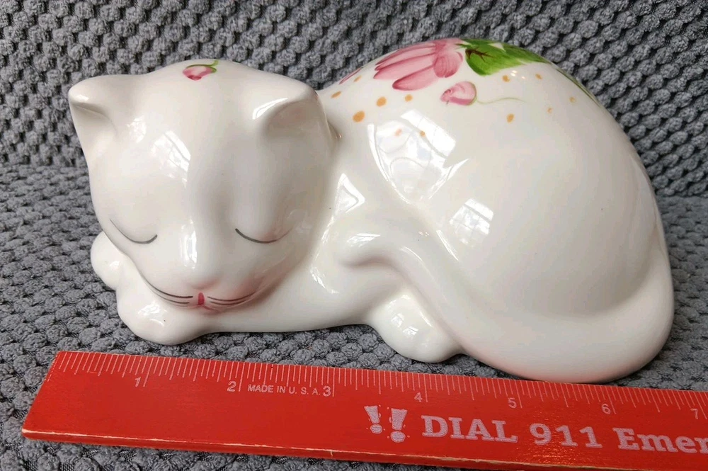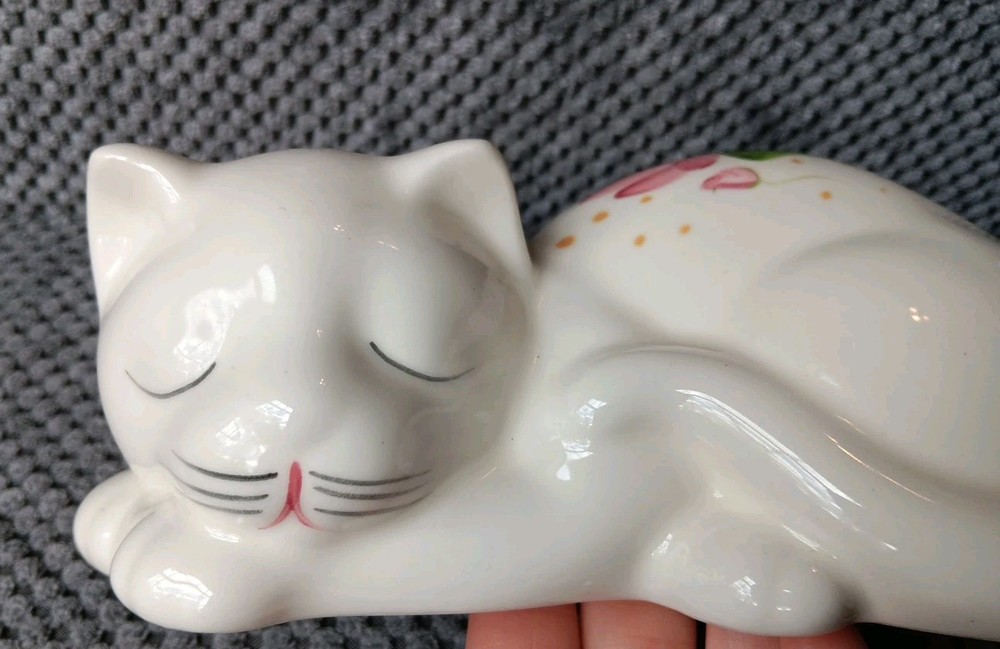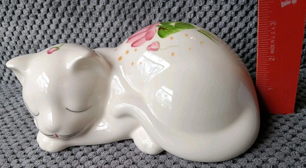 Sweet little sleeping kitty with handpainted pink flowers. It's appropriately 6 " in length. Please message me for additional photos or information.