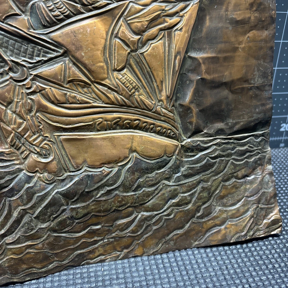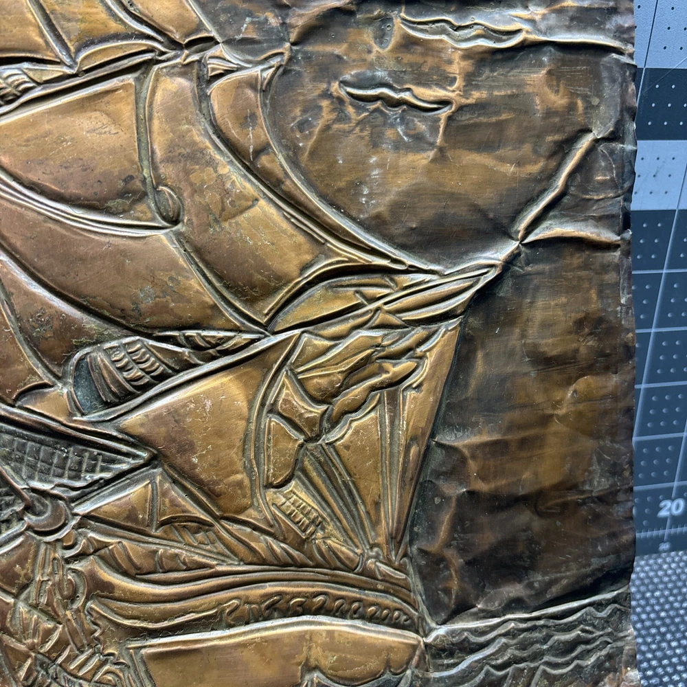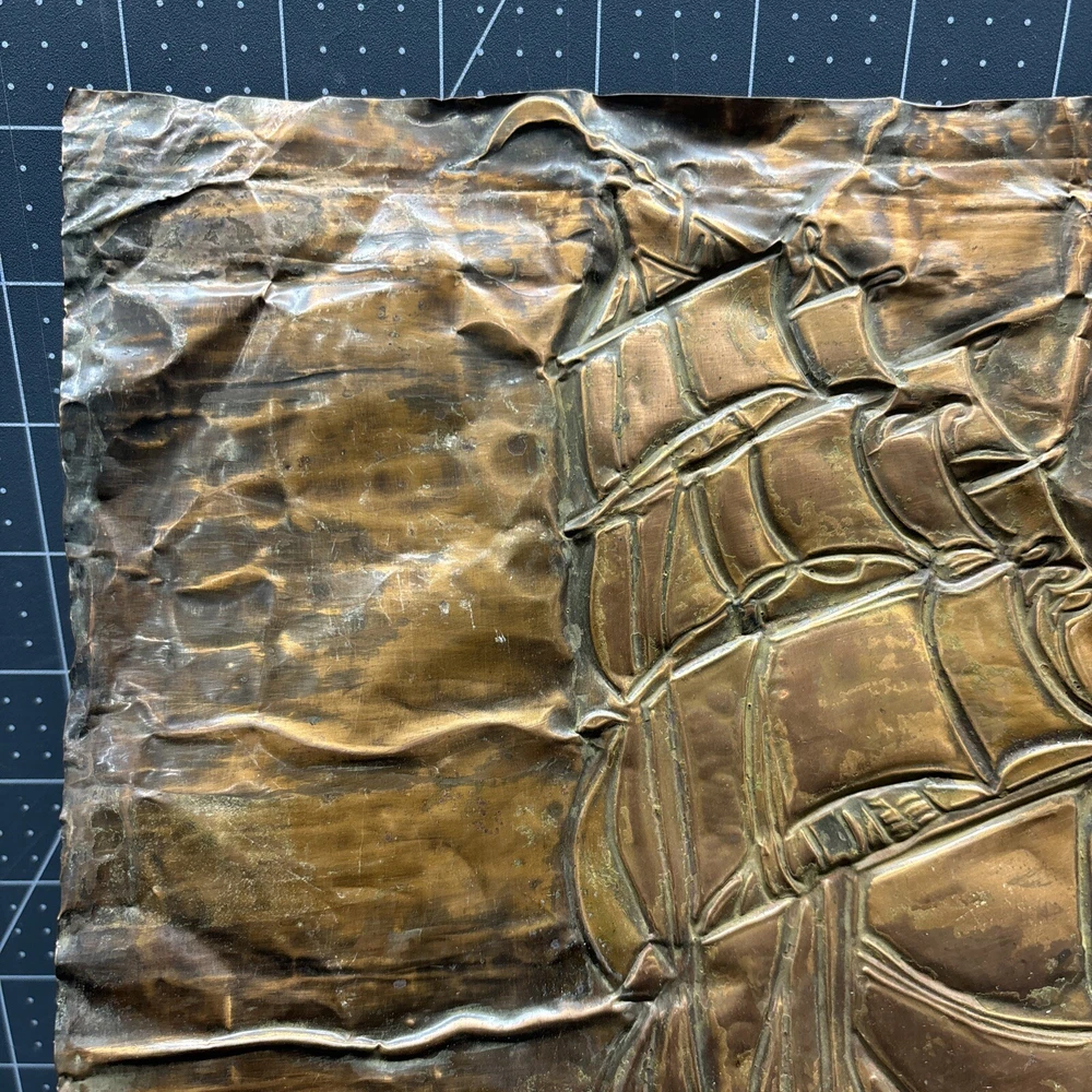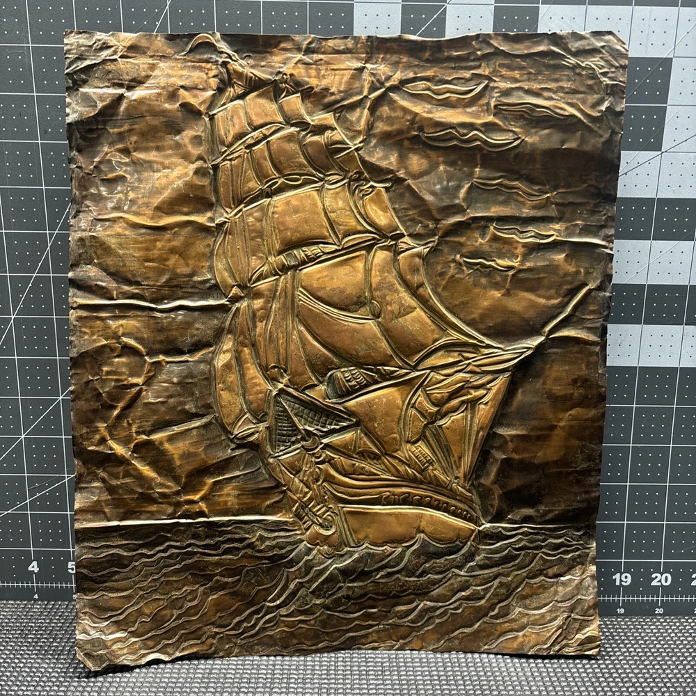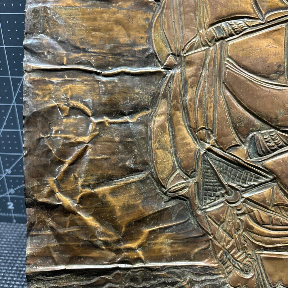 This vintage copper art piece features a beautifully detailed hammered and engraved etched design of a sailing ship. The intricate details of the ship's hull, sails, and crew make it a true masterpiece. Crafted from high-quality copper, this piece is sure to last for years to come. The unique hammered and engraved etched design of this piece makes it a one-of-a-kind addition to any collection. Whether you're a collector of metalware or just appreciate the beauty of vintage art, this piece is sure to impress. Add it to your collection today and enjoy the intricate details of this stunning sailing ship.