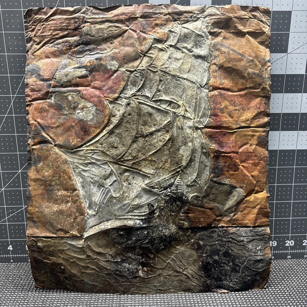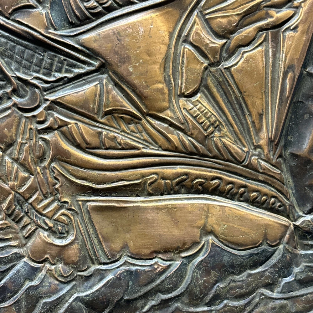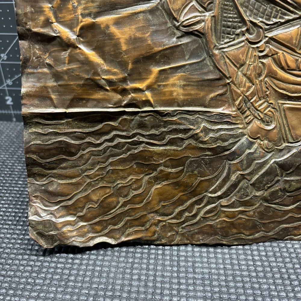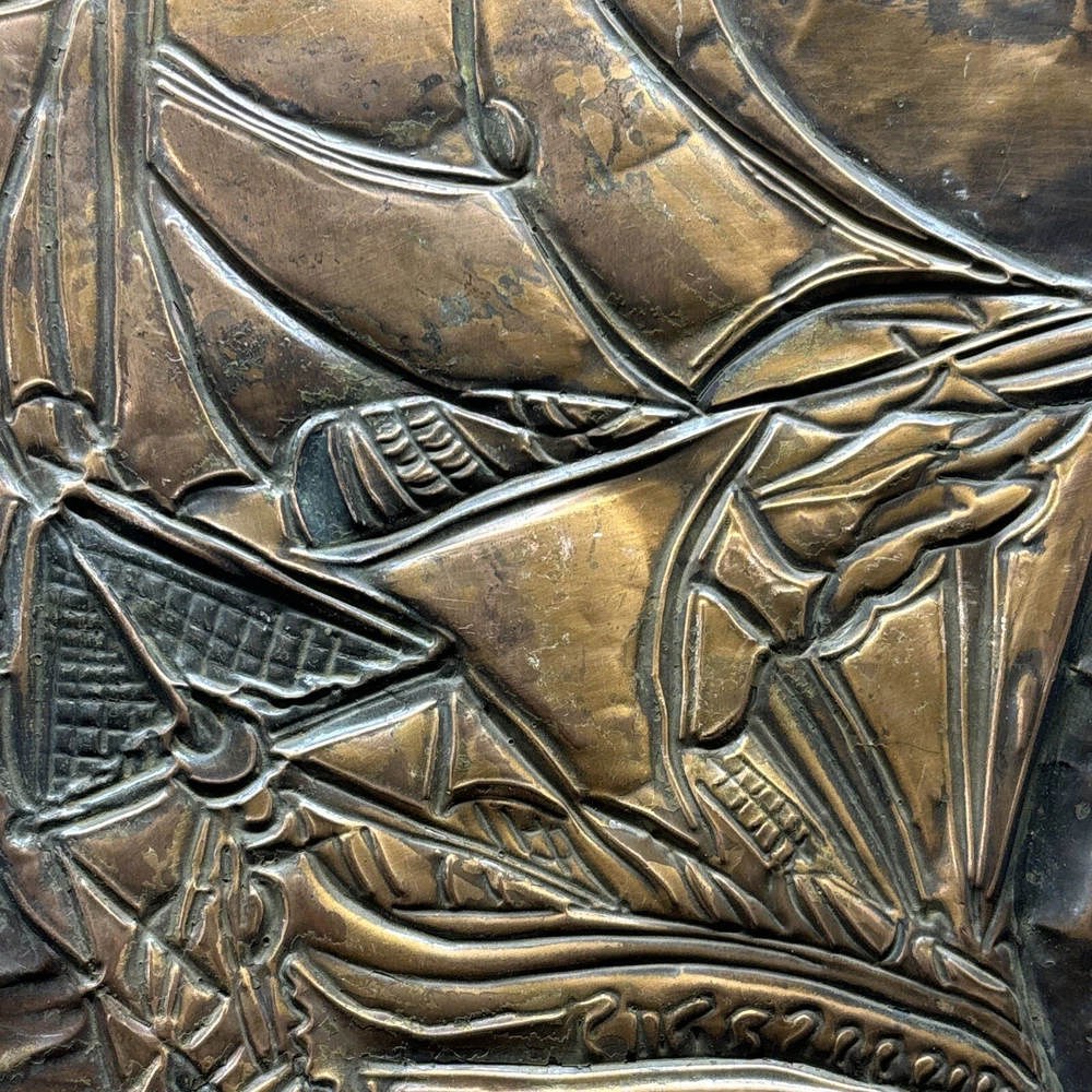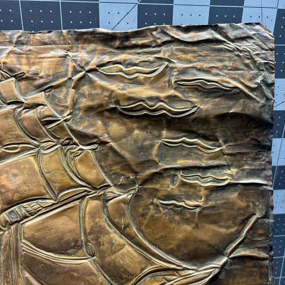 This vintage copper art piece features a beautifully detailed hammered and engraved etched design of a sailing ship. The intricate details of the ship's hull, sails, and crew make it a true masterpiece. Crafted from high-quality copper, this piece is sure to last for years to come. The unique hammered and engraved etched design of this piece makes it a one-of-a-kind addition to any collection. Whether you're a collector of metalware or just appreciate the beauty of vintage art, this piece is sure to impress. Add it to your collection today and enjoy the intricate details of this stunning sailing ship.